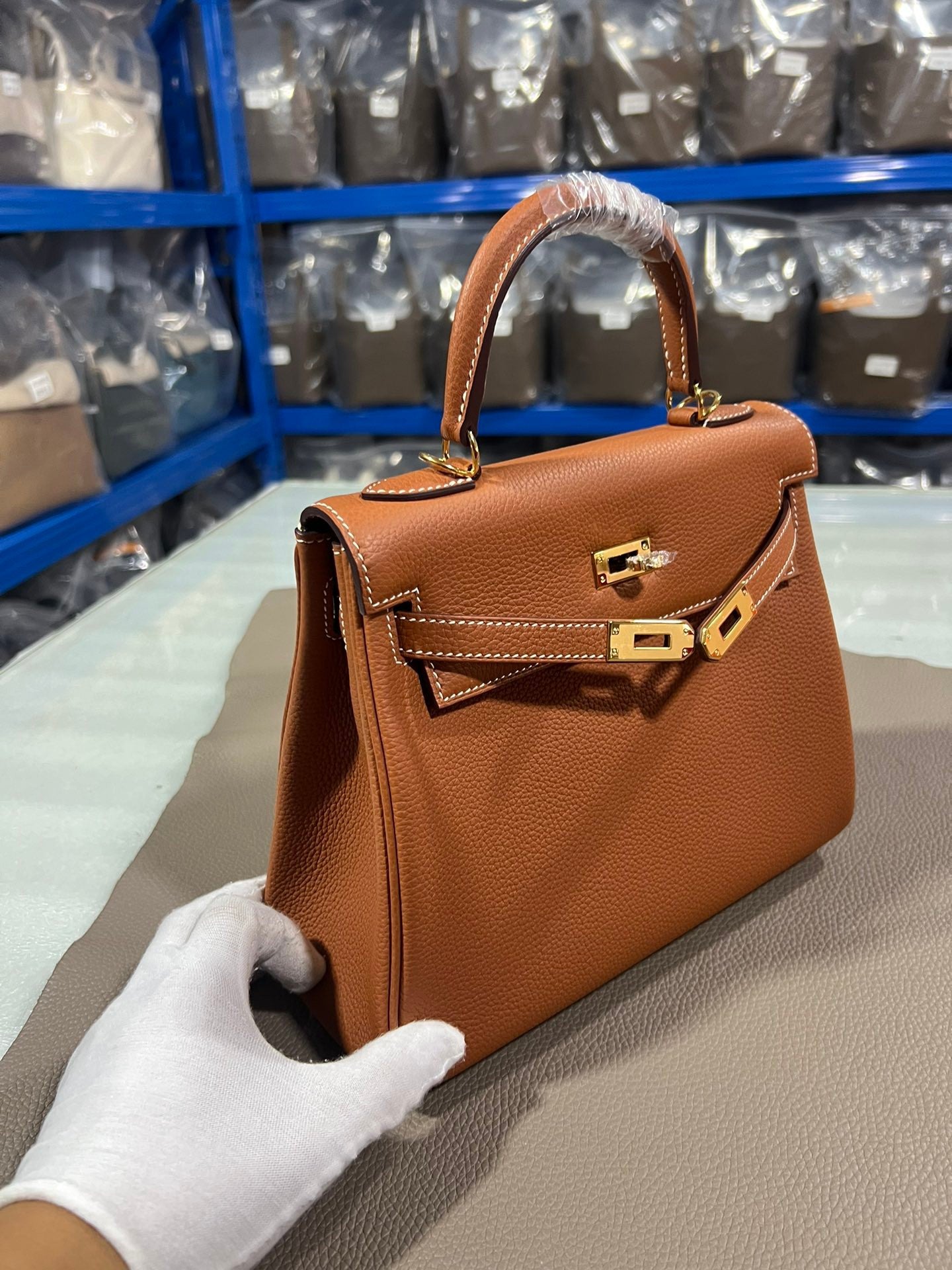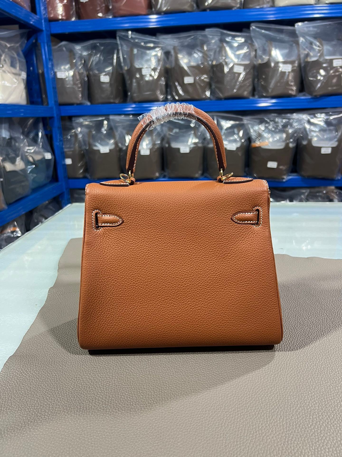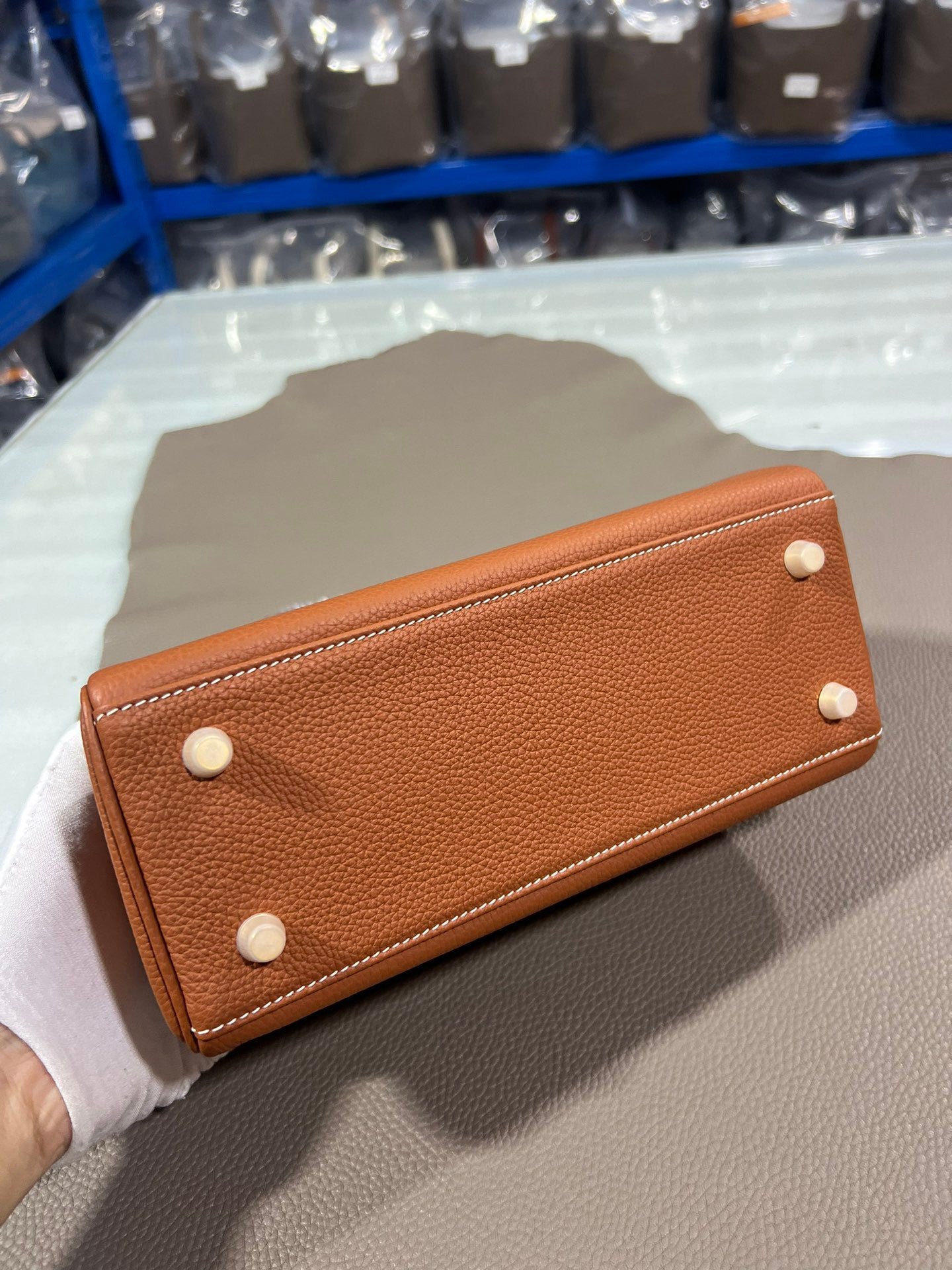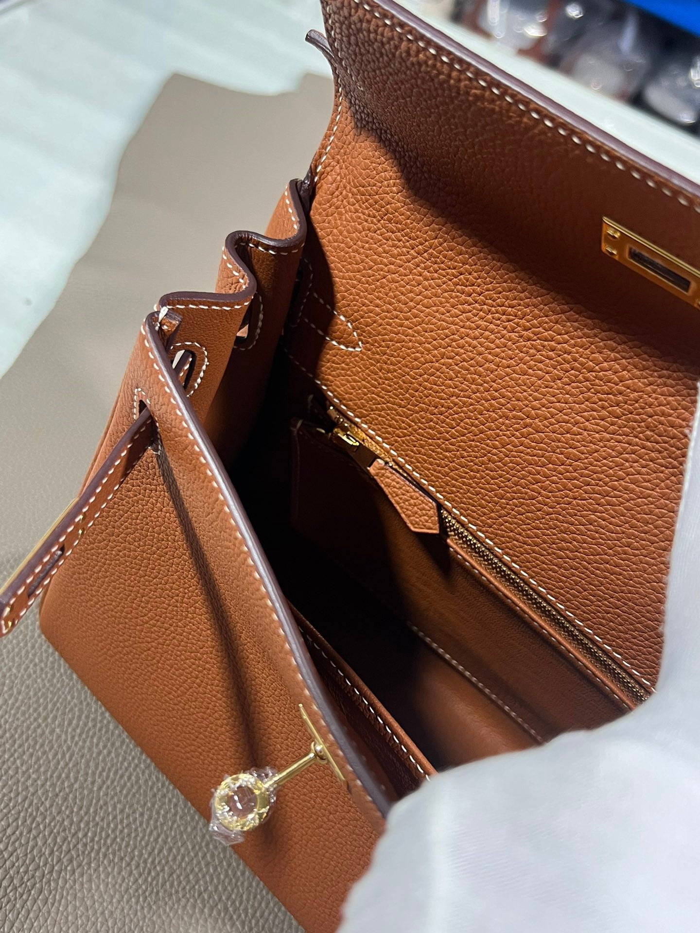 The Kelly bag in the 25cm inner-seam style from the workshop, in golden brown color with silver buckles, made of Togo leather.