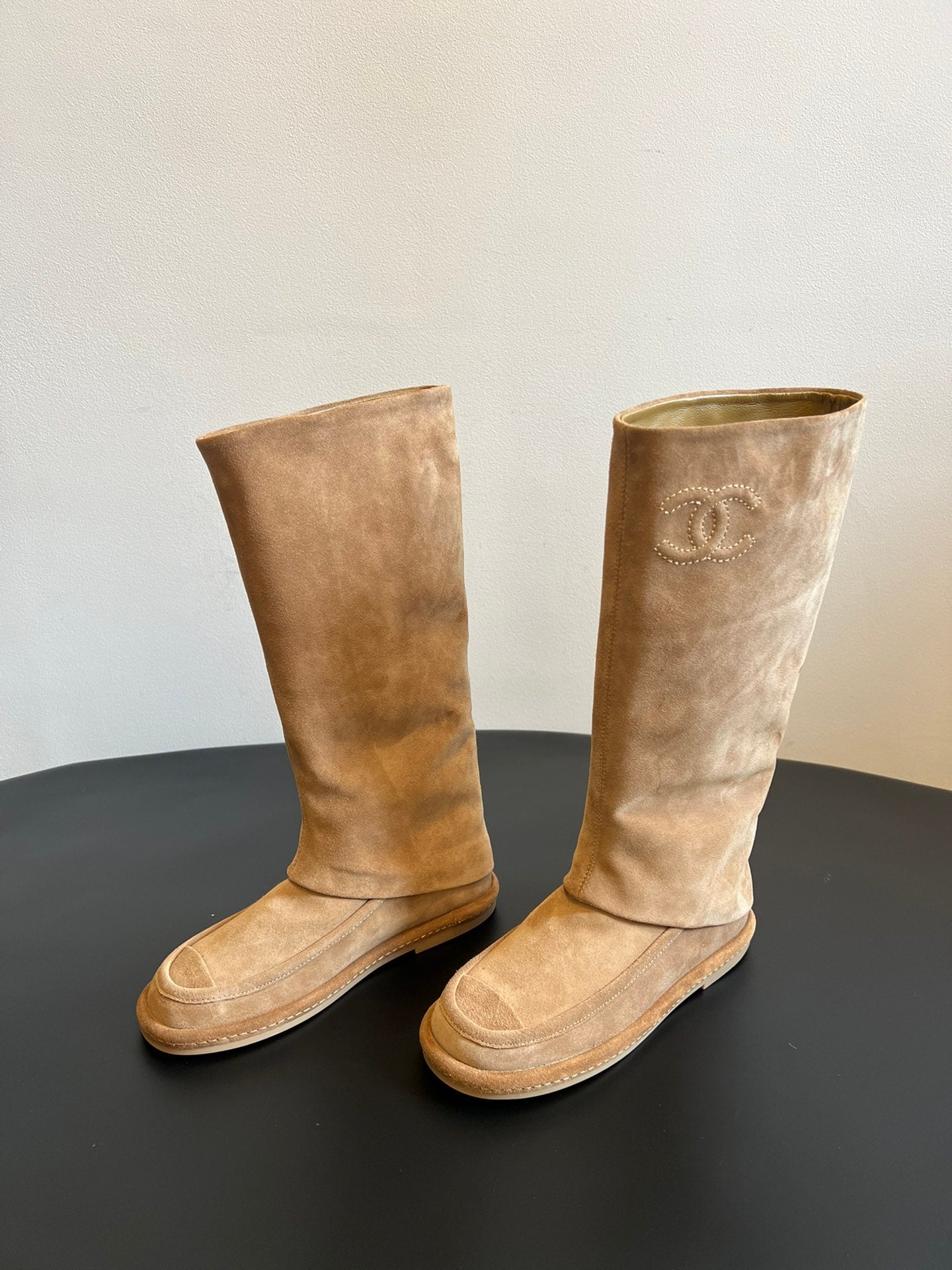 Crafted from soft suede with a vintage matte finish, these boots enhance the look of luxury. The iconic Chanel Double C logo is embroidered on the side, creating a simple yet recognizable brand identity. The boots feature a straight, loose fit that accommodates a wide range of leg shapes, while the sleek toe and heel design minimizes bulk.