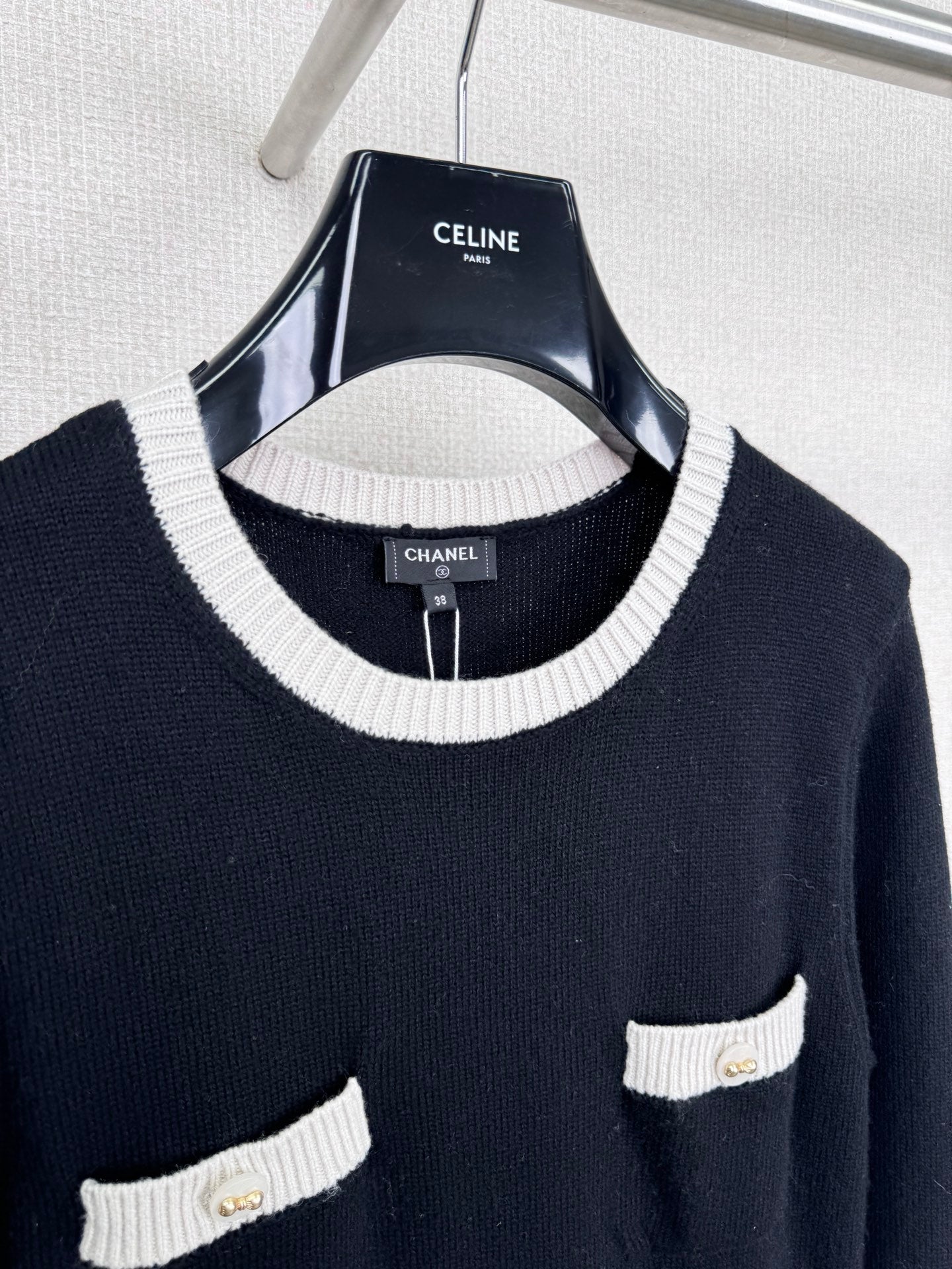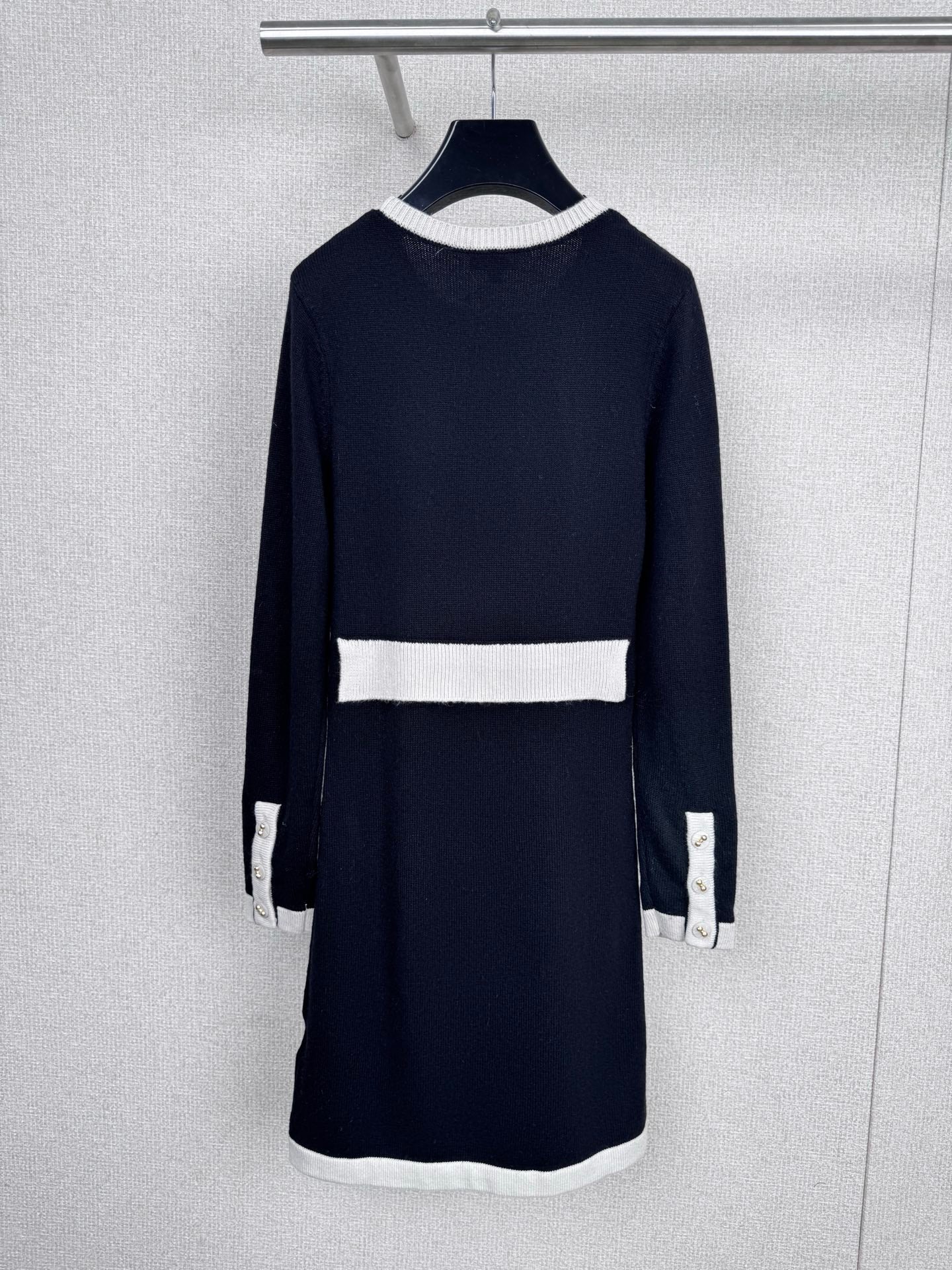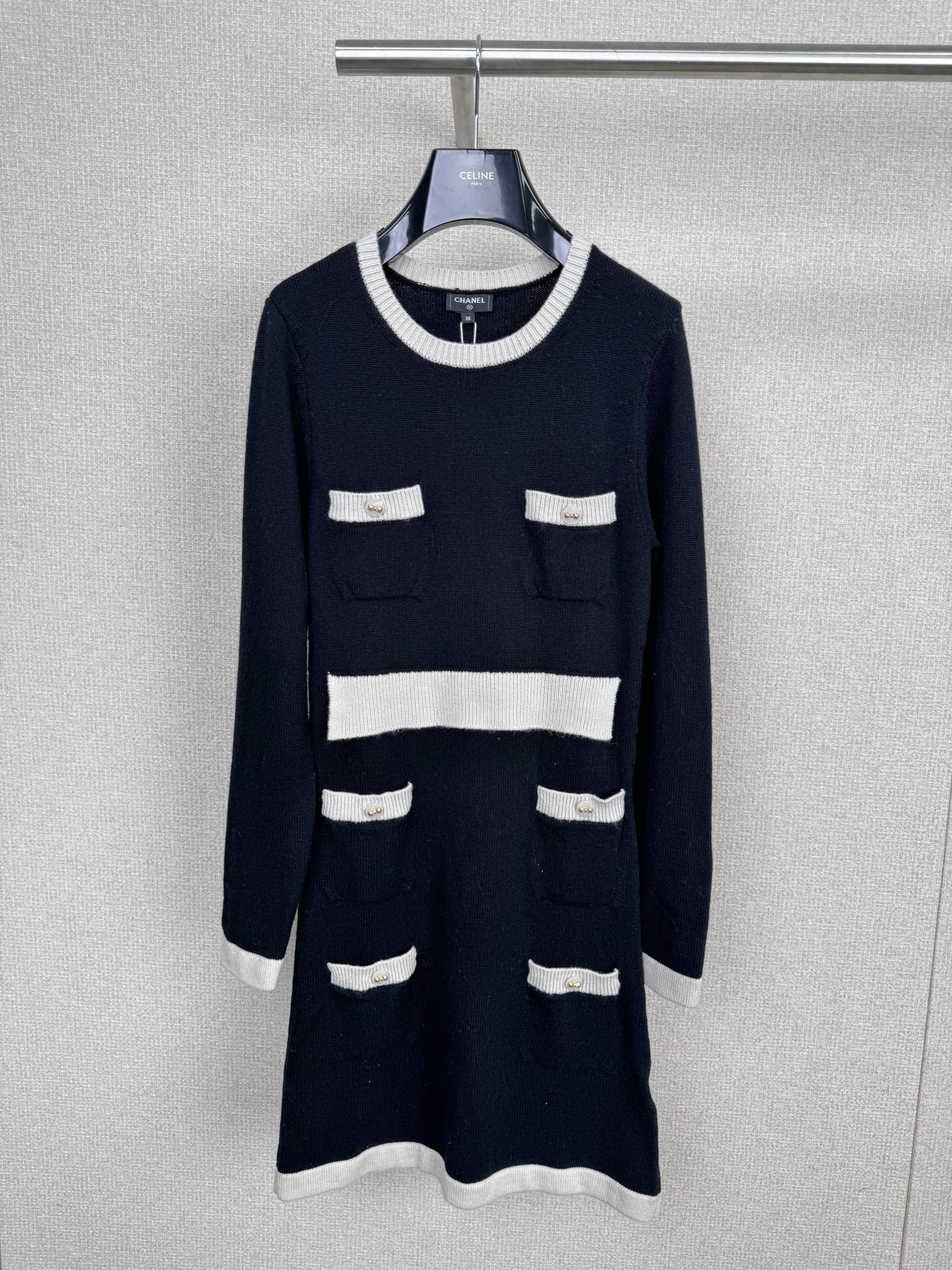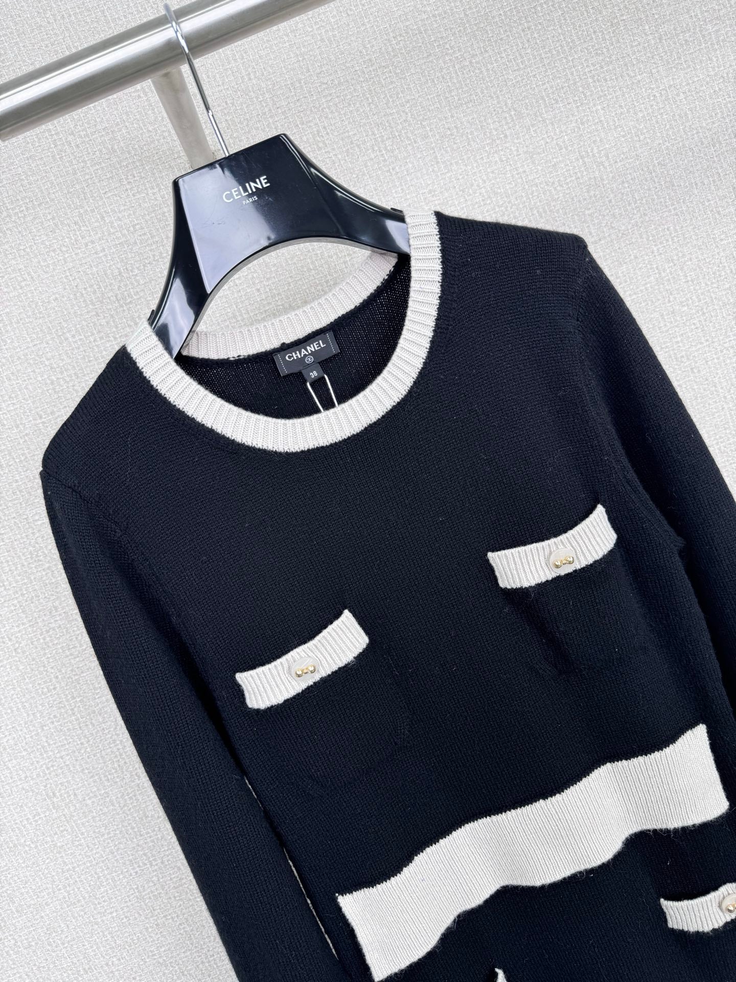 Chanel's new Fall/Winter 2025 black and white knit skirt. This Chanel 25K series black and white knit skirt features a classic contrasting design with off-white and black trims, embodying French elegance. The soft and delicate knit fabric forms a close-fitting silhouette, while the cuffs and pockets are accented with metal buttons for a touch of detail. The loose hem makes it incredibly comfortable for fall and winter, perfect for wearing alone or layered with a jacket. It offers a relaxed yet sophisticated look, perfect for commuting or relaxing, and effortlessly captures Chanel's effortless sophistication. Sizes S-M-L