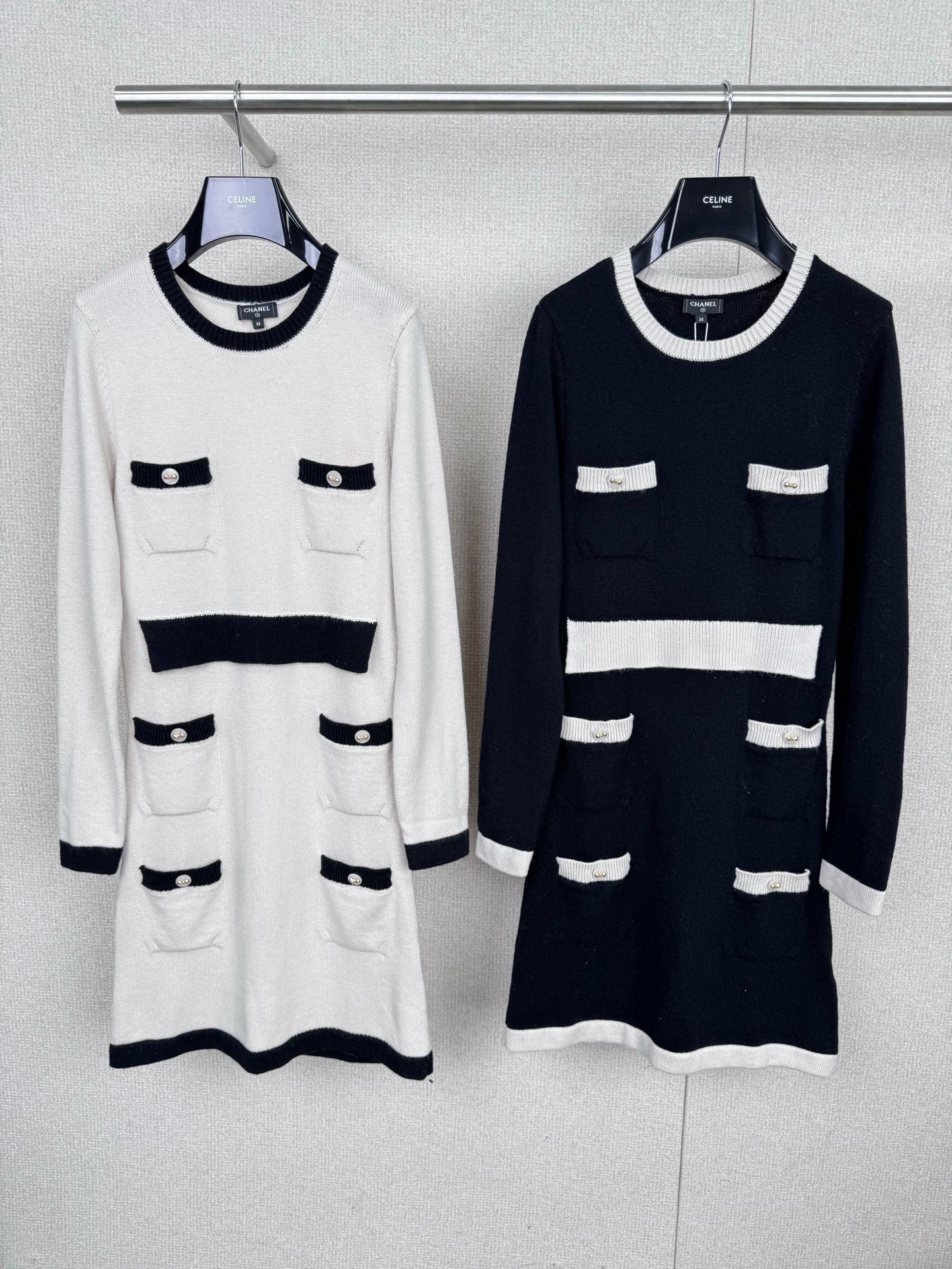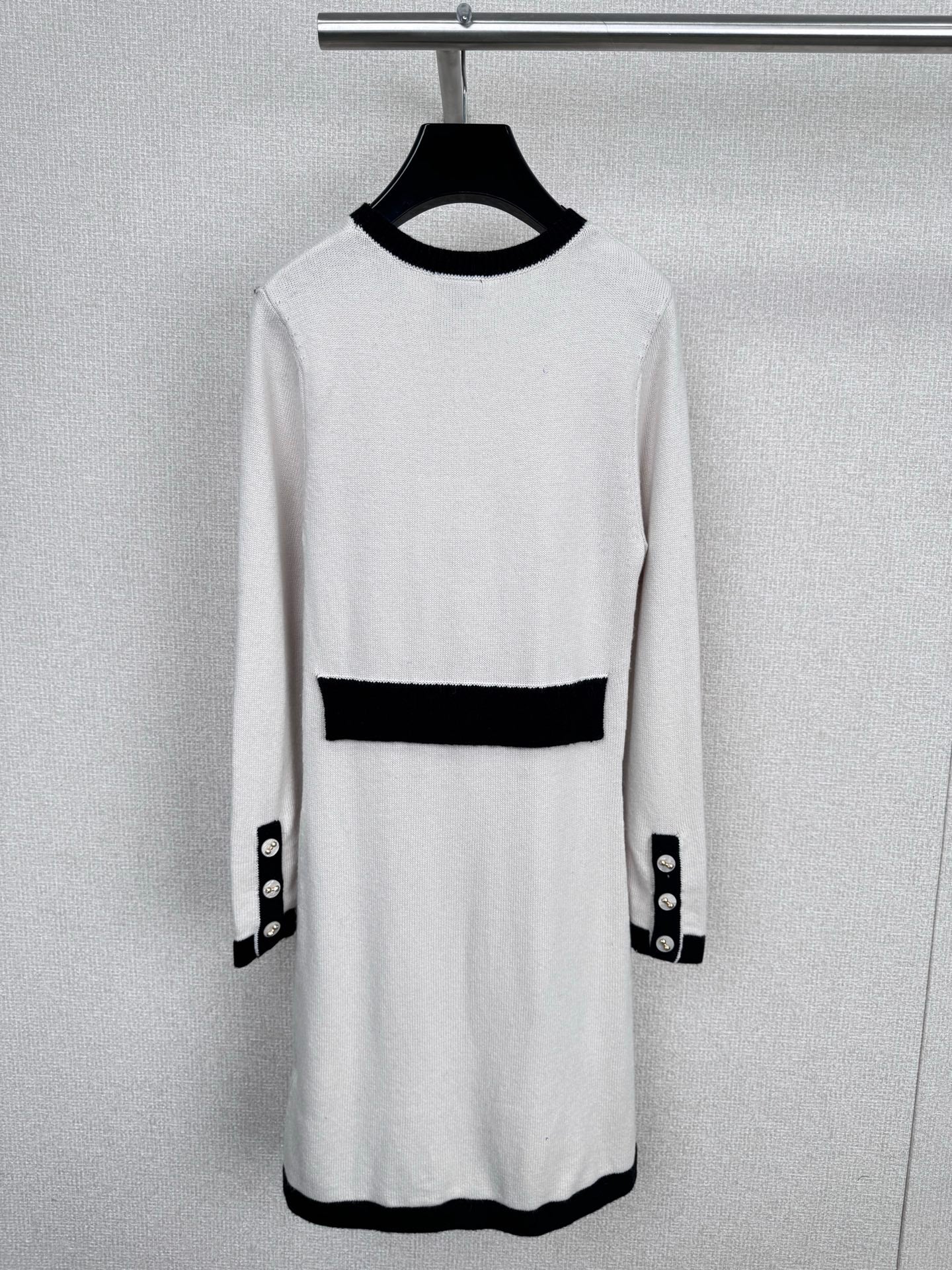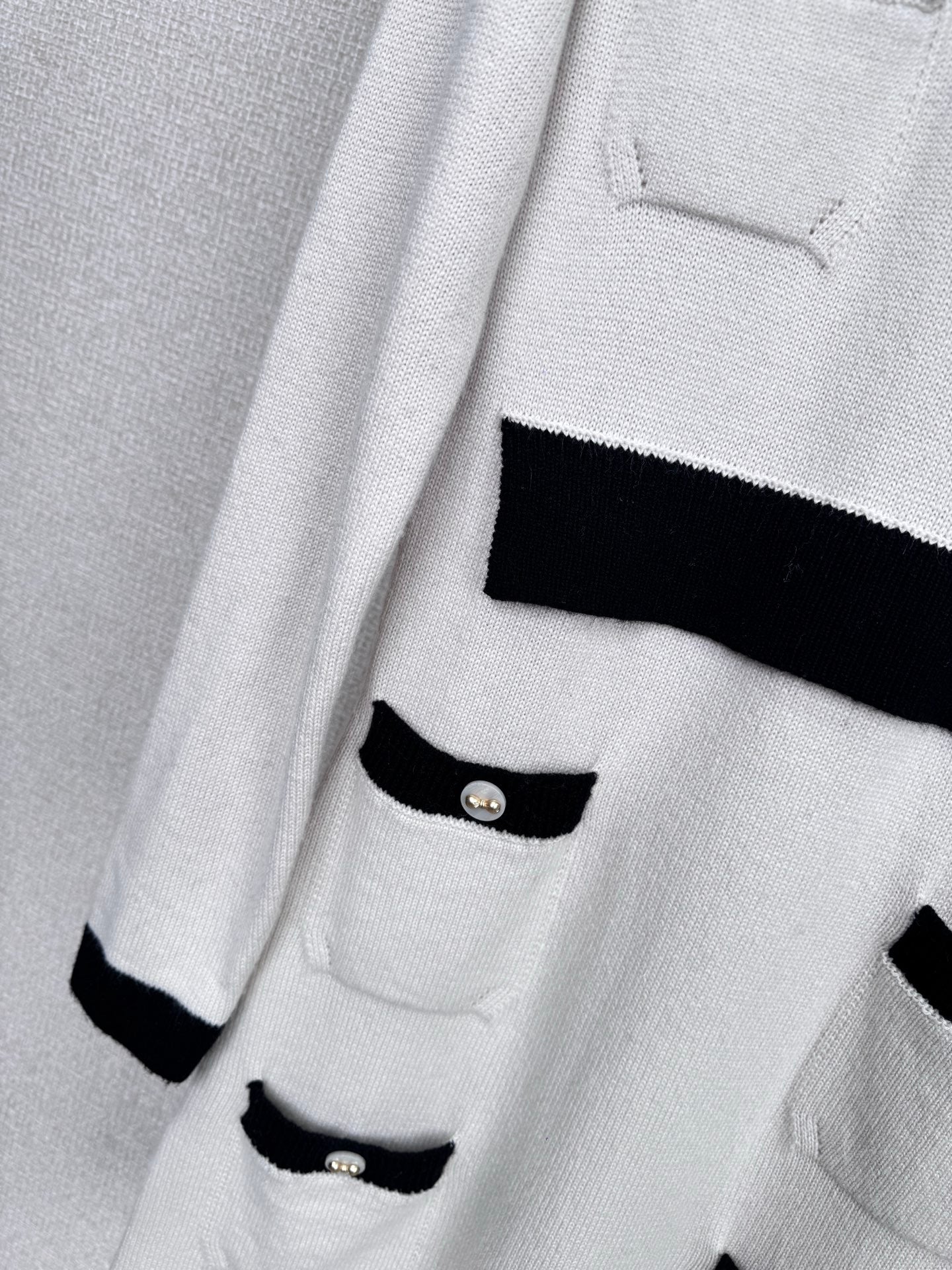 Chanel's new Fall/Winter 2025 black and white knit skirt. This Chanel 25K series black and white knit skirt features a classic contrasting design with off-white and black trims, embodying French elegance. The soft and delicate knit fabric forms a close-fitting silhouette, while the cuffs and pockets are accented with metal buttons for a touch of detail. The loose hem makes it incredibly comfortable for fall and winter, perfect for wearing alone or layered with a jacket. It offers a relaxed yet sophisticated look, perfect for commuting or relaxing, and effortlessly captures Chanel's effortless sophistication. Sizes S-M-L