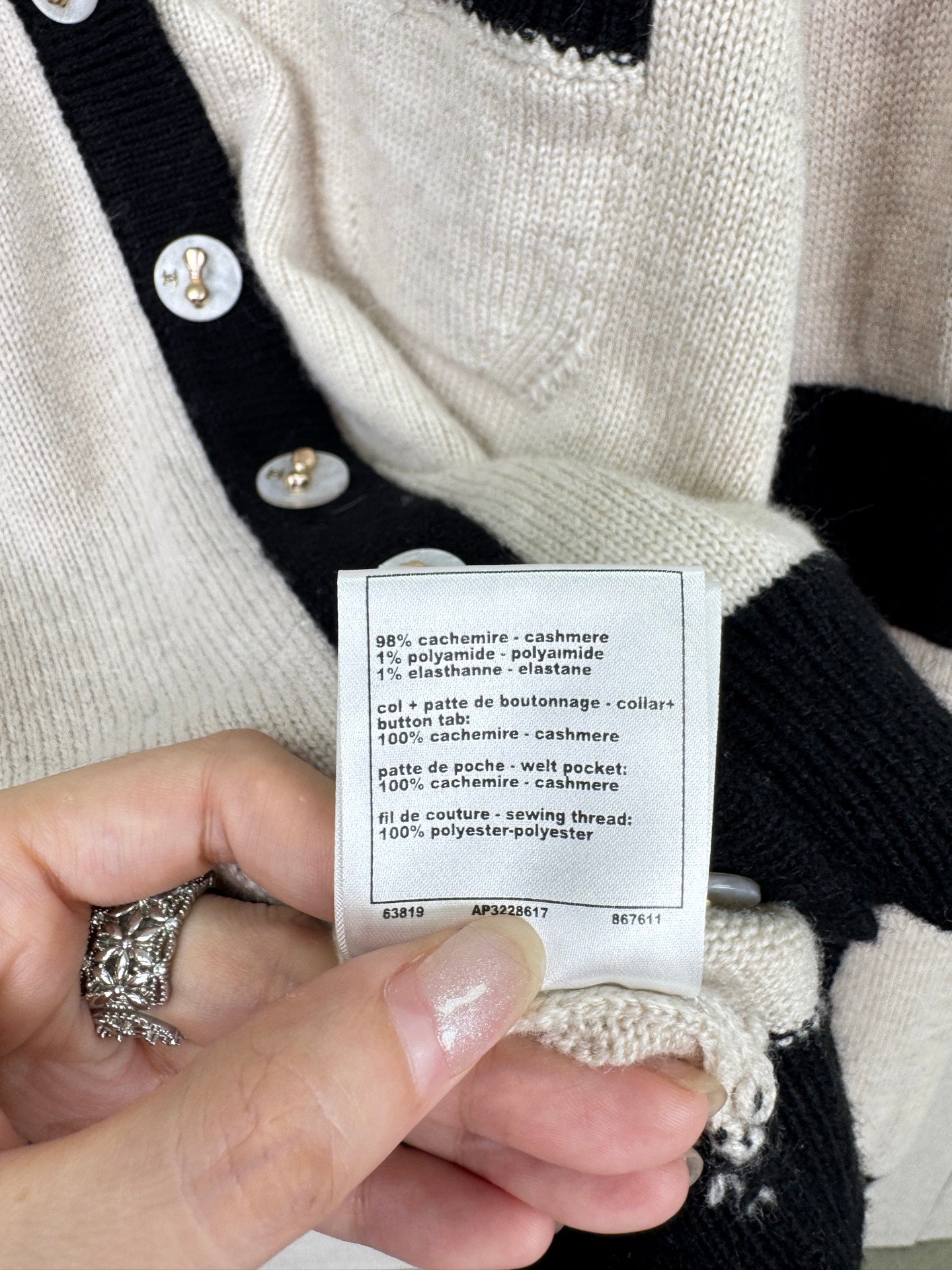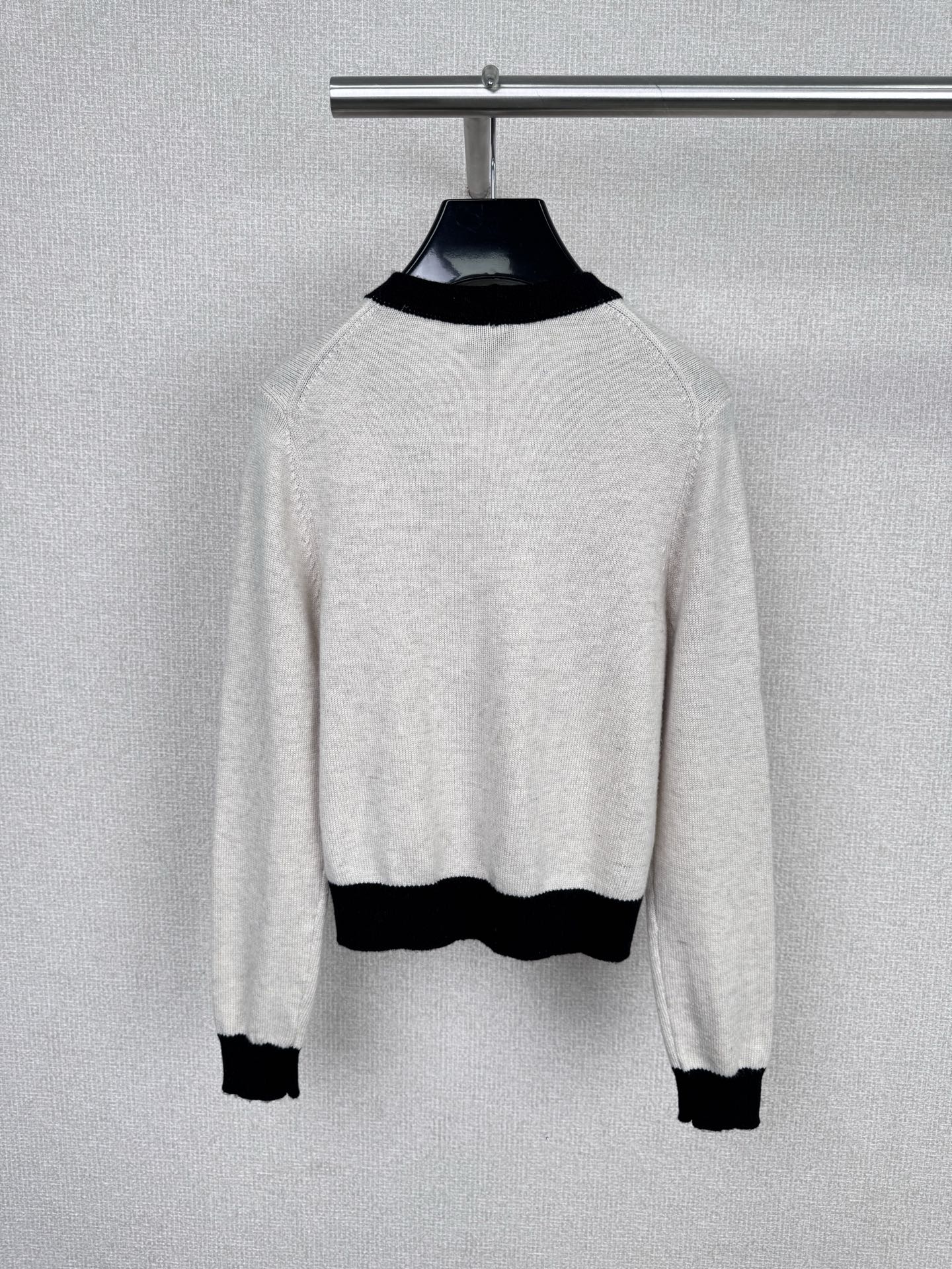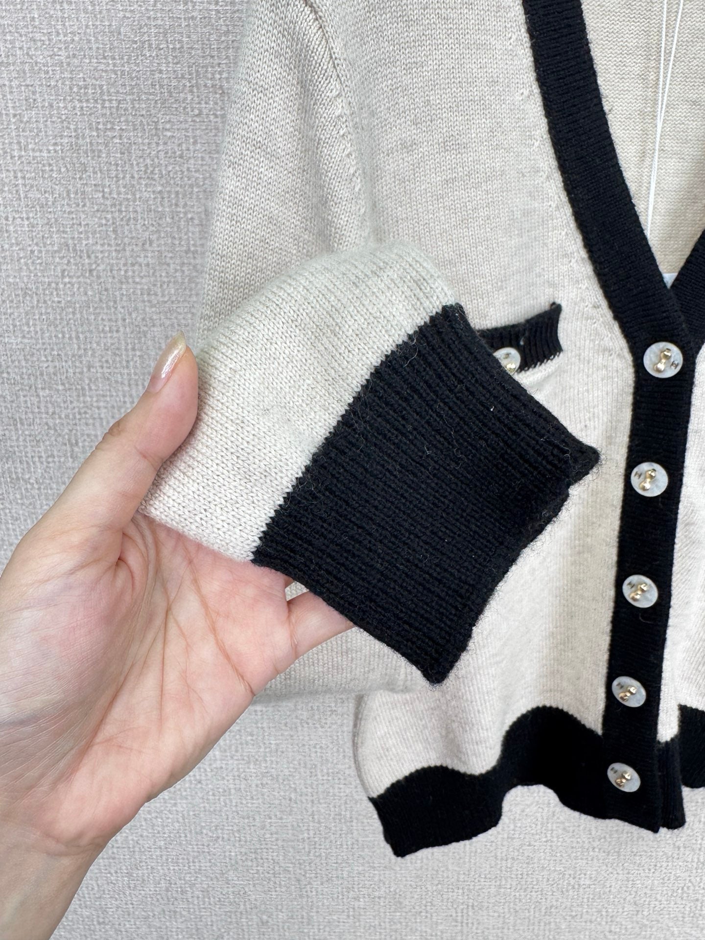 Chanel 2025 Chanel-inspired knitted cardigan features a contrasting off-white and black design, a V-neck, custom buttons, and detailed double-C badges and contrasting pockets. This cardigan is simple yet sophisticated, made from high-quality, soft, and delicate knit fabric, making it incredibly comfortable for fall and winter. The contrasting metal buttons and cuffs create a slimming and elegant look, perfect for commuting or a date. Pair it with cropped pants or a skirt for a truly stylish look. Sizes S-M-L