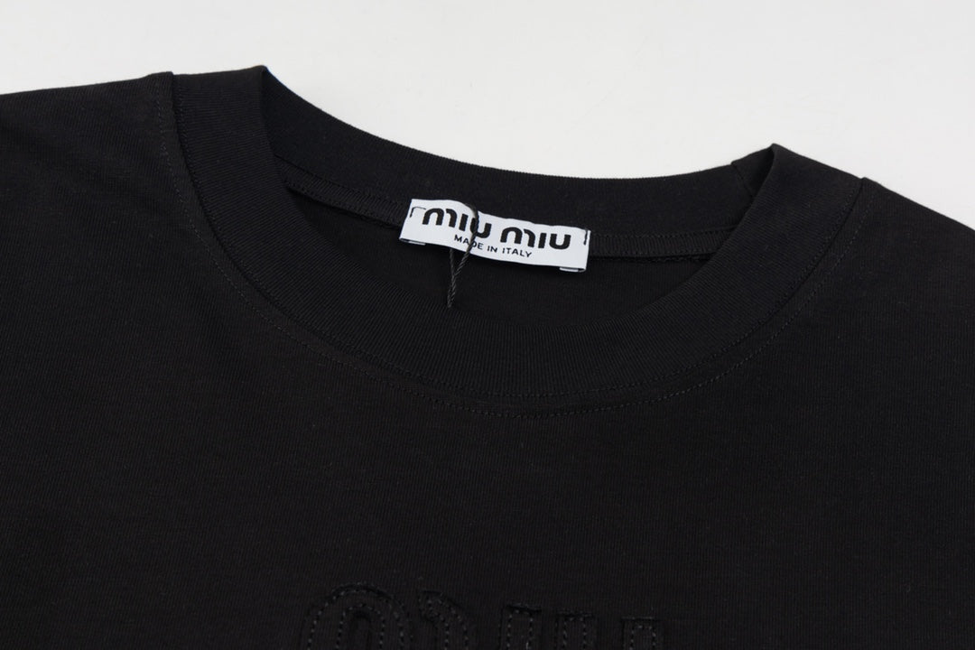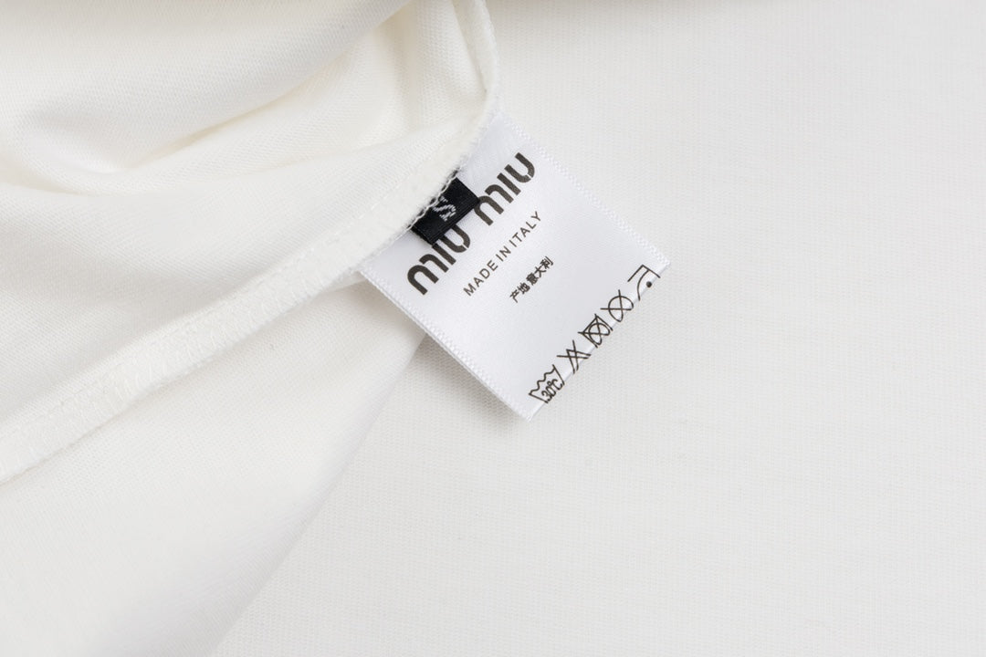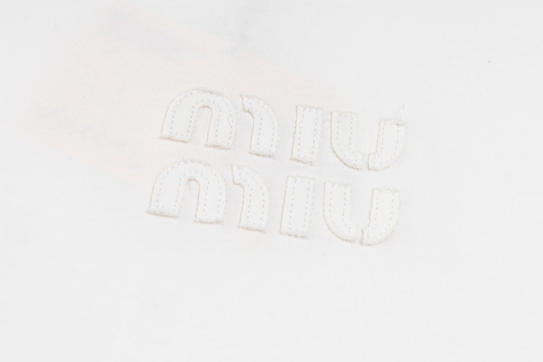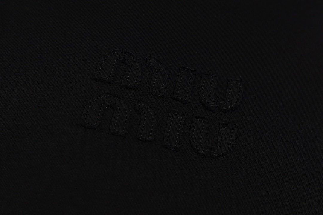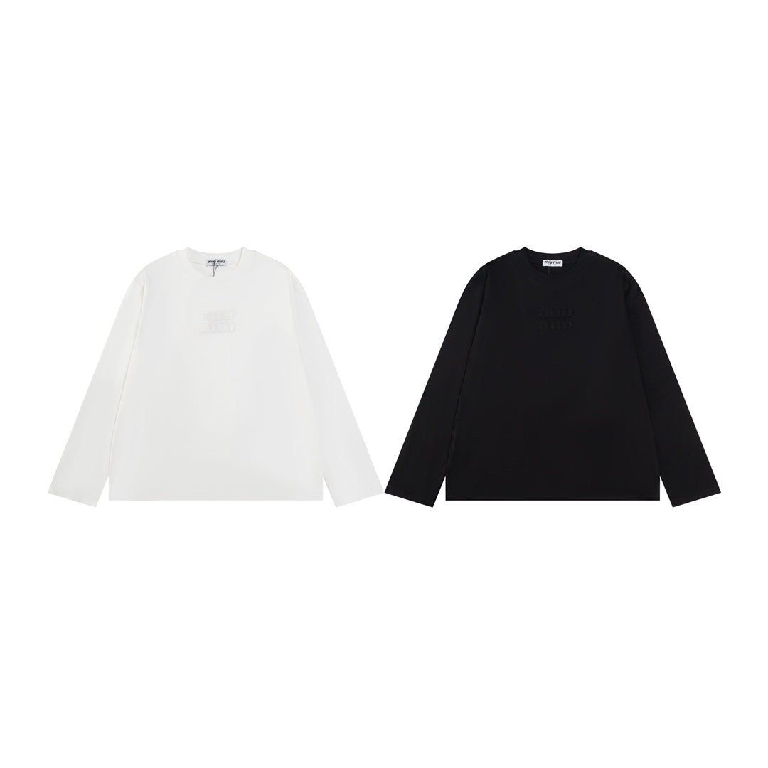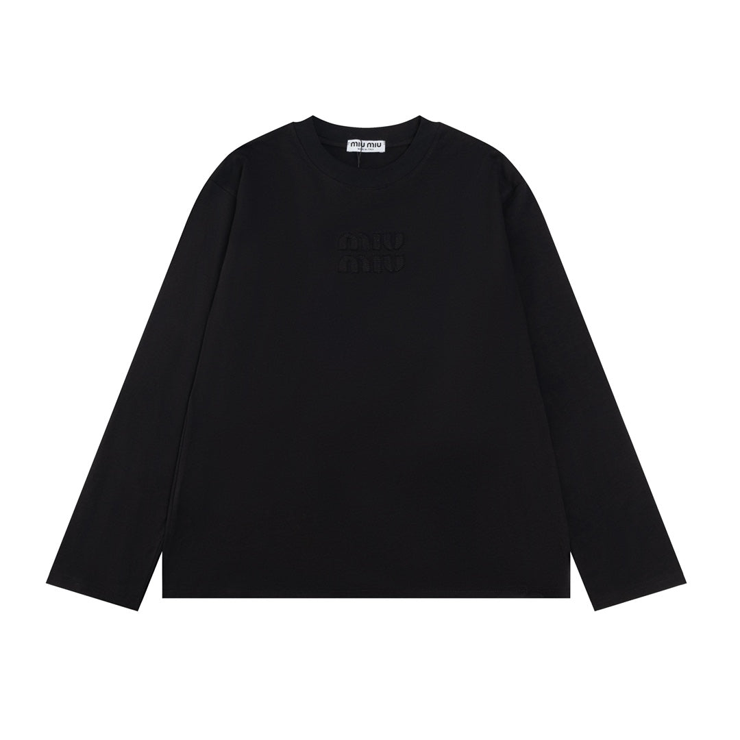 24SS Spring/Autumn new Miu Miu solid color round neck appliqué logo embroidered long sleeves. Perfect for both spring and autumn, this T-shirt looks stylish worn alone or as a base layer. It's suitable for both slender and slim figures. The slightly dropped shoulder sleeves don't make shoulders appear wide at all. The midi-length design makes it perfect for shorter women, perfect for layering with leggings. It's a must-have layering piece this season.