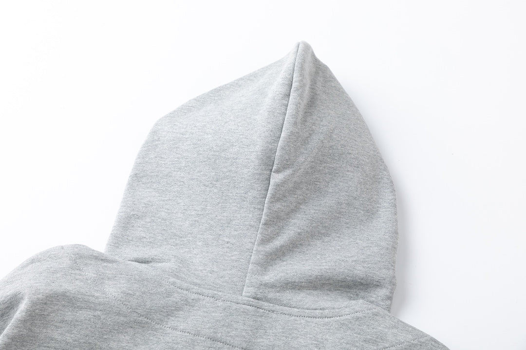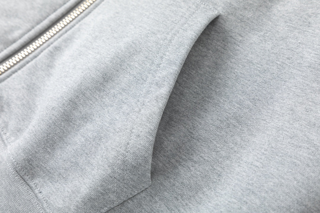 Made from 100% cotton terry, weighing approximately 420g. The jacket features a straight shoulder fit, ensuring it retains its shape after washing. The chest features a custom patch with the brand logo, which has been hand-torn. The custom zipper is a gold double-ended zipper, matching the original, with custom-woven and custom-dyed threads. Trims are original, with all three labels complete. The drawstring features a custom leather label.