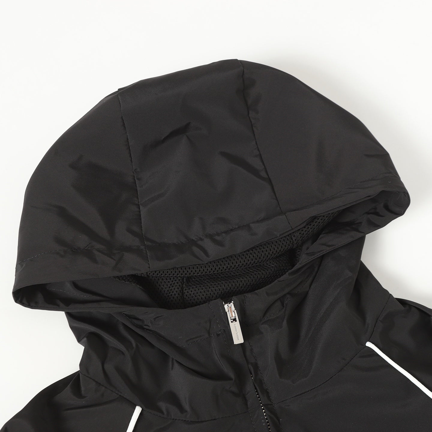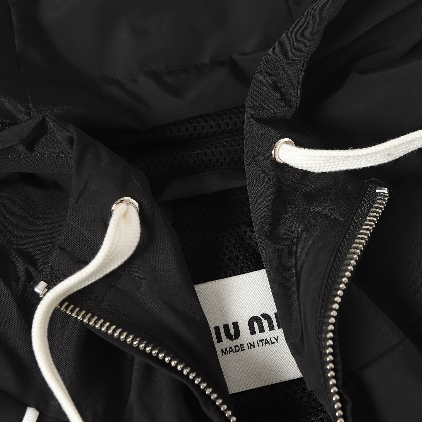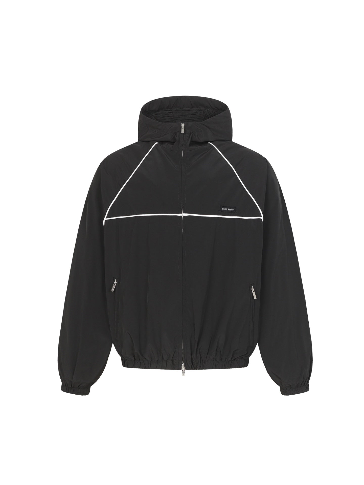 Customized cold-extracted smart-pore nylon fine-woven fabric is lightweight, delicate, and comfortable against the skin. Primarily in classic black, it offers the ultimate blend of depth and elegance. A striking MiuMiu logo patch adorns the chest, showcasing the brand's signature sophistication and elegance. The hood dances gently, creating a laid-back, effortless vibe. The meticulously outlined white piping adds the finishing touch, creating a harmonious and perfect visual balance. A trendsetter in fashion.