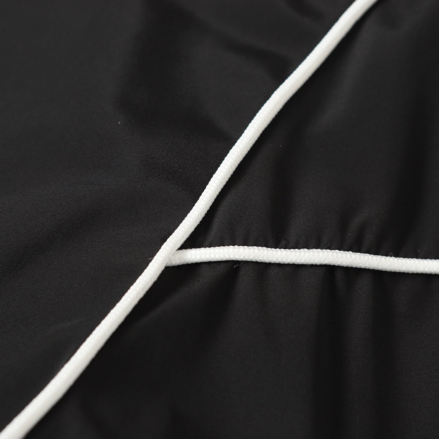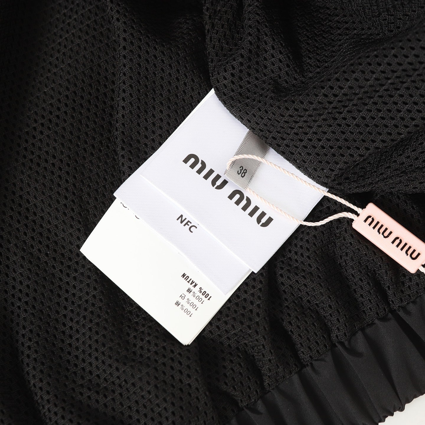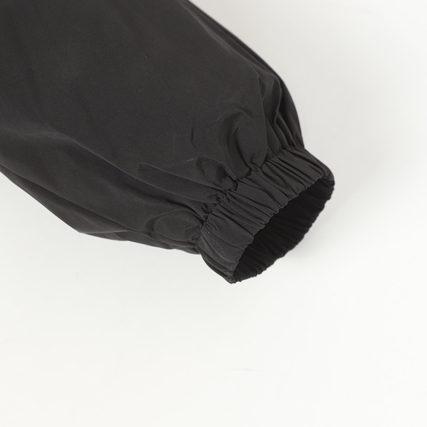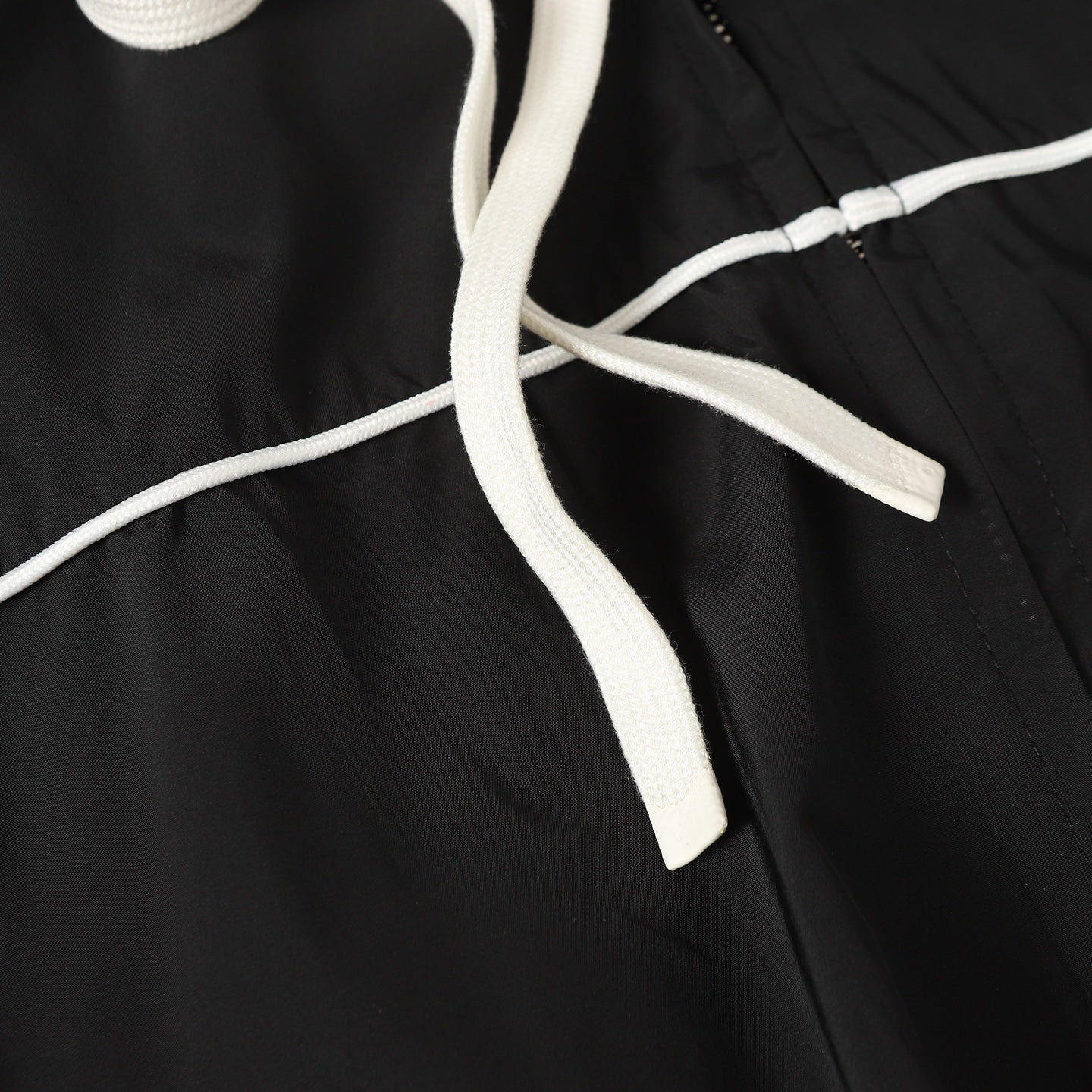 Customized cold-extracted smart-pore nylon fine-woven fabric is lightweight, delicate, and comfortable against the skin. Primarily in classic black, it offers the ultimate blend of depth and elegance. A striking MiuMiu logo patch adorns the chest, showcasing the brand's signature sophistication and elegance. The hood dances gently, creating a laid-back, effortless vibe. The meticulously outlined white piping adds the finishing touch, creating a harmonious and perfect visual balance. A trendsetter in fashion.