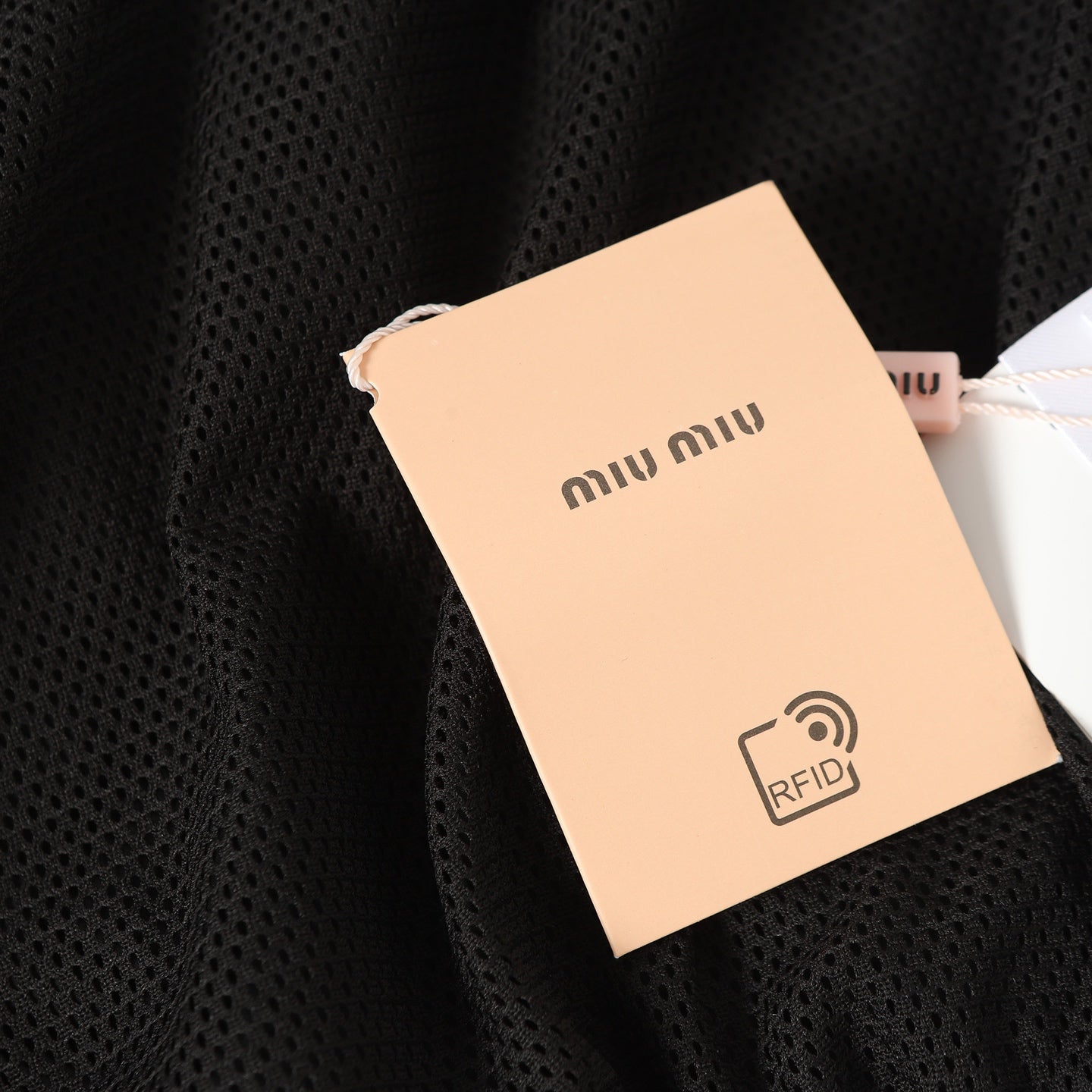 Process 1: The "MiuMiu" label is positioned precisely and securely using an imported infrared machine.