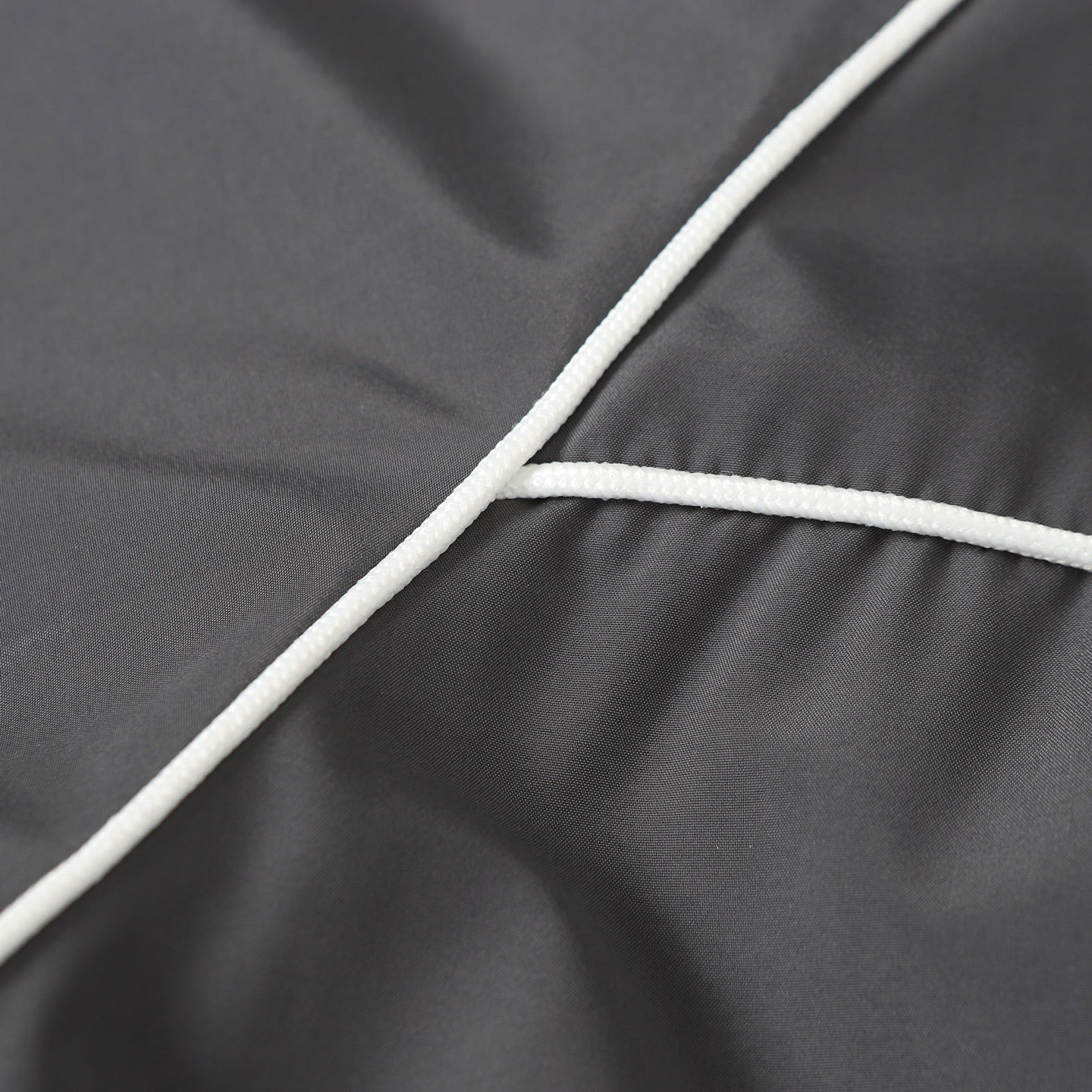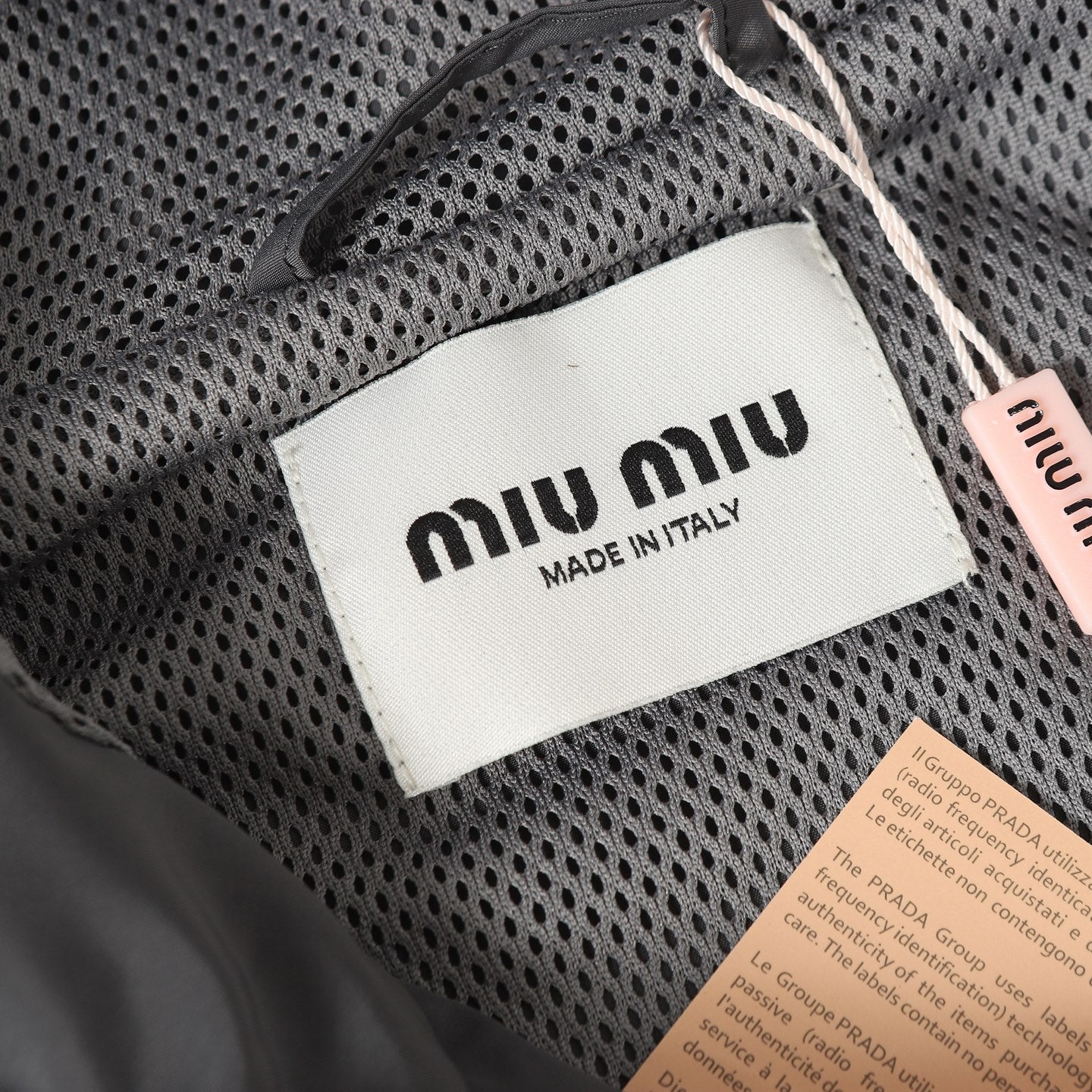 Customized cold-extracted smart-pore nylon fine-woven fabric is lightweight, delicate, and comfortable against the skin. Primarily in classic black, it offers the ultimate blend of depth and elegance. A striking Miu Miu logo patch adorns the chest, showcasing the brand's signature sophistication and elegance. The hood dances gently, creating a laid-back, effortless vibe. The meticulously outlined white piping adds the finishing touch, creating a harmonious and perfectly balanced visual experience. A trendsetter in fashion.