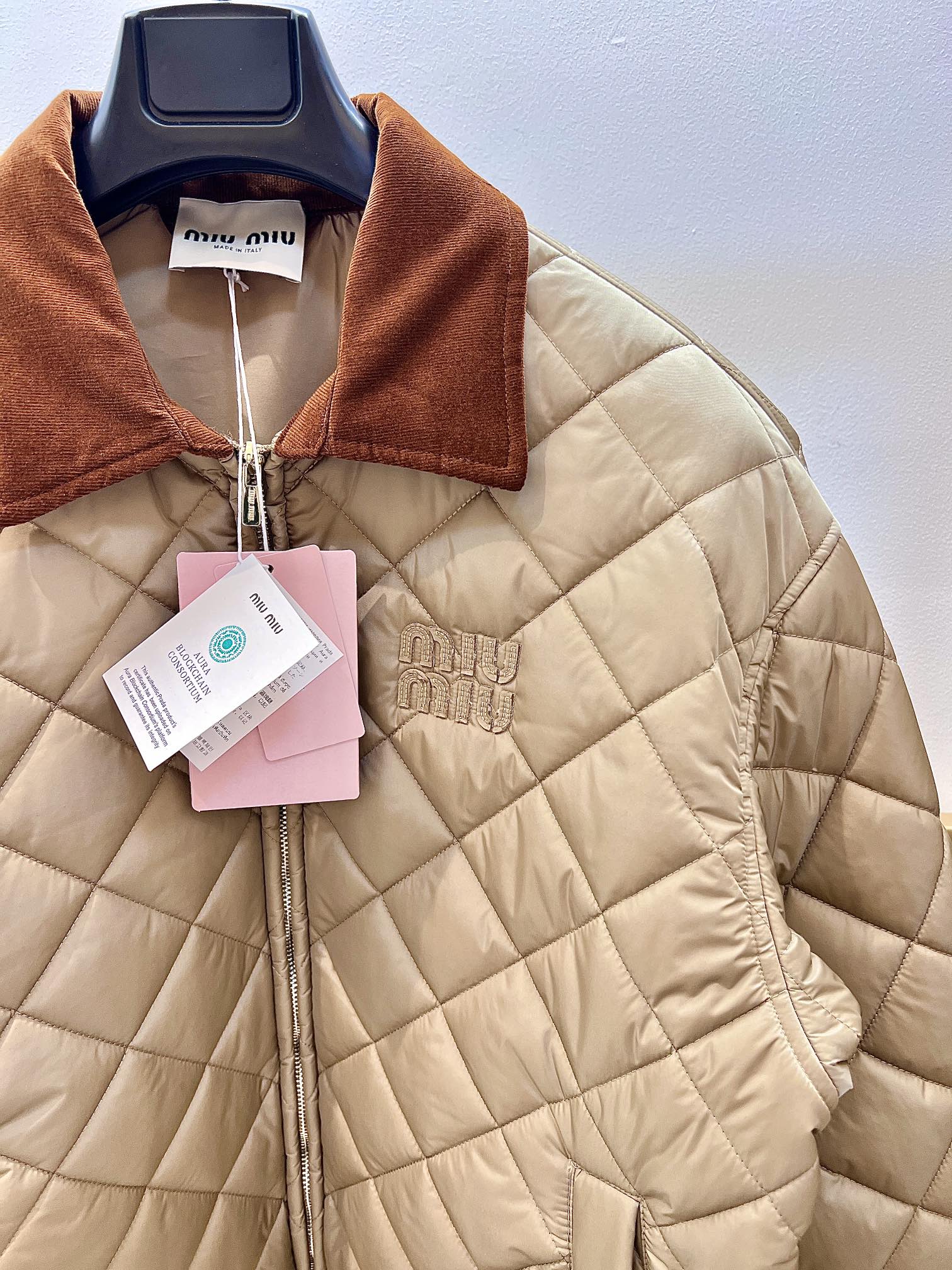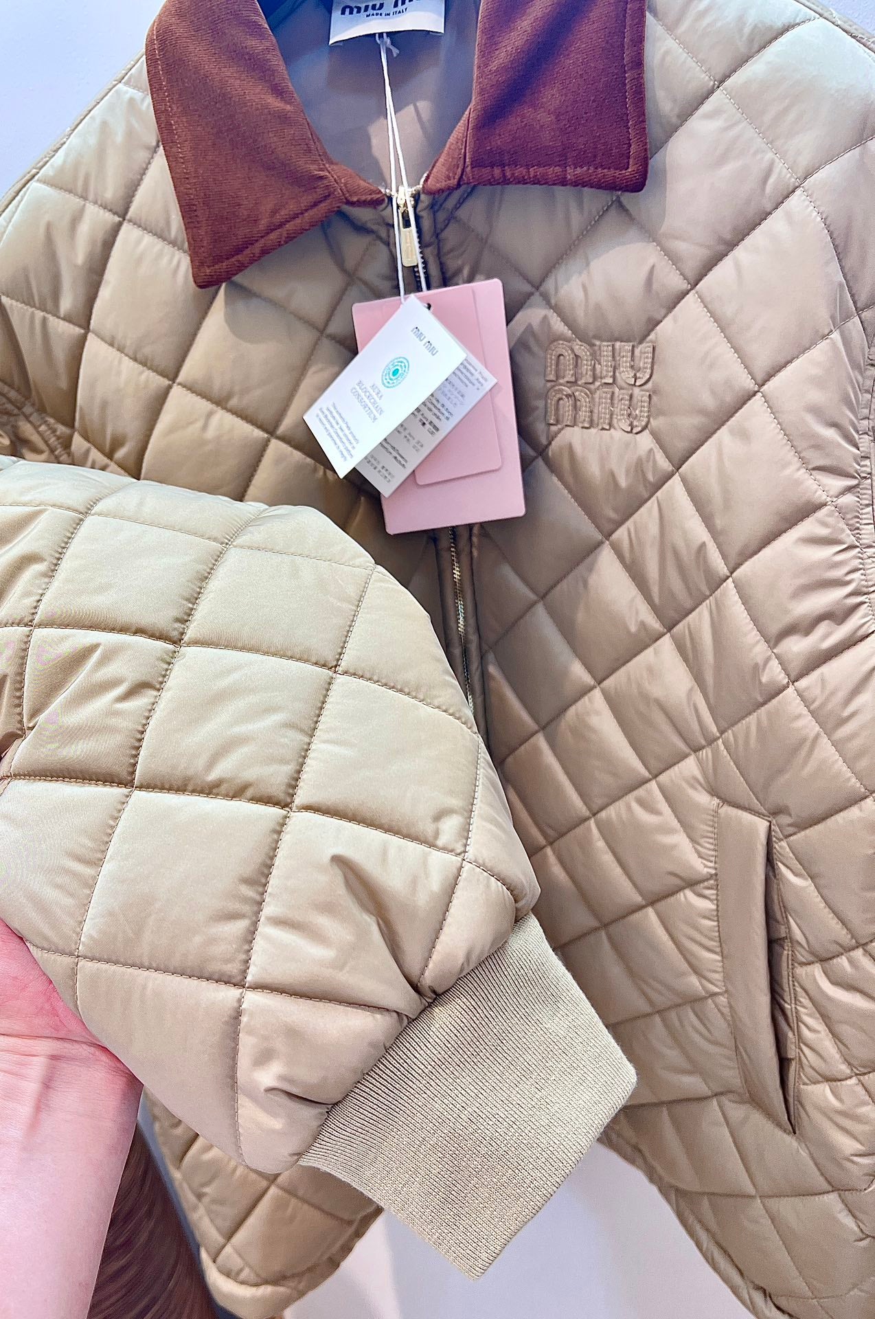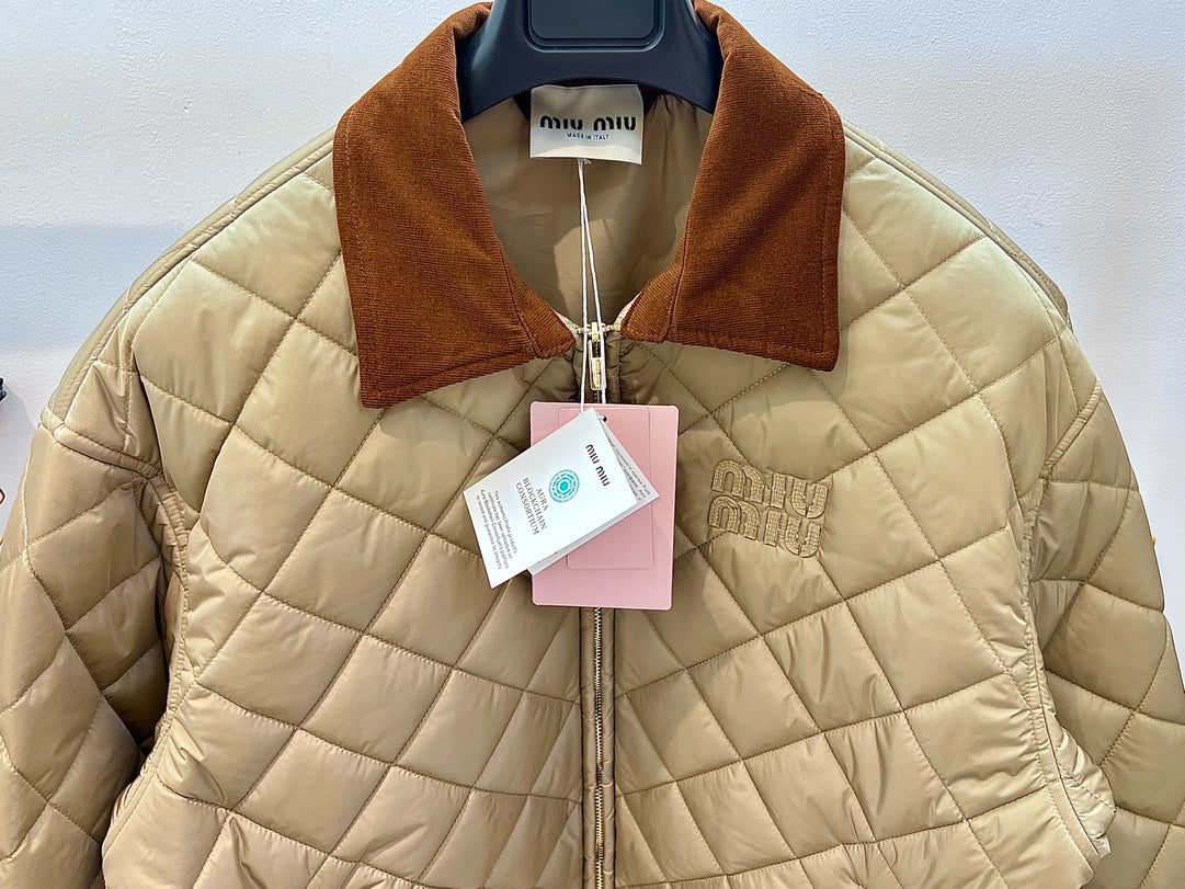 Miumiu/Miu Miu Diamond Quilted Lapel Jacket. This collar design is inspired by shirting, while incorporating the unique texture of quilted cotton throughout. Embellished with Miu Miu appliqués and embroidered logo monograms for a signature touch. Truly stylish! #BoysCamp #miumiuBoys #CommuterVersatile