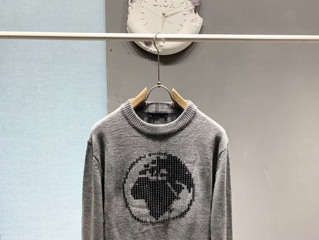 This sweater is knitted from a wool blend and features a round neck design. The front chest features an intarsia Earth 🌍 pattern with imported diamonds, and the back panel features a jacquard pattern of the brand's logo, creating a luxurious and elegant look!