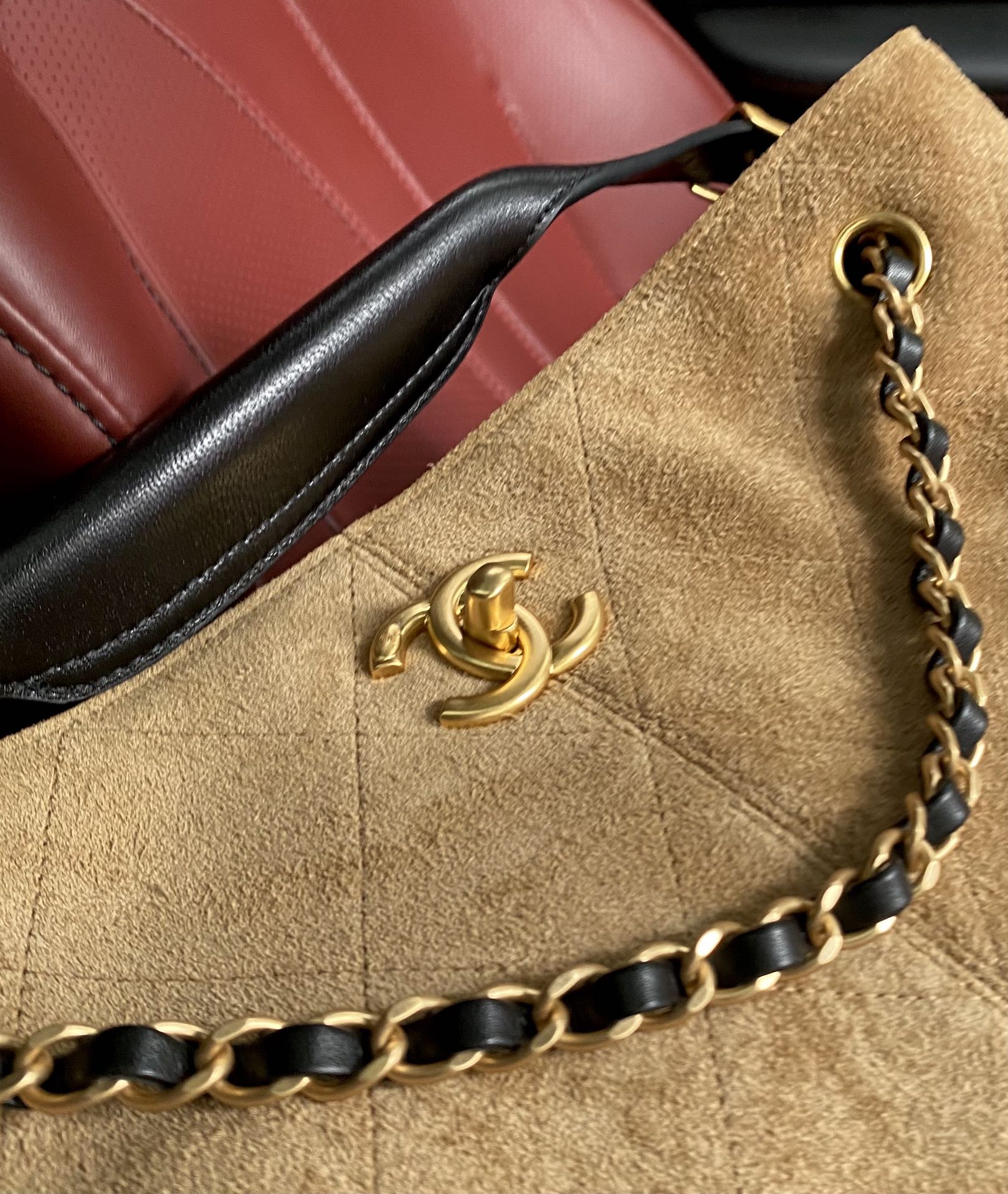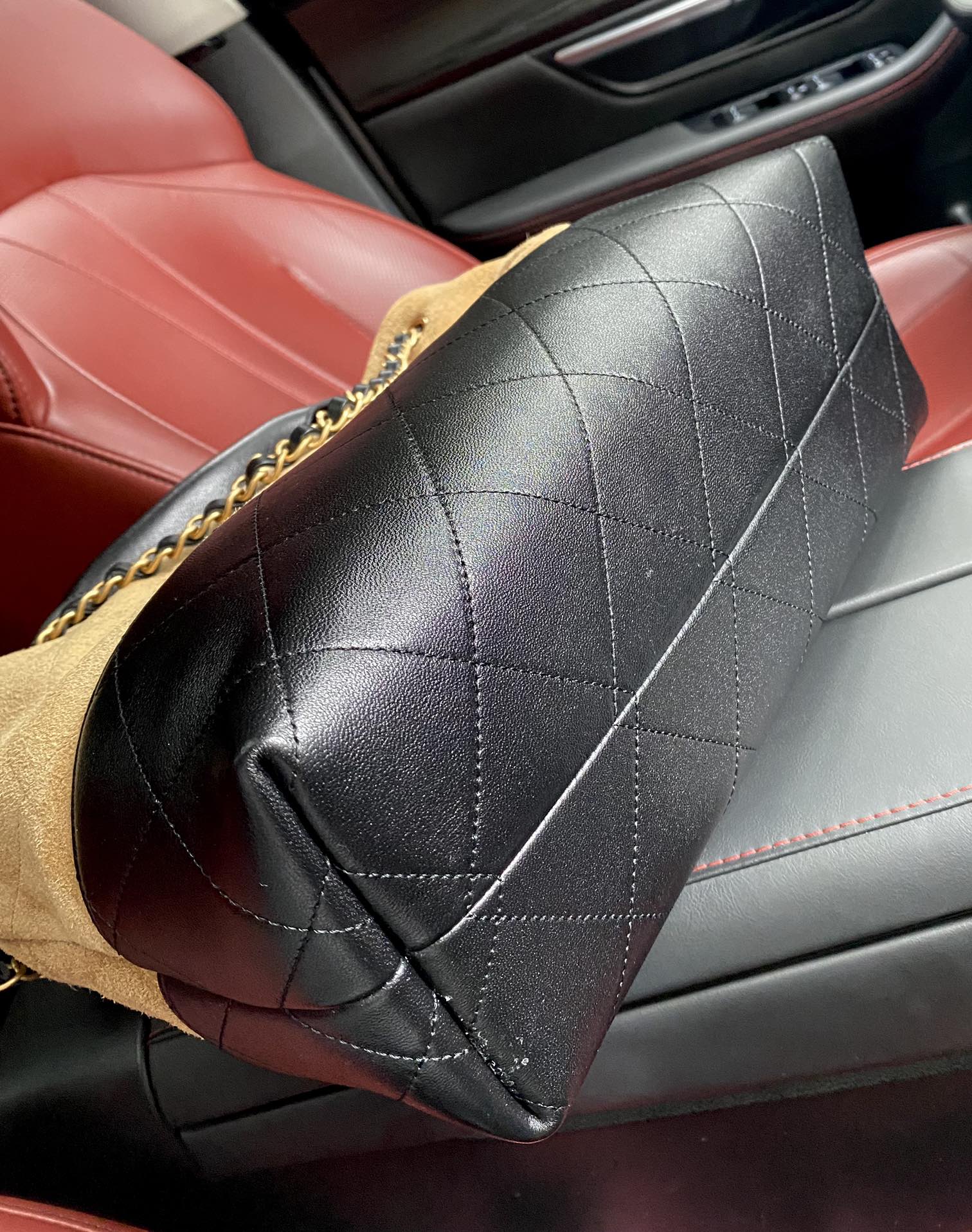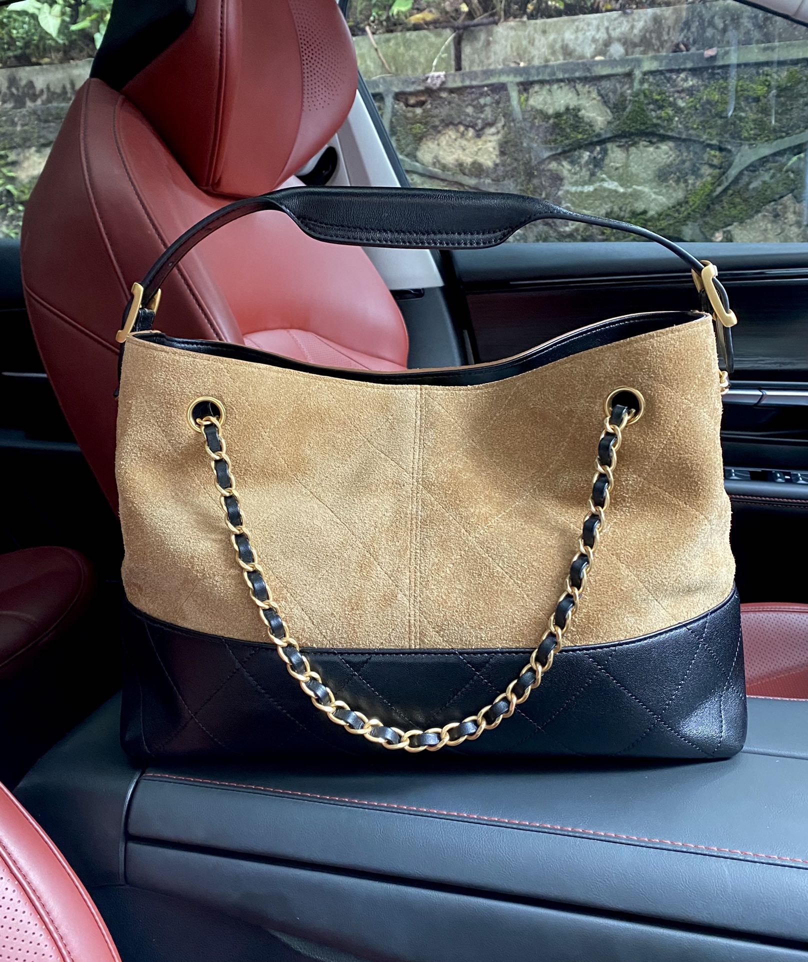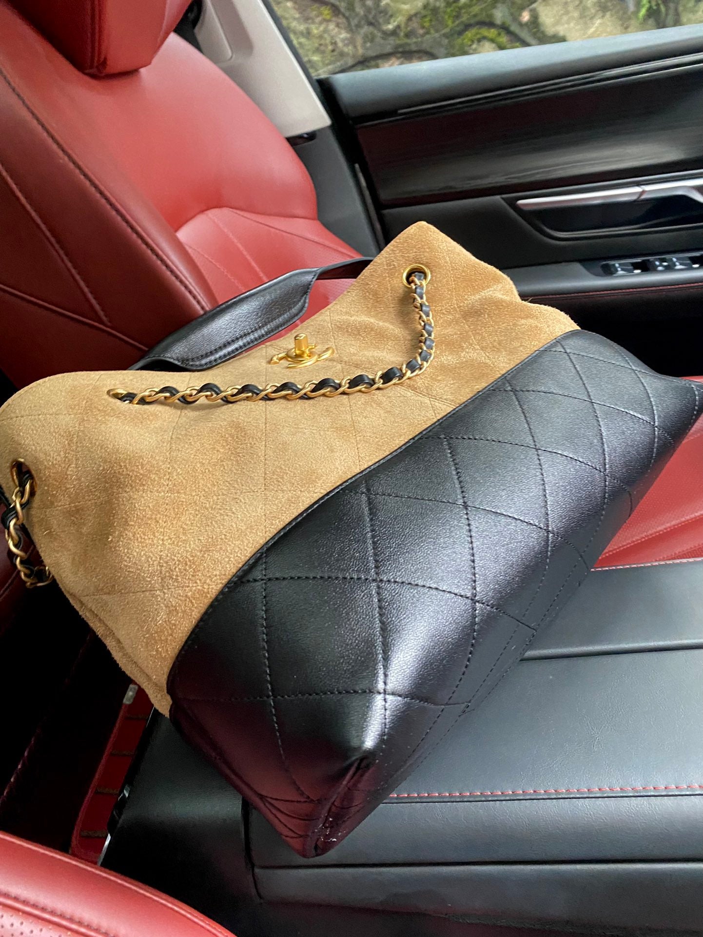 ๐๐๐ was a hit at the Hangzhou fashion show. Inspired by Chanel's ebony lacquer screens, the signature quilted pattern, suede, and glossy goatskin are combined with a unique colorblocking design for a luxurious and unique allure. It can be worn in multiple ways.