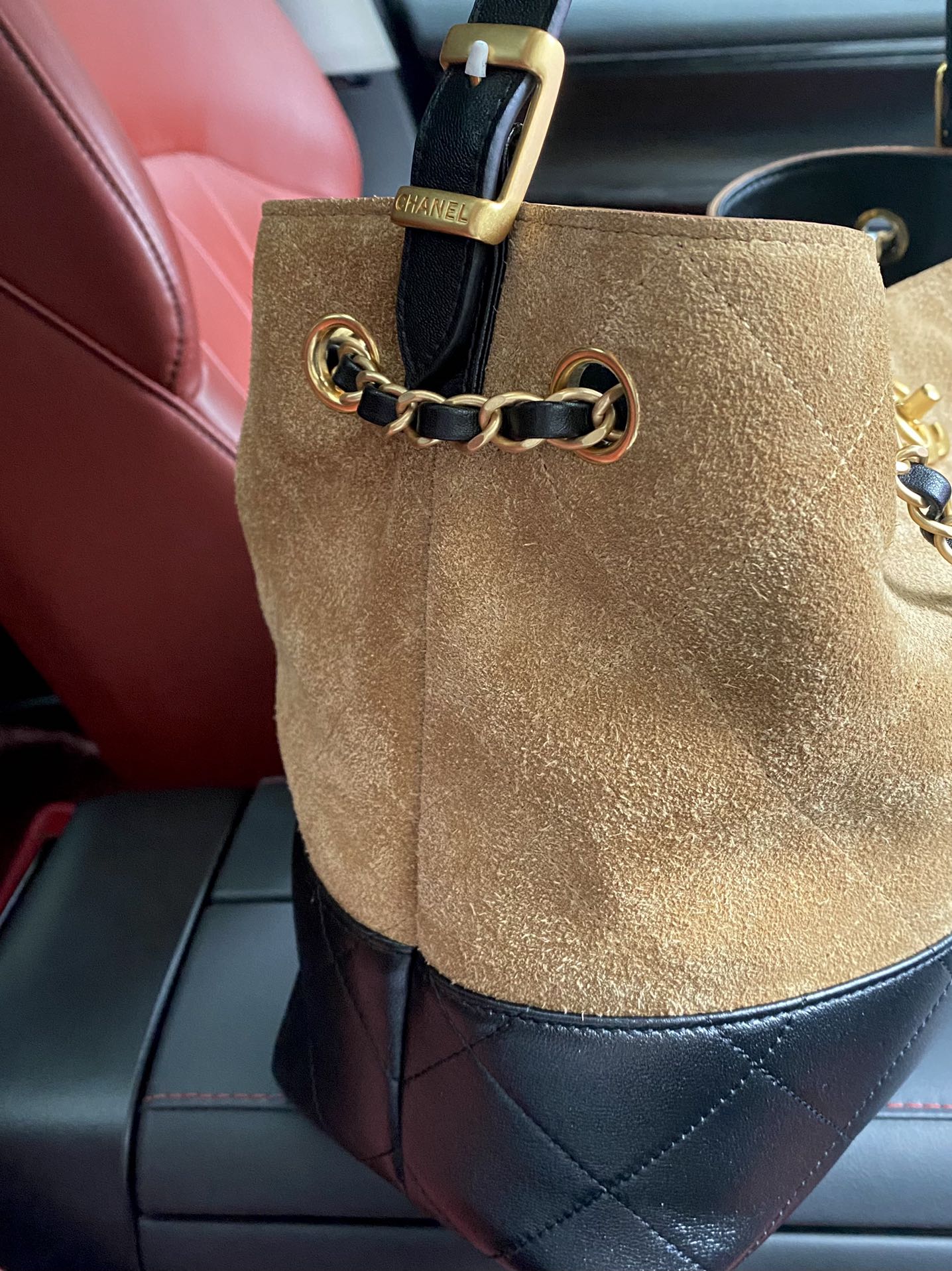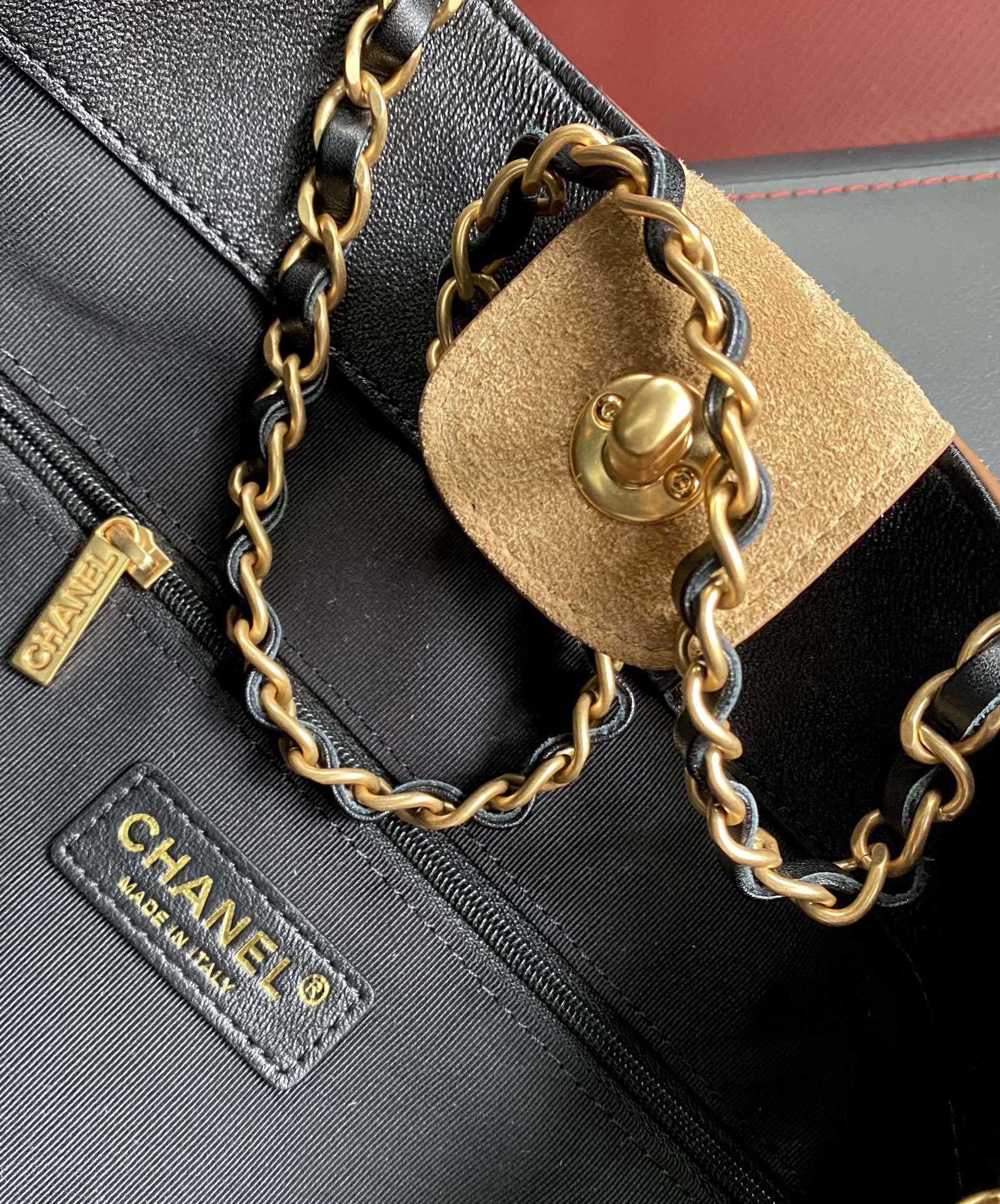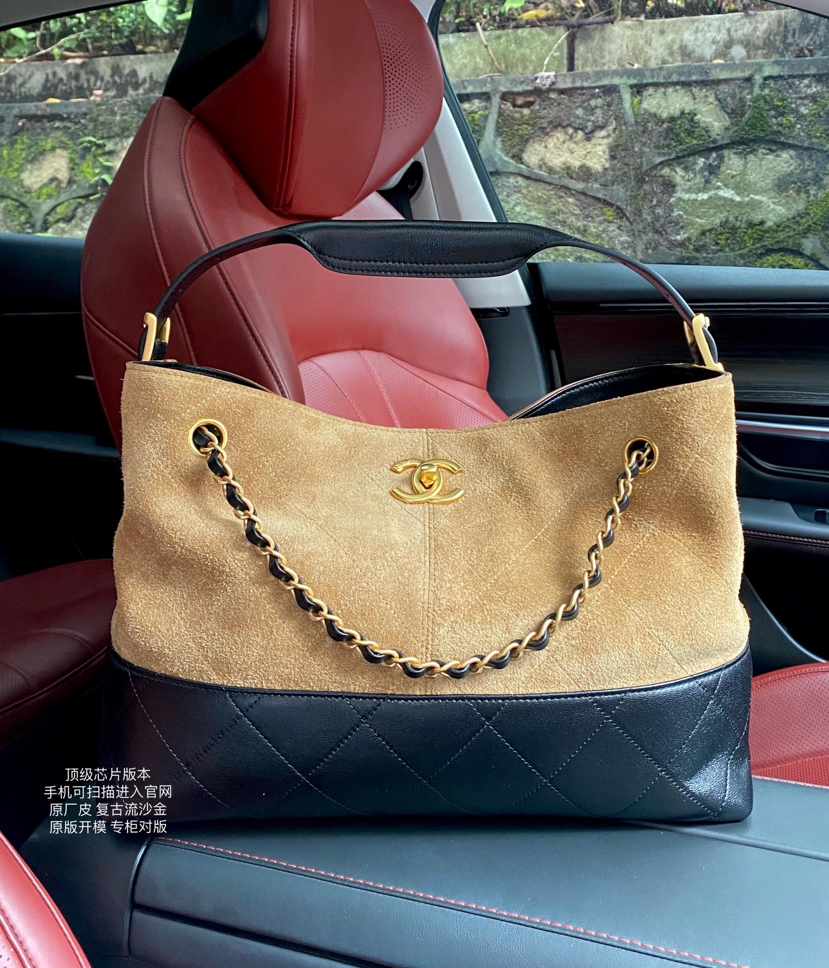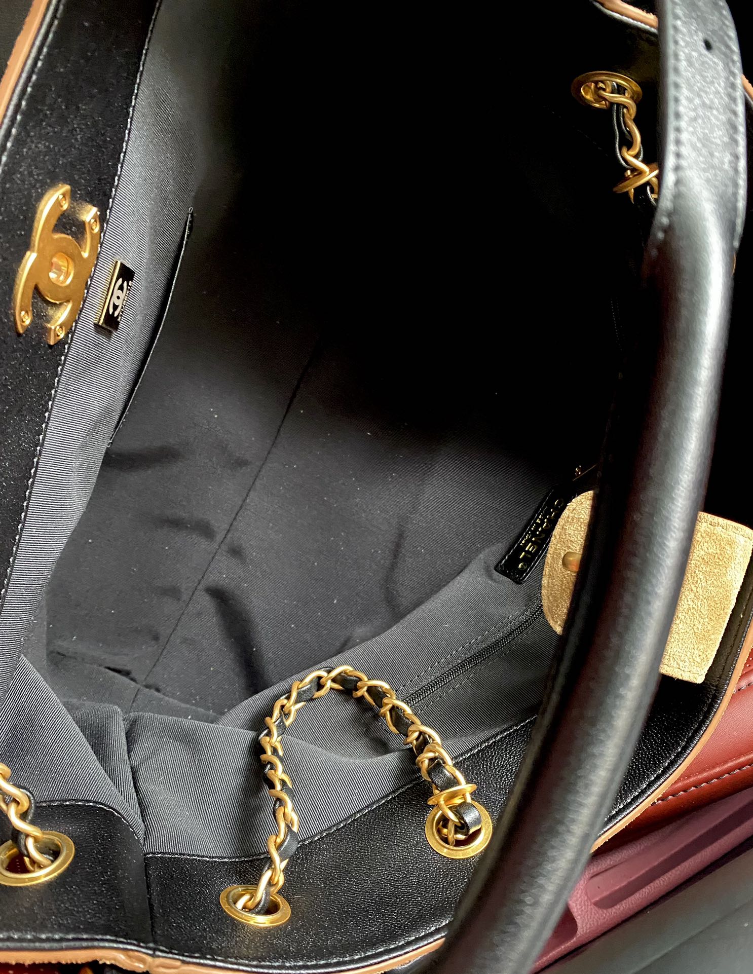 ๐๐๐ was a hit at the Hangzhou fashion show. Inspired by Chanel's ebony lacquer screens, the signature quilted pattern, suede, and glossy goatskin are combined with a unique colorblocking design for a luxurious and unique allure. It can be worn in multiple ways.