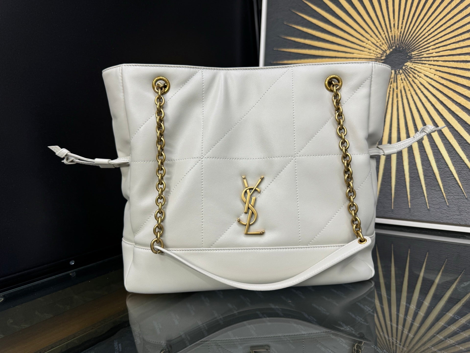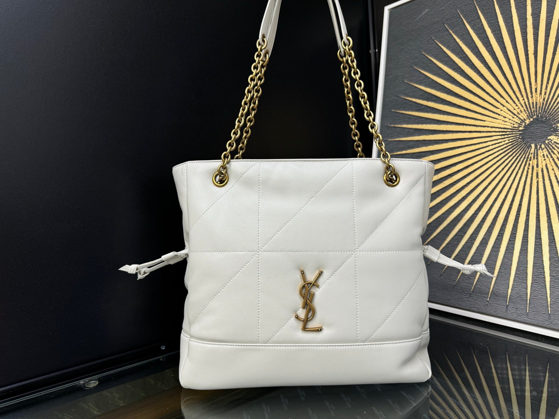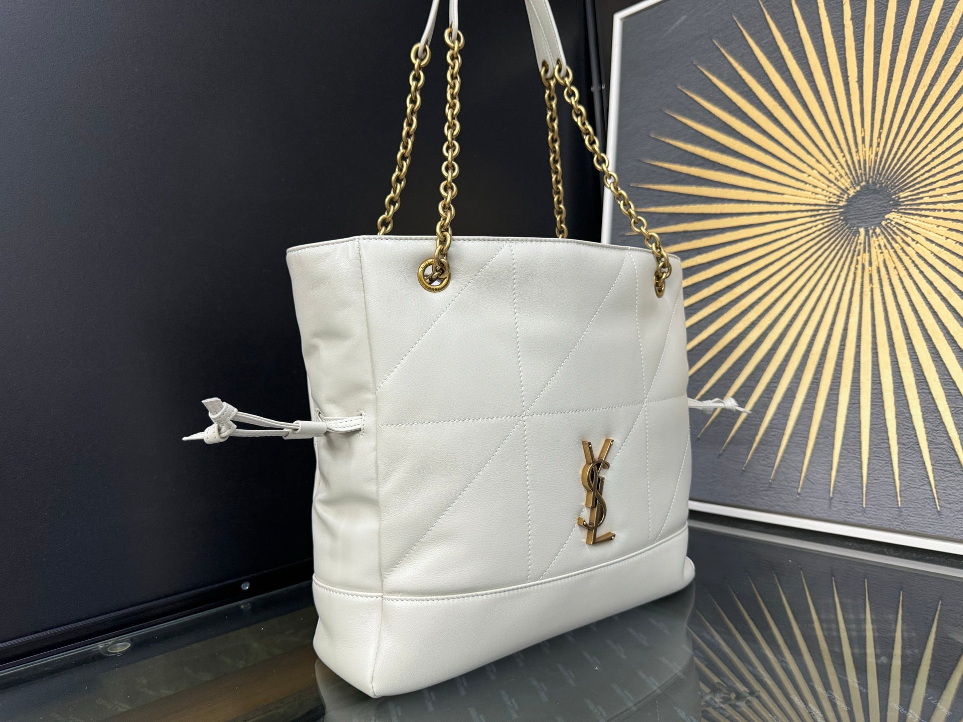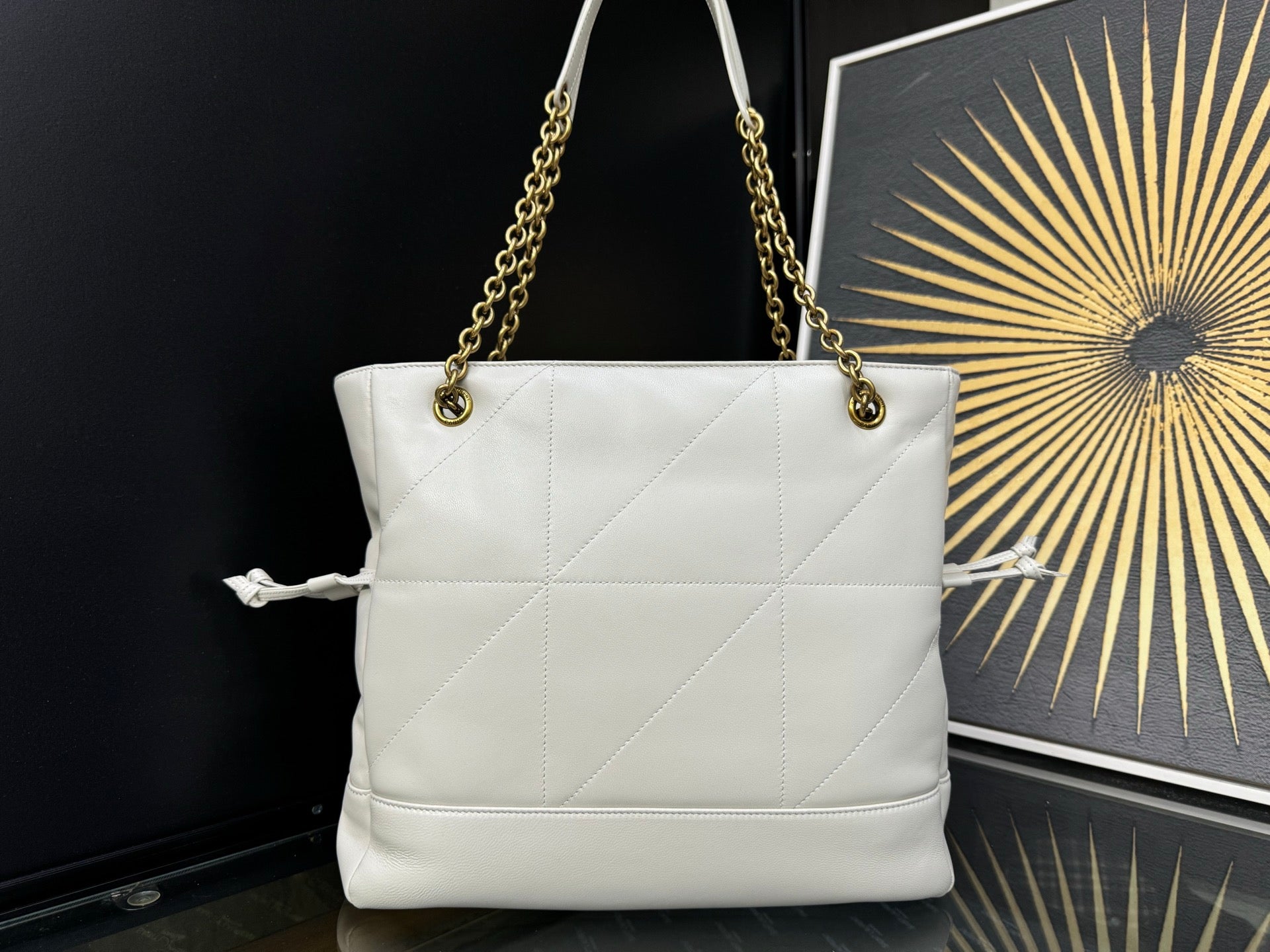 Lucky Bag Bucket Bag. Made of soft Italian lambskin. The drawstring design creates a naturally refined, draped feel. The metal chain and logo complement each other beautifully, creating a relaxed, chic look. The lucky bag's design is unique and stylish! Extra-large capacity, including space for a laptop.