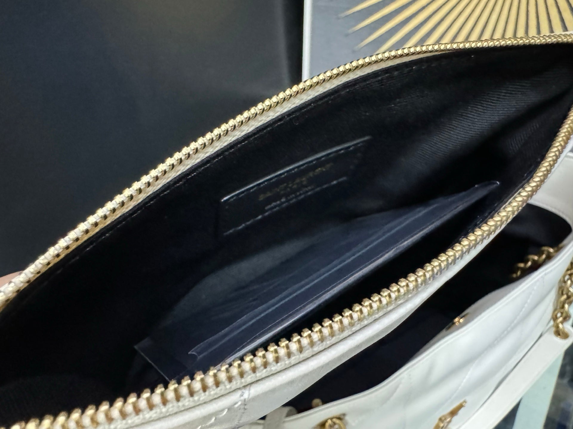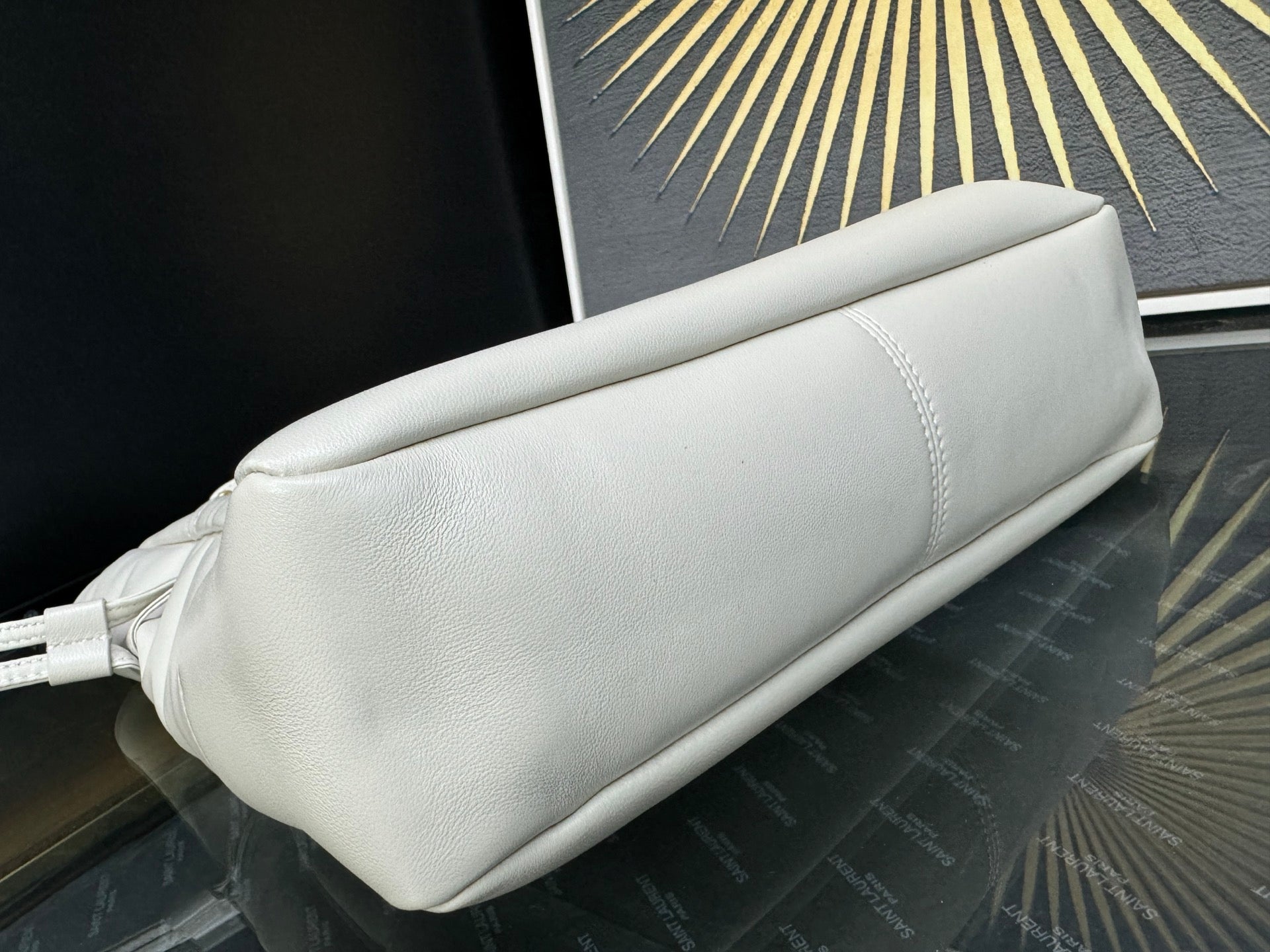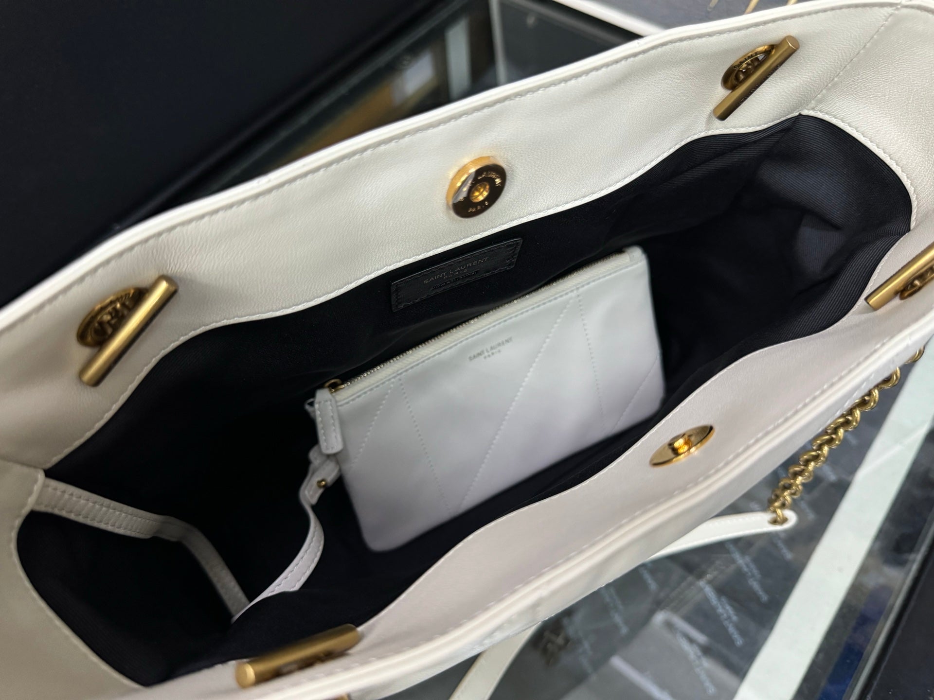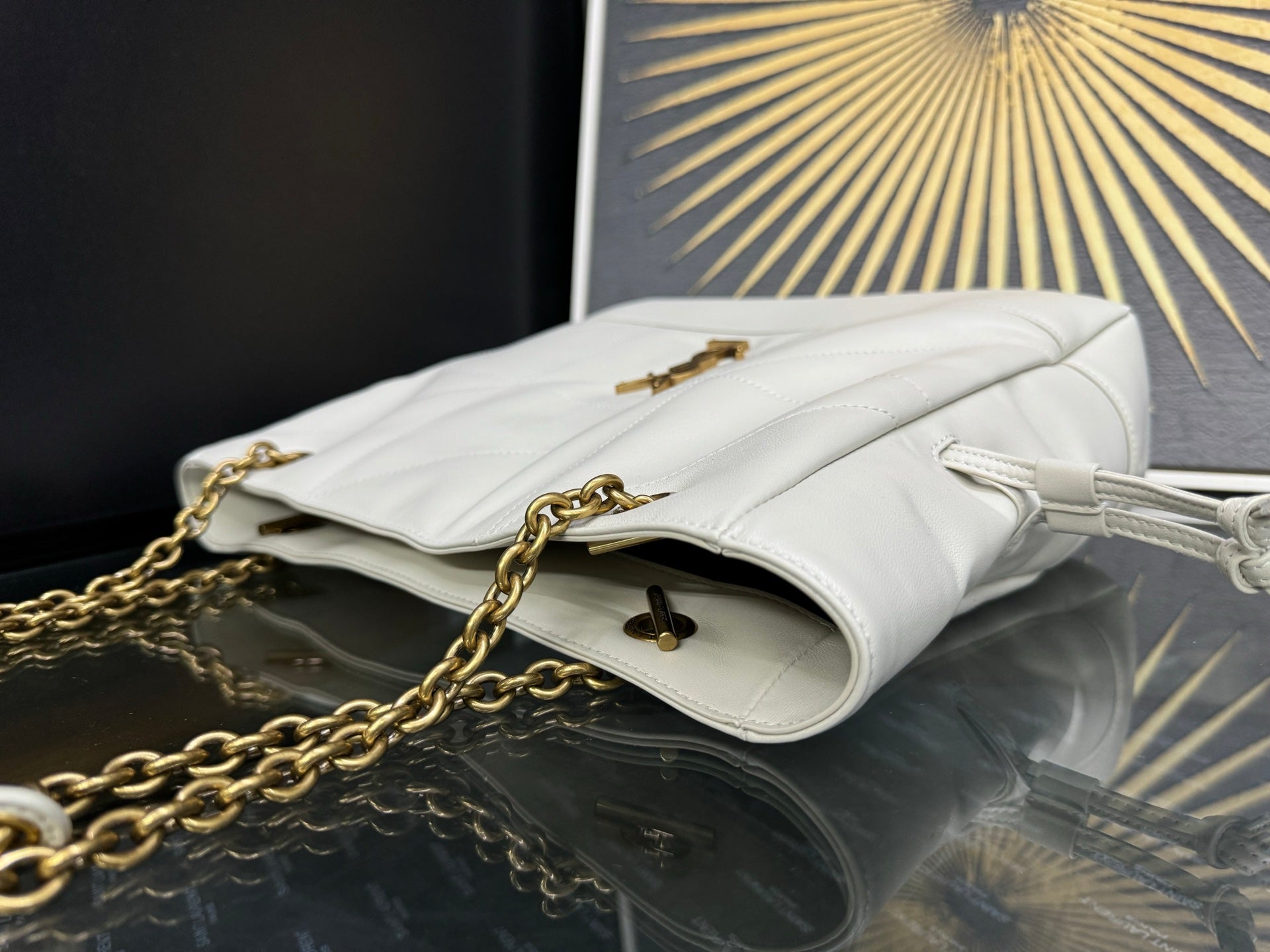 Lucky Bag Bucket Bag. Made of soft Italian lambskin. The drawstring design creates a naturally refined, draped feel. The metal chain and logo complement each other beautifully, creating a relaxed, chic look. The lucky bag's design is unique and stylish! Extra-large capacity, including space for a laptop.