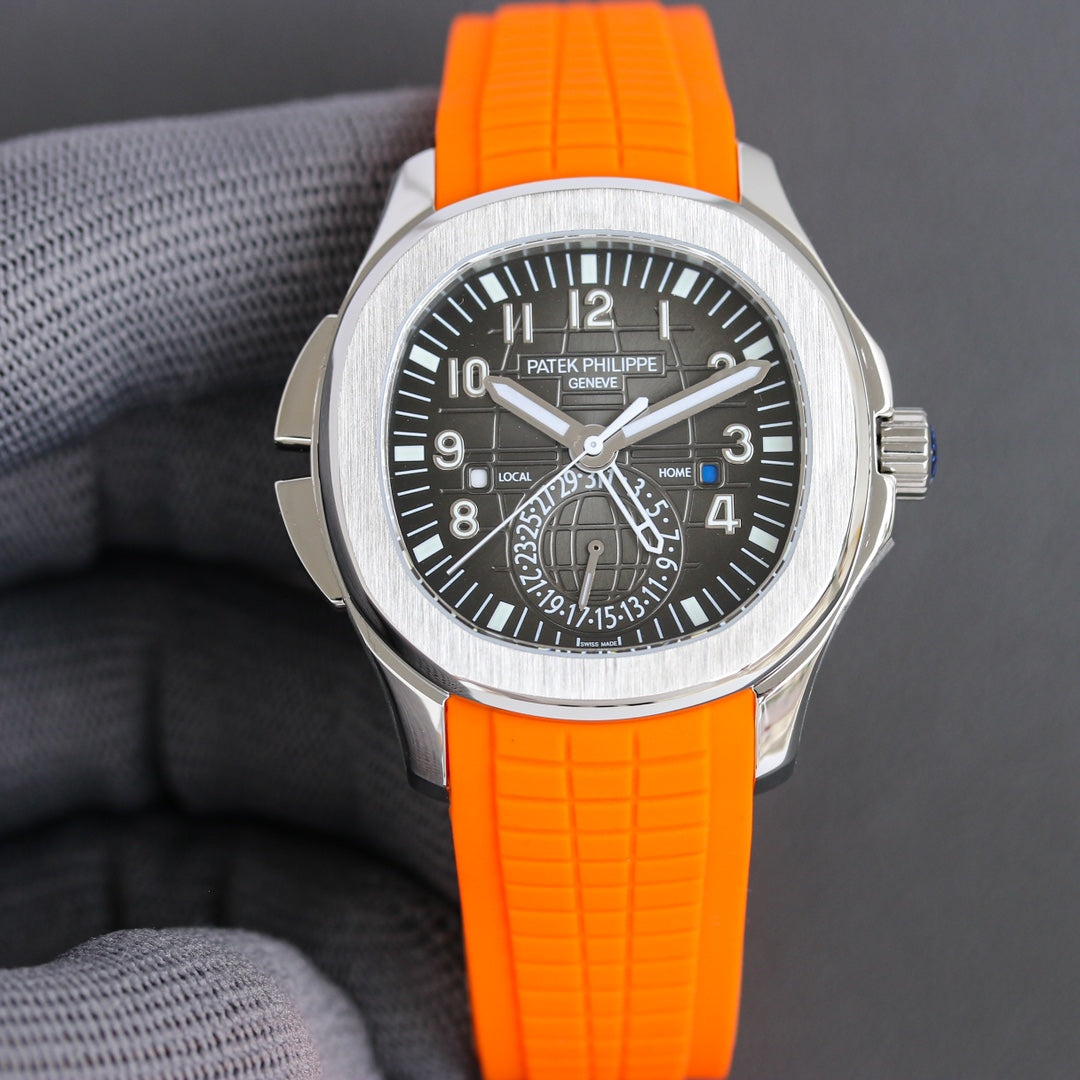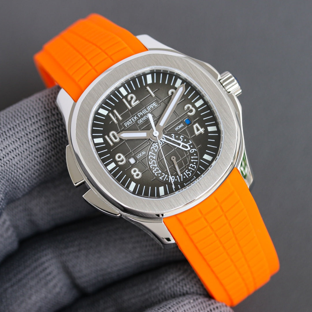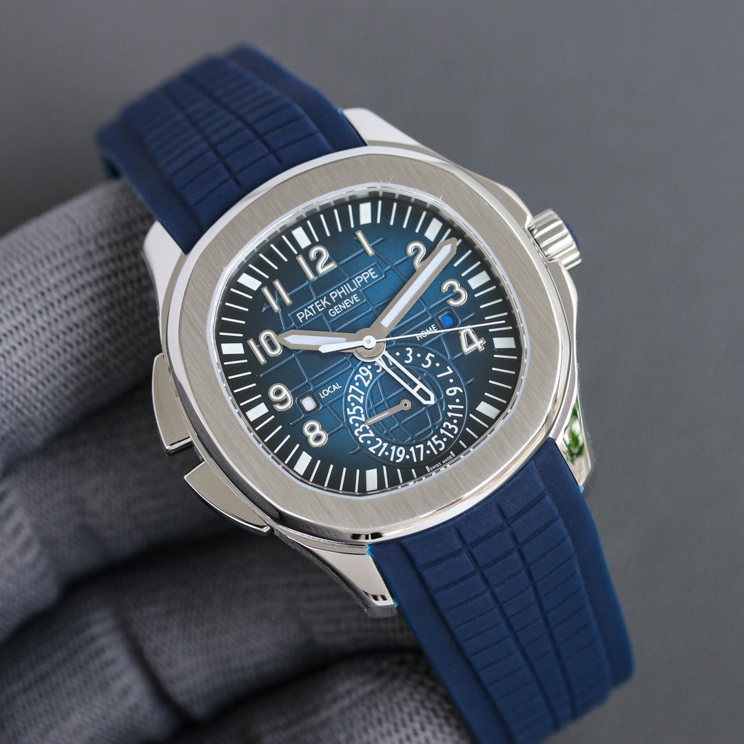 For other quality issues, please contact us privately! The Patek Philippe Aquanaut 5164A-001 watch features a modern, international dual time zone complication, perfectly suited to the tastes and needs of a younger generation. [Case]: 40.8mm diameter, 11.8mm thickness. Crafted from Patek Philippe's classic stainless steel, the sleek octagonal shape is perfectly rounded. The shark-fin design on the left side of the case acts as a push-button for quickly adjusting the central skeletonized hour hand, which can be used to indicate a second time zone. [Dial]: Black embossed dial with metal numerals and luminescent hour markers. Square day/night apertures display "HOME" and "LOCAL" at 3 and 9 o'clock, with blue and white representing night and day, respectively. A pointer-type date disc is at 6 o'clock. Movement: This watch successfully utilizes the automatic caliber 324 SC FUS found in the Patek Philippe reference 5164A-001, featuring a dual time zone module integrated into the large three-hand movement. Paired with a casual Tropical strap, this watch is a luxurious sports watch for a younger generation. Photos are of a true replica.