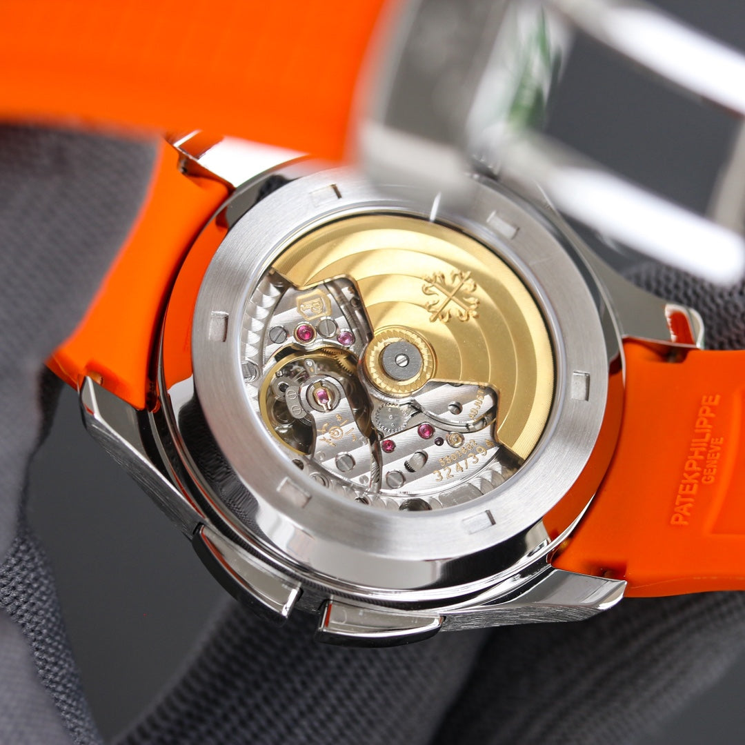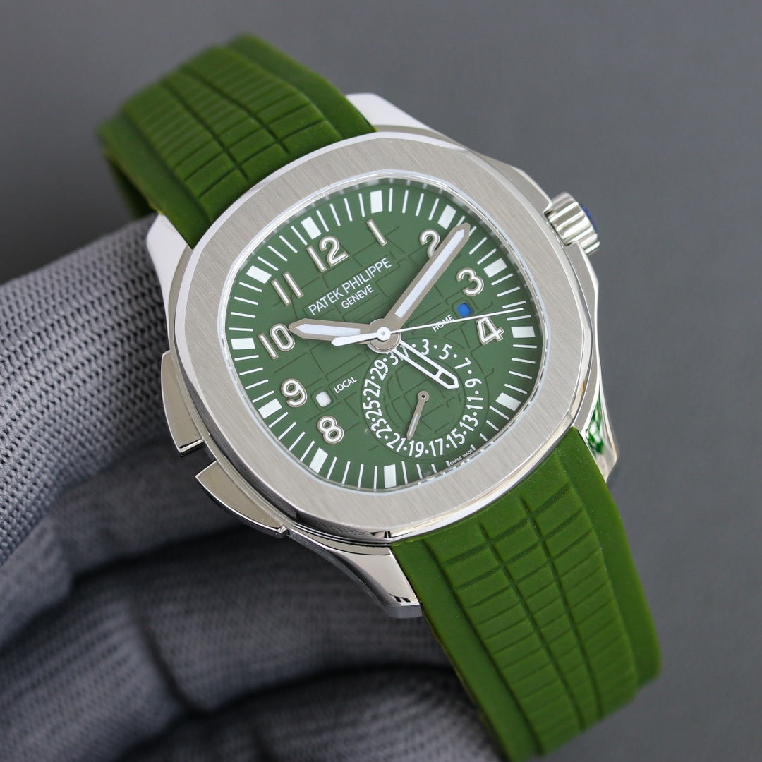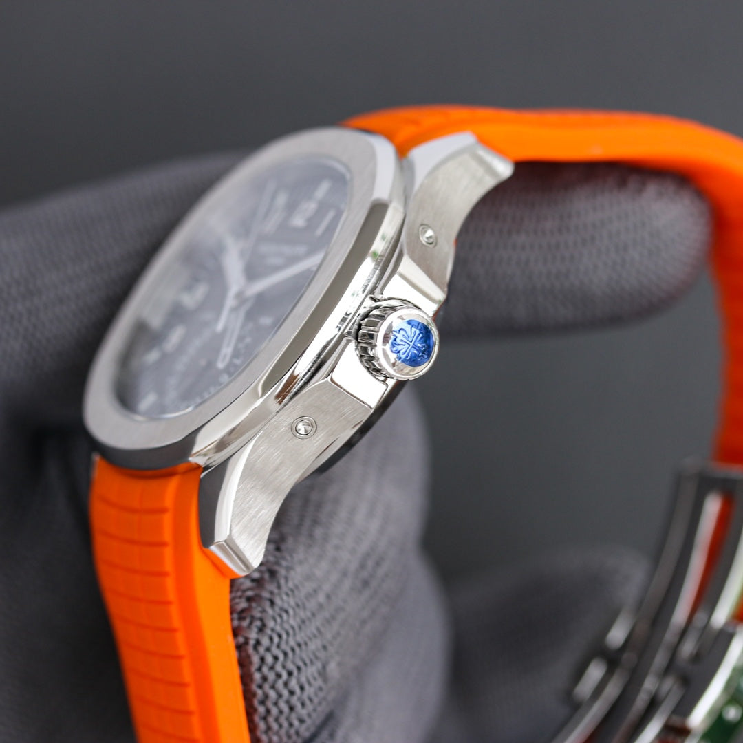 For other quality issues, please contact us privately! The Patek Philippe Aquanaut 5164A-001 watch features a modern, international dual time zone complication, perfectly suited to the tastes and needs of a younger generation. [Case]: 40.8mm diameter, 11.8mm thickness. Crafted from Patek Philippe's classic stainless steel, the sleek octagonal shape is perfectly rounded. The shark-fin design on the left side of the case acts as a push-button for quickly adjusting the central skeletonized hour hand, which can be used to indicate a second time zone. [Dial]: Black embossed dial with metal numerals and luminescent hour markers. Square day/night apertures display "HOME" and "LOCAL" at 3 and 9 o'clock, with blue and white representing night and day, respectively. A pointer-type date disc is at 6 o'clock. Movement: This watch successfully utilizes the automatic caliber 324 SC FUS found in the Patek Philippe reference 5164A-001, featuring a dual time zone module integrated into the large three-hand movement. Paired with a casual Tropical strap, this watch is a luxurious sports watch for a younger generation. Photos are of a true replica.