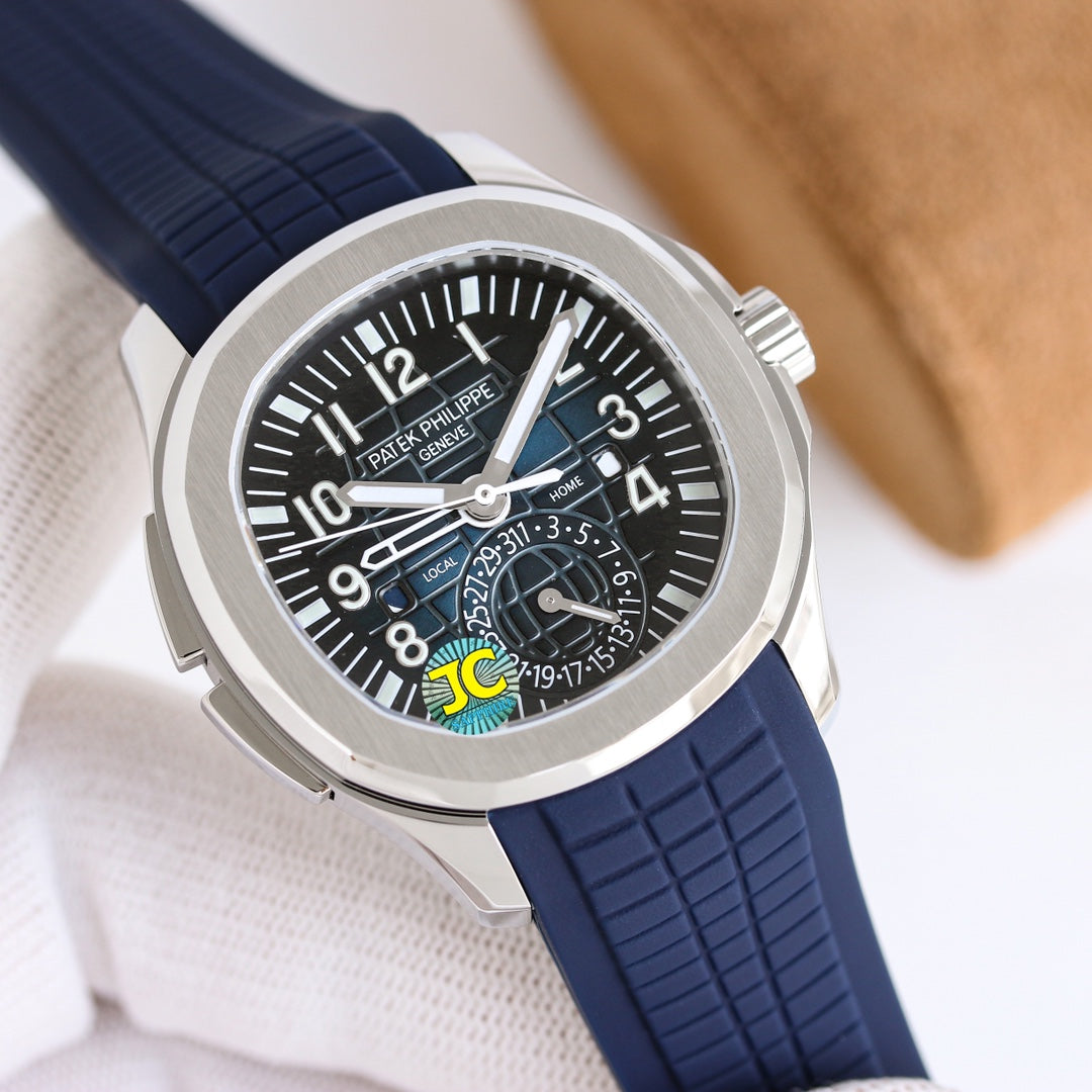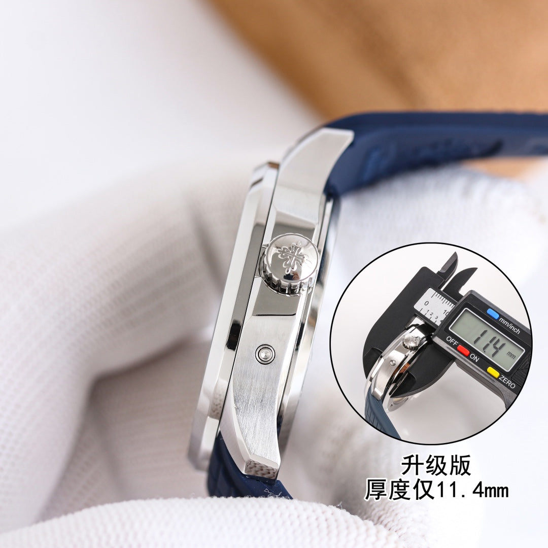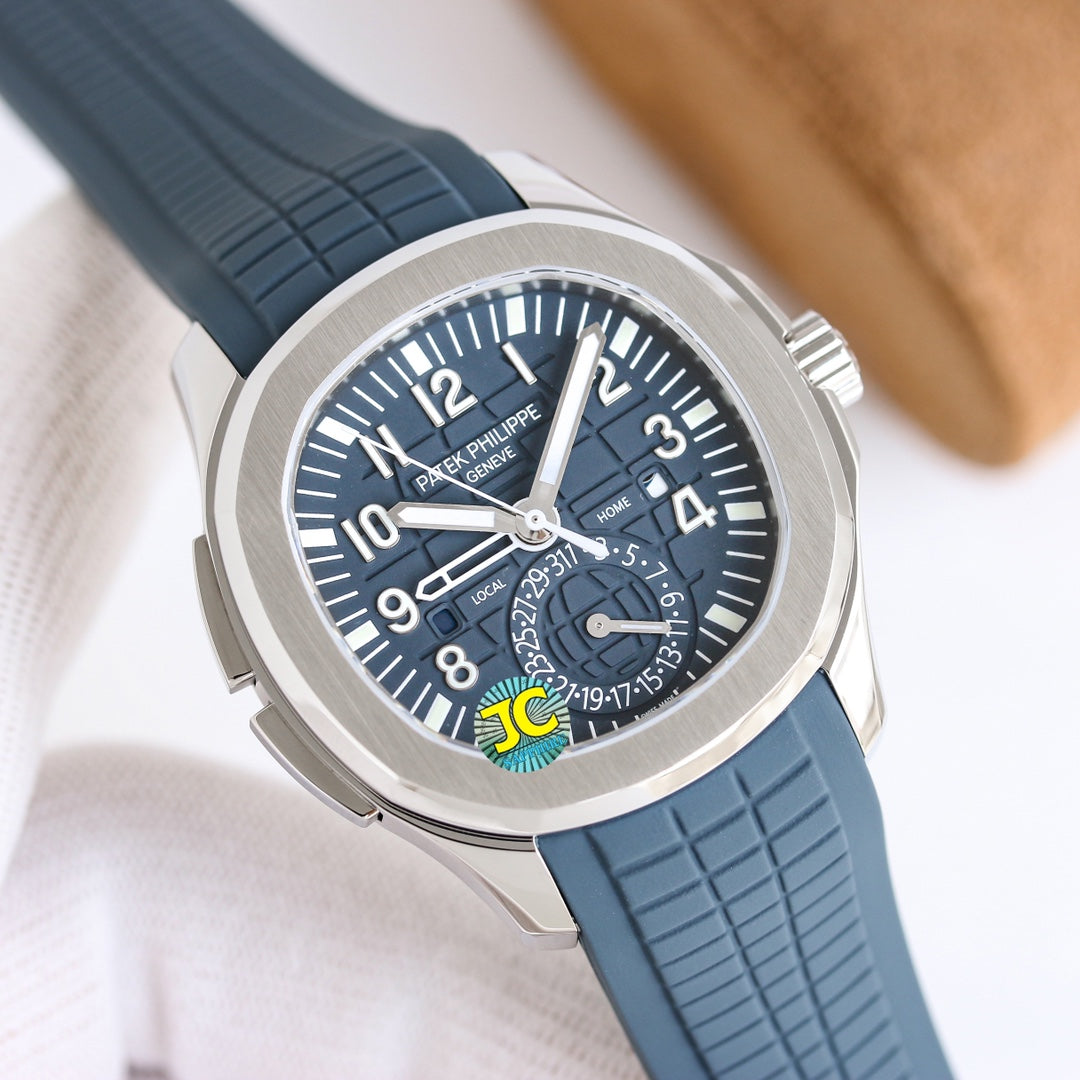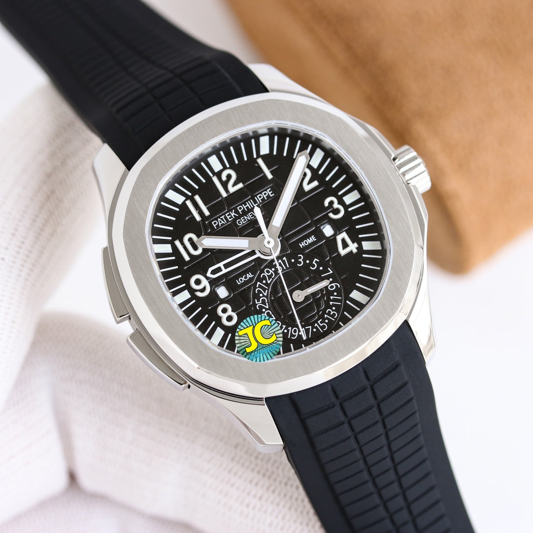 Top-tier replica 💰 Private message! This Patek Philippe Aquanaut 5164 Grenade Series watch features a modern, international dual time zone complication, perfectly suited to the tastes and needs of a younger generation. [Case] 40.8mm diameter, 11.4mm thickness. Crafted from Patek Philippe's classic stainless steel, the sleek octagonal shape is perfectly rounded. The shark-fin design on the left side of the case acts as a push-button for quickly adjusting the central skeletonized hour hand, which can be used to indicate the time in a second time zone. [Dial] Black embossed dial with metal numerals and luminescent hour markers. The square day/night apertures at 3 and 9 o'clock display "HOME" and "LOCAL" respectively, with blue and white representing night and day, respectively. A pointer-type date dial is at 6 o'clock. [Movement] Utilizing a Japanese 9015 modified 324 SC FUS automatic movement, the large three-hand movement is equipped with a dual time zone module. Equipped with a casual Tropical strap, this is a luxury sports watch for the younger generation! The pictures are a true replica of the original!