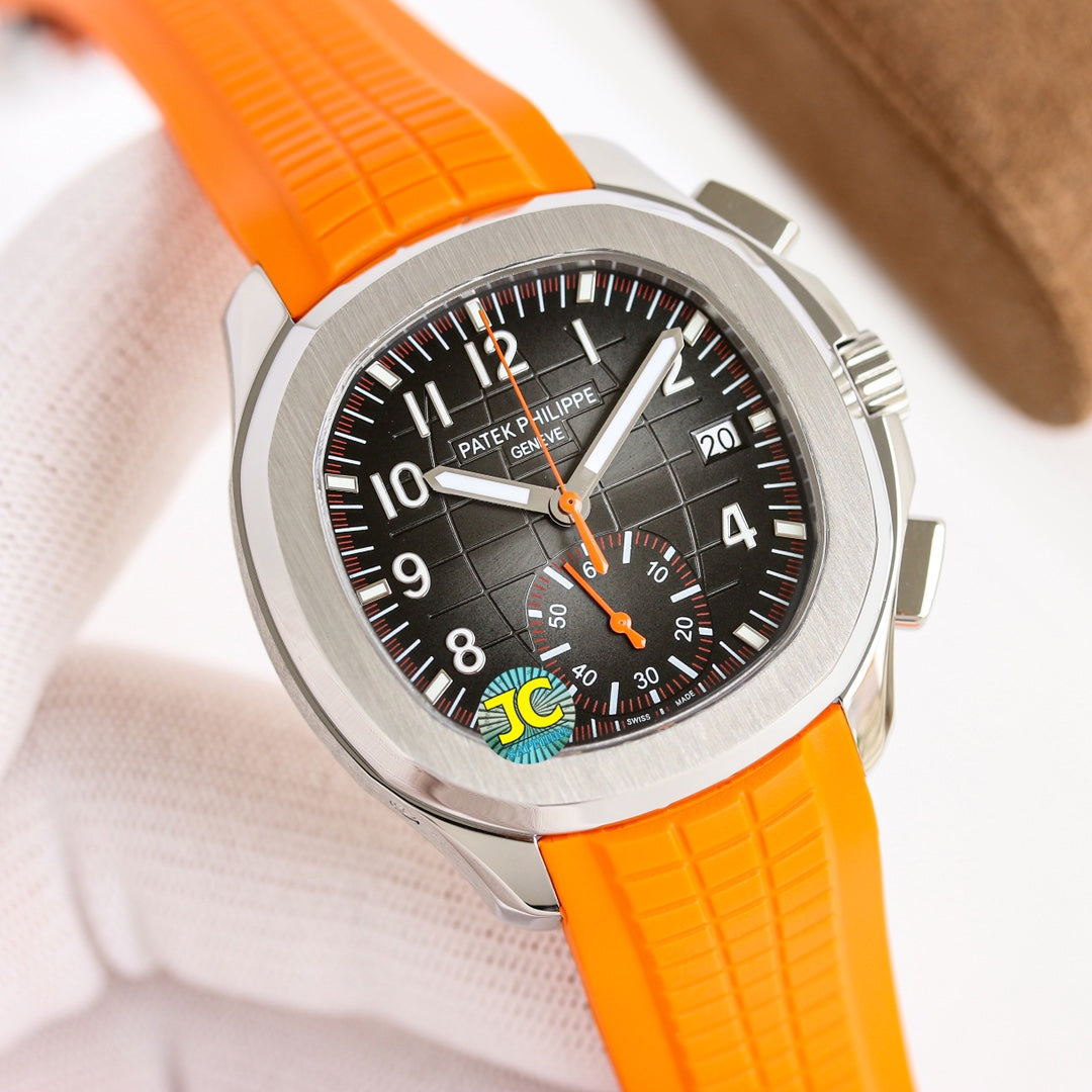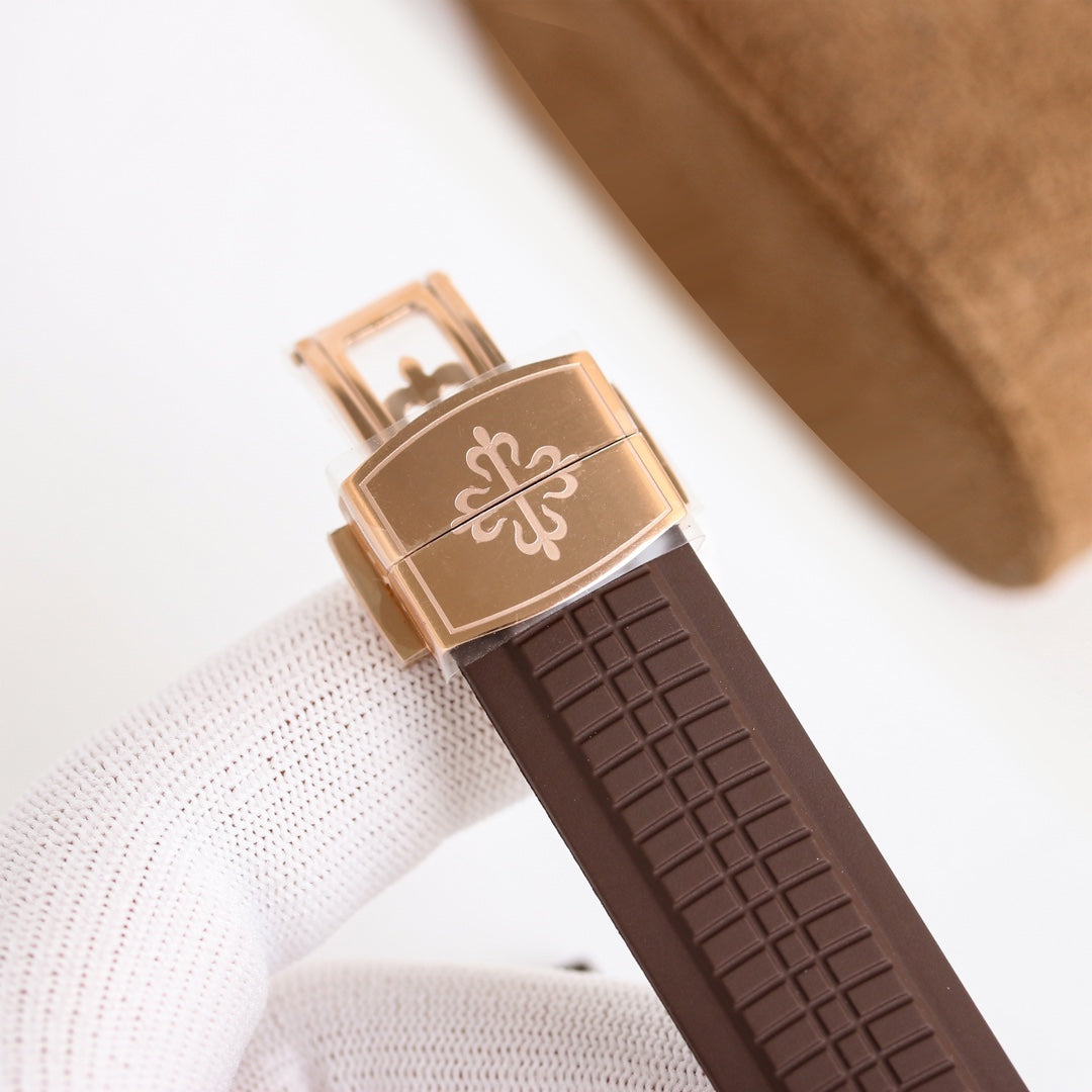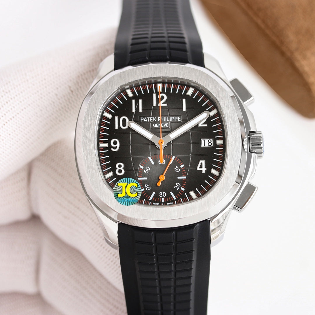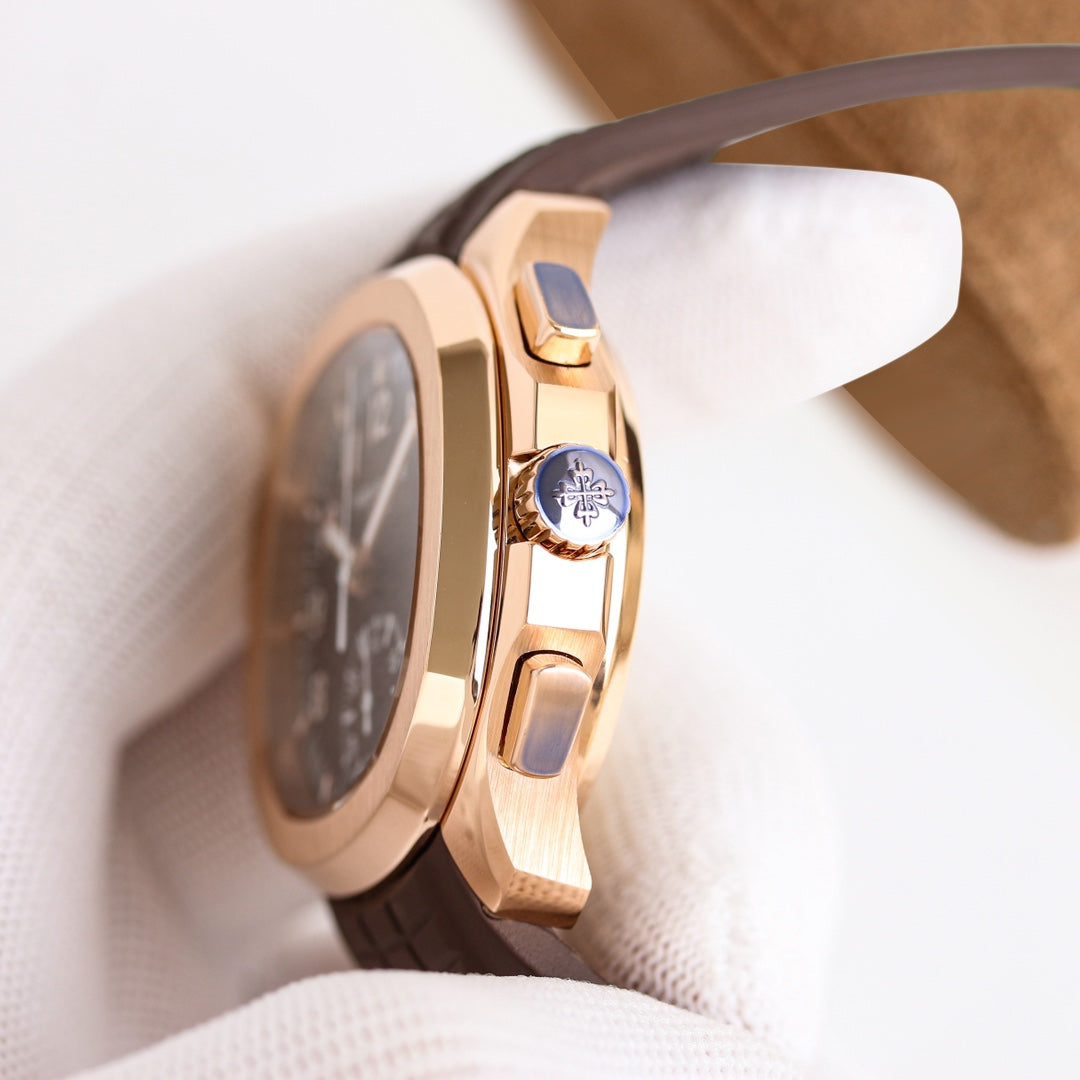 Top-quality replica 💰 Private message! Patek Philippe Aquanaut Series, Grenade Series Watch Model: 5968A-001) 1/4mm stainless steel case with chronograph hands, a peripheral rail-type scale accurate to a quarter second, and a 60-minute counter. The stainless steel case and rubber strap exude a stylish, sporty vibe. The case features a classic, rounded octagonal bezel with polished chamfers for a refined look. The lugs, polished on the front and brushed on the sides, are slightly curved, creating a natural curve that perfectly fits the wrist.
