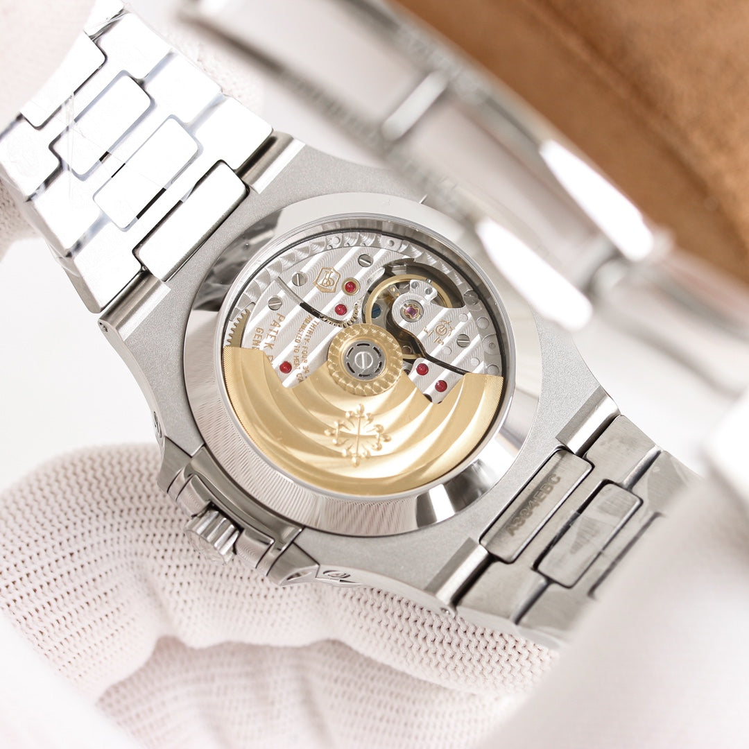 The Nautilus features a rotating case with a distinctive window design, consistent with the original's craftsmanship. The satin finish and polishing create a striking contrast, recreating every detail 1:1.