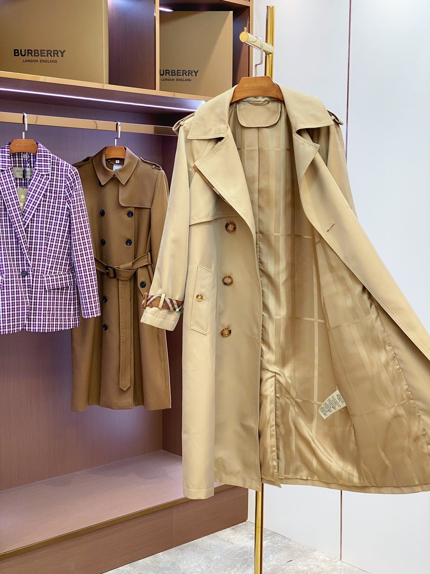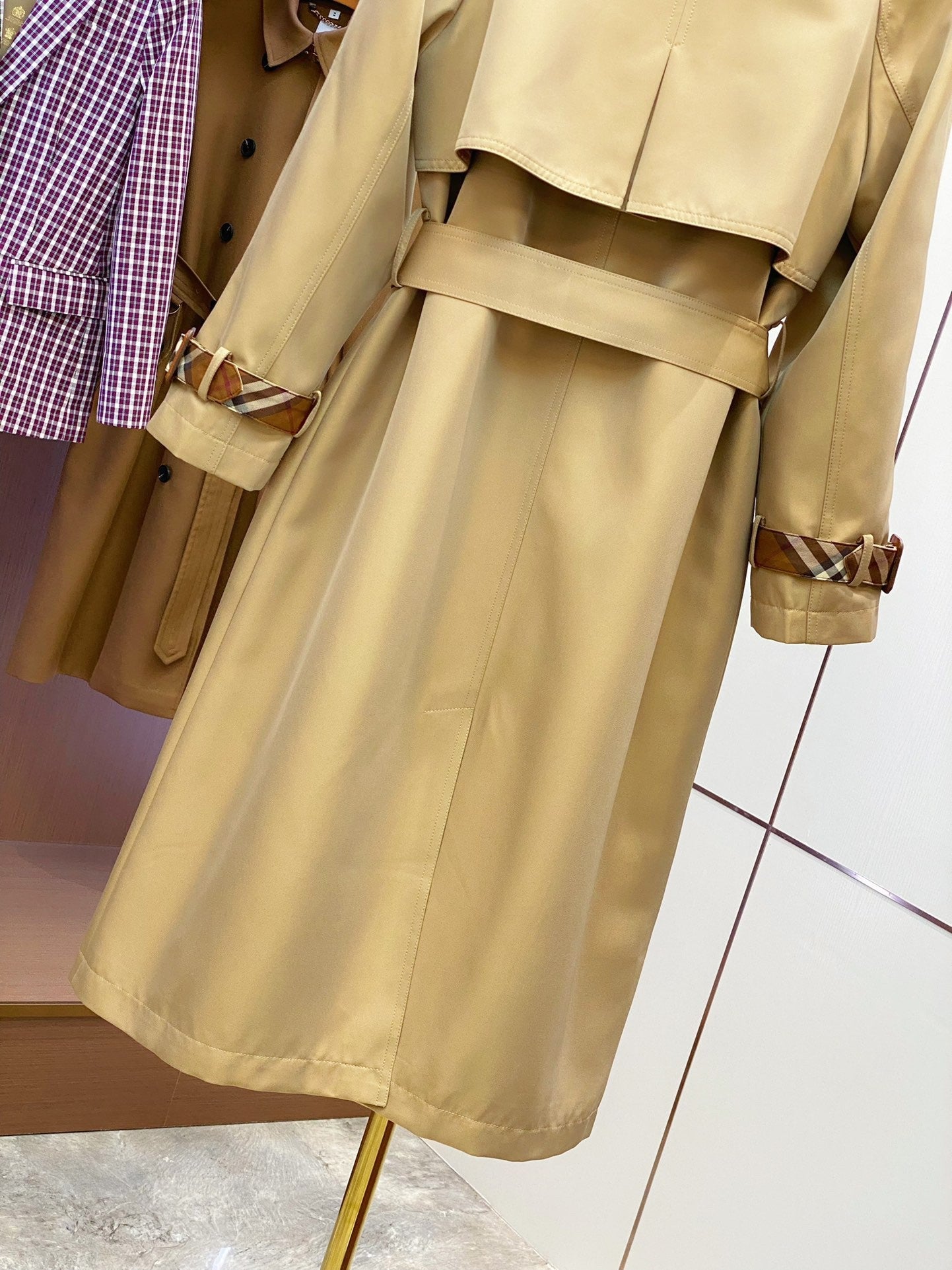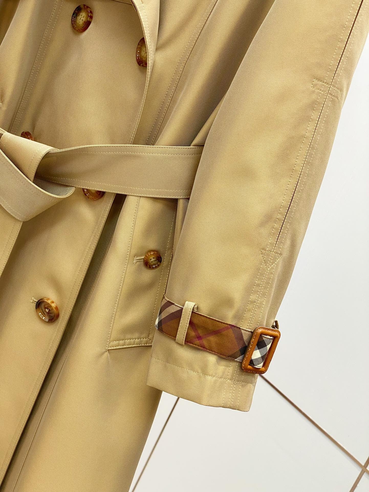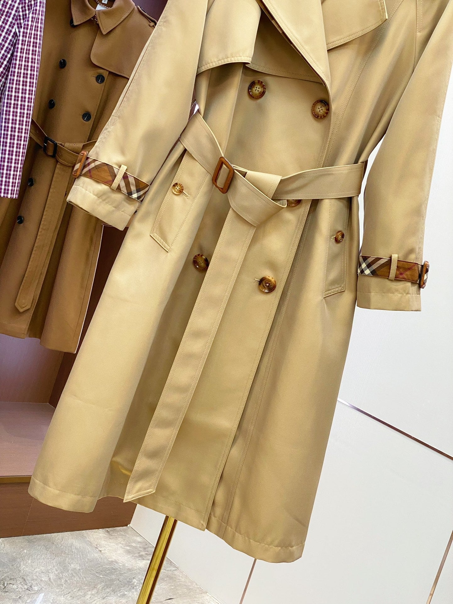 This trench coat features an overlapping collar, revealing a small area of plaid, showcasing classic BUR elements. The design is simple yet unique, creating a luxurious feel without lacking in signature style. The clean, fresh color combination makes it incredibly attractive!