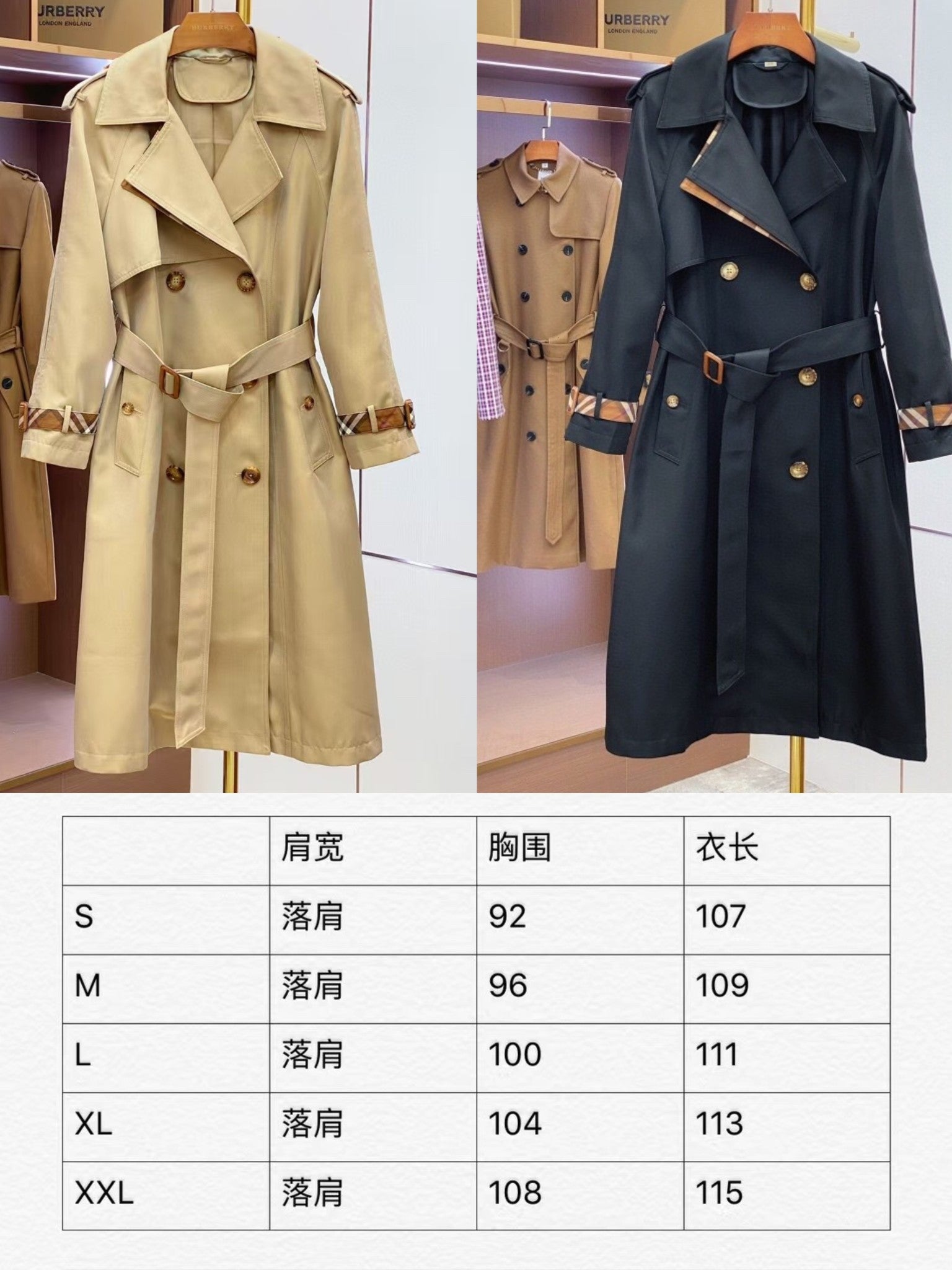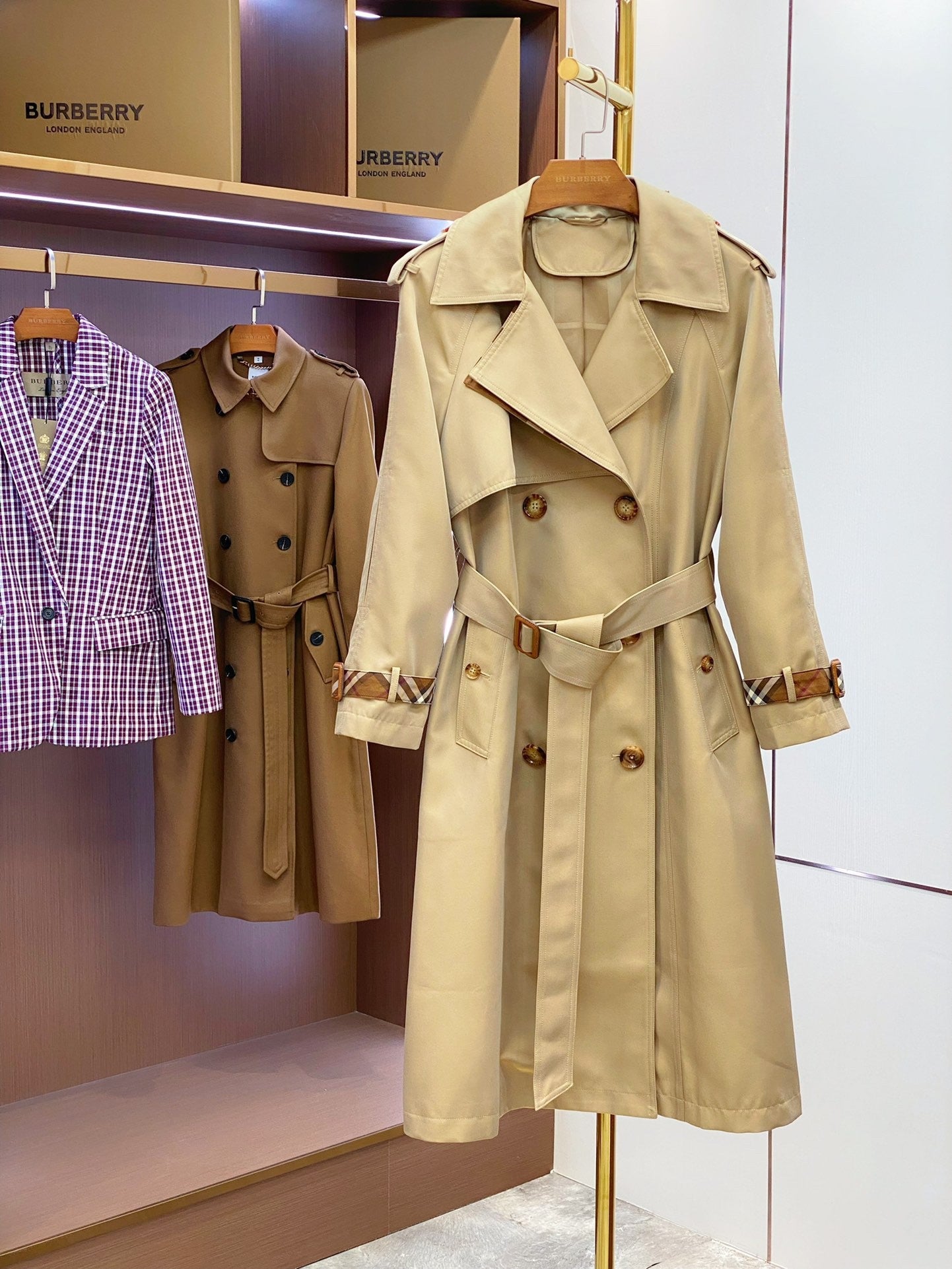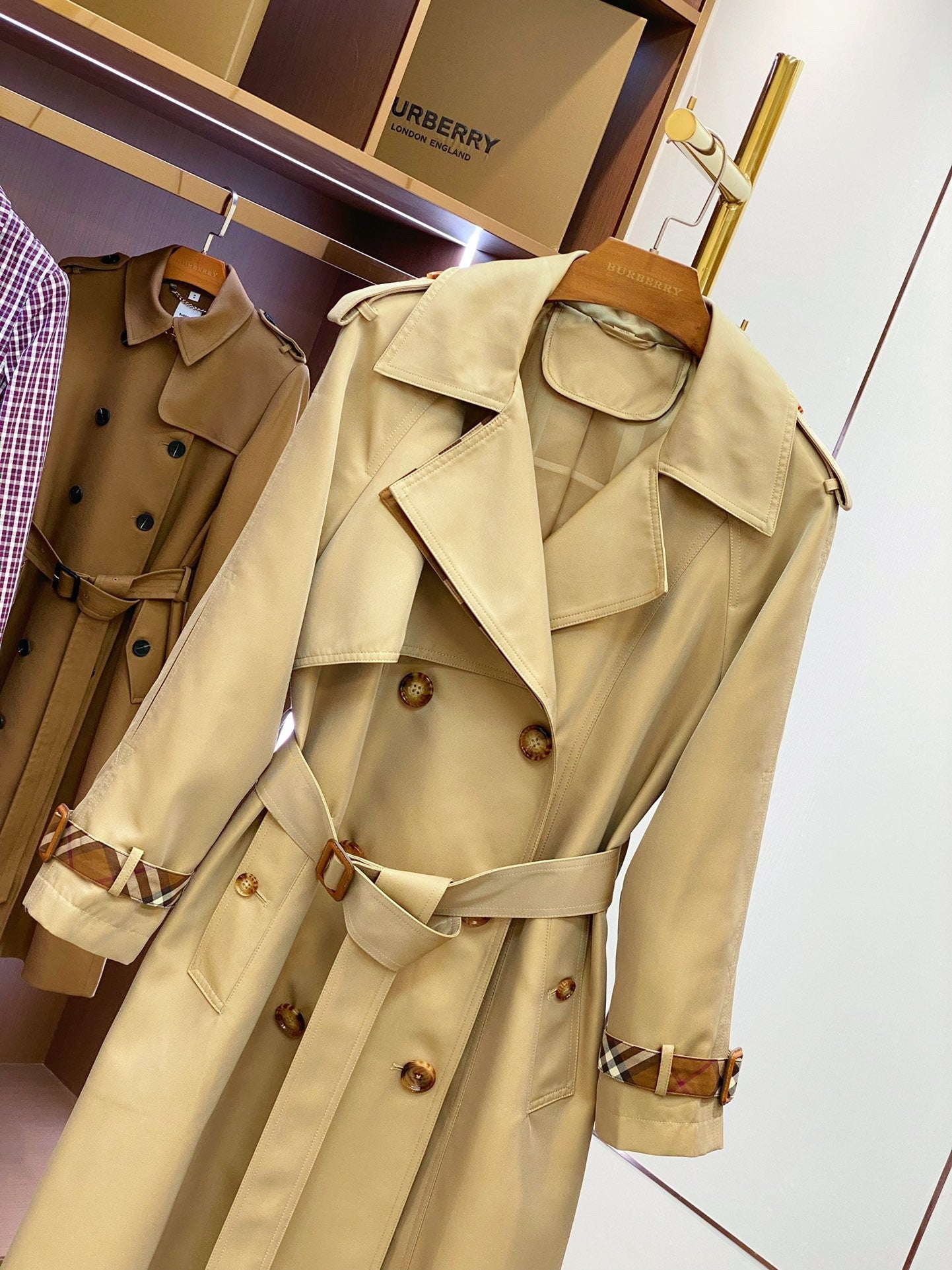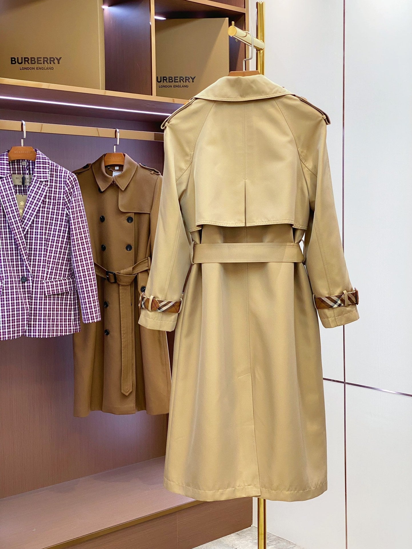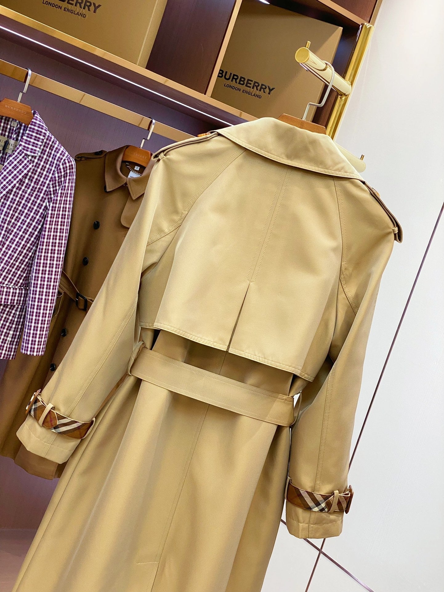 This trench coat features an overlapping collar, revealing a small area of plaid, showcasing classic BUR elements. The design is simple yet unique, creating a luxurious feel without lacking in signature style. The clean, fresh color combination makes it incredibly attractive!