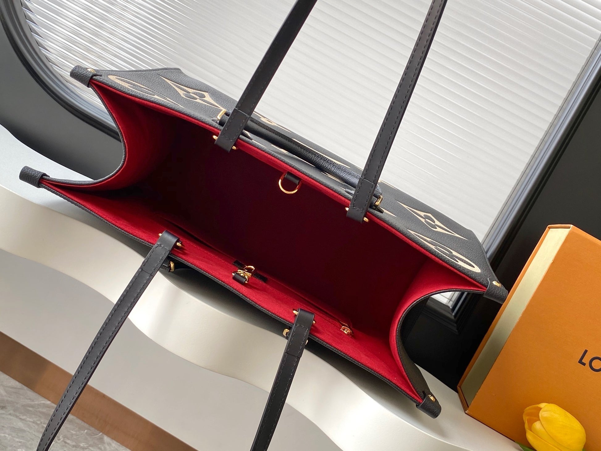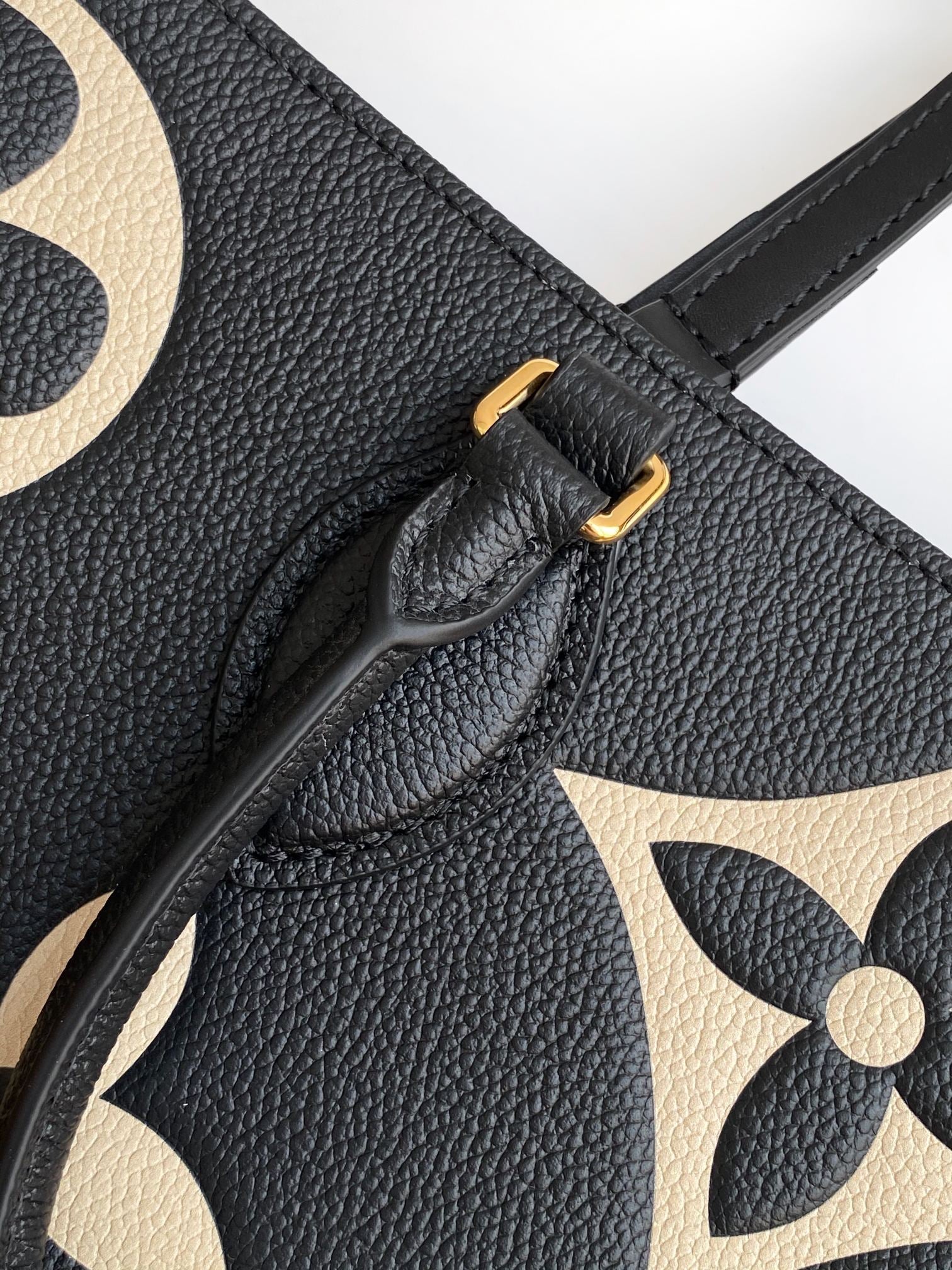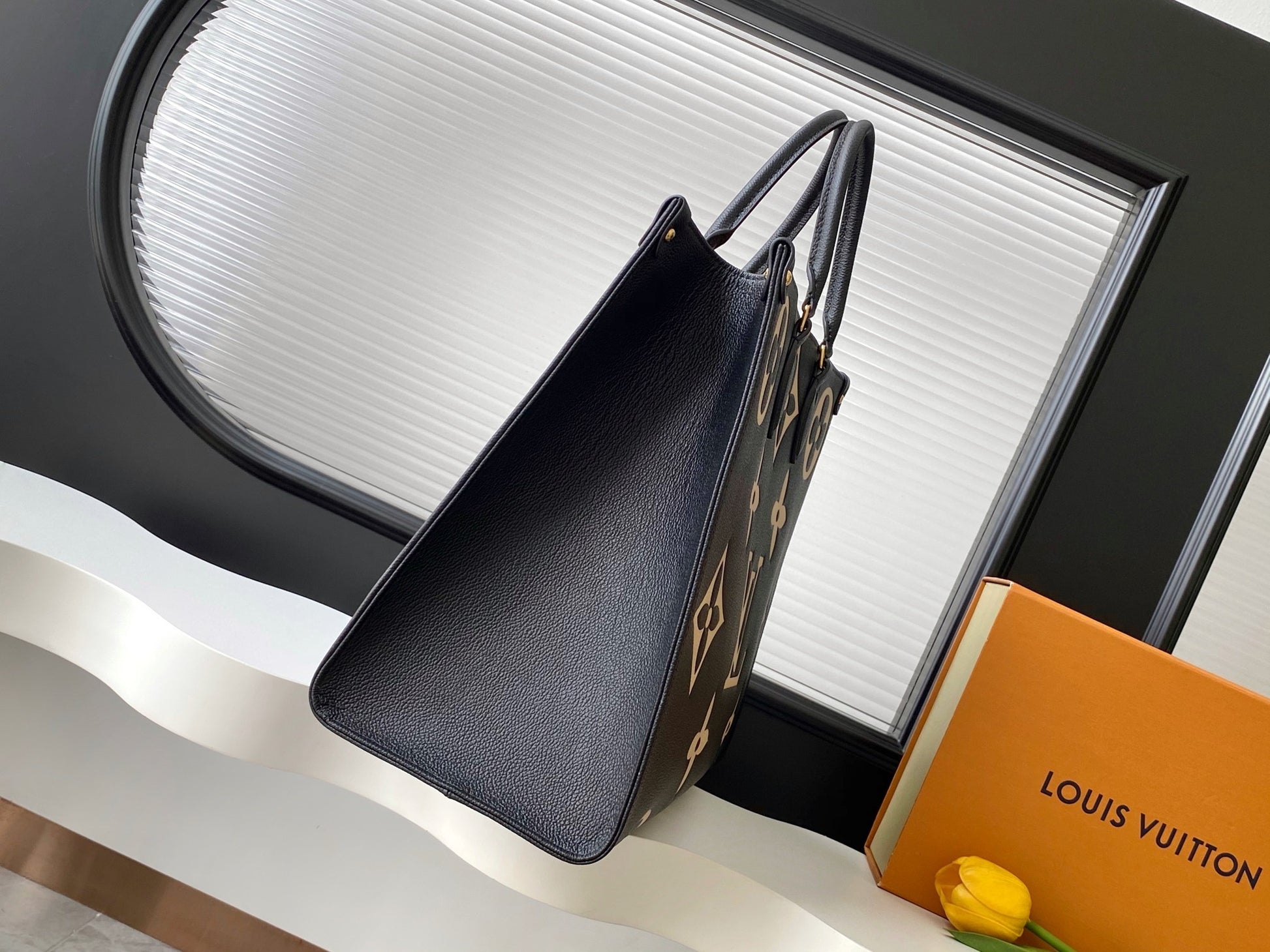 NTHEGO Large Handbag M45945 Black This OnTheGo handbag is made of Monogram Emeinte leather with embossed large Monogram flowers and L* letters. It is paired with Toron handles and a long shoulder strap, providing a variety of comfortable carrying methods for business occasions, casual shopping or travel. Size: 41x34x19cm