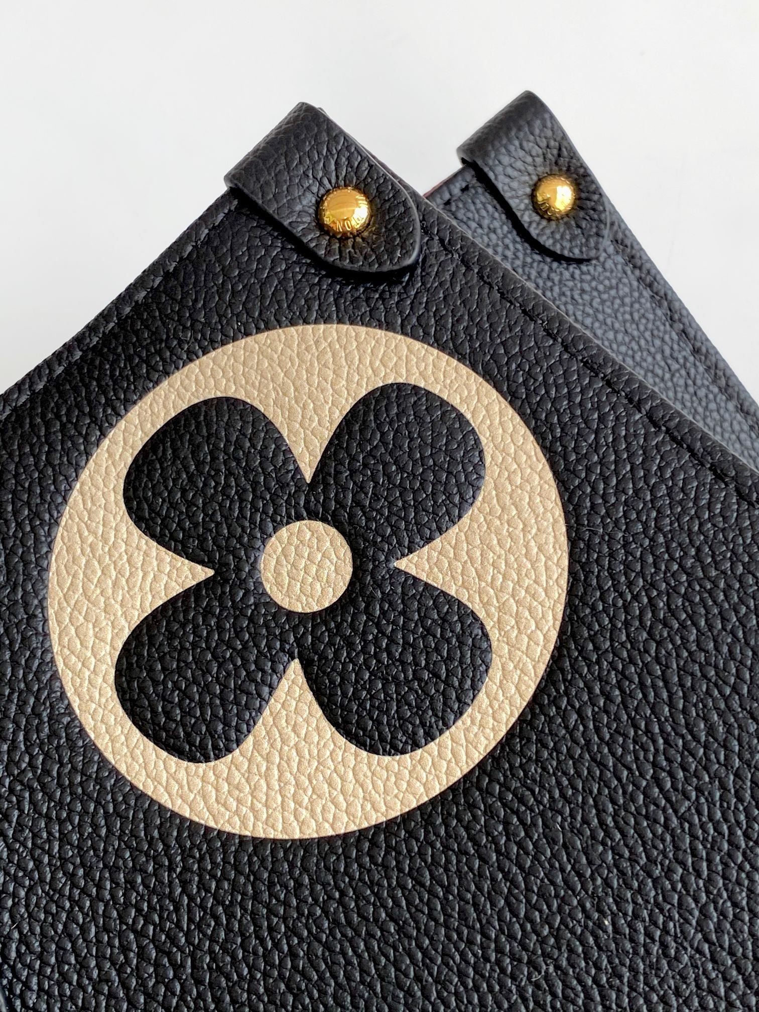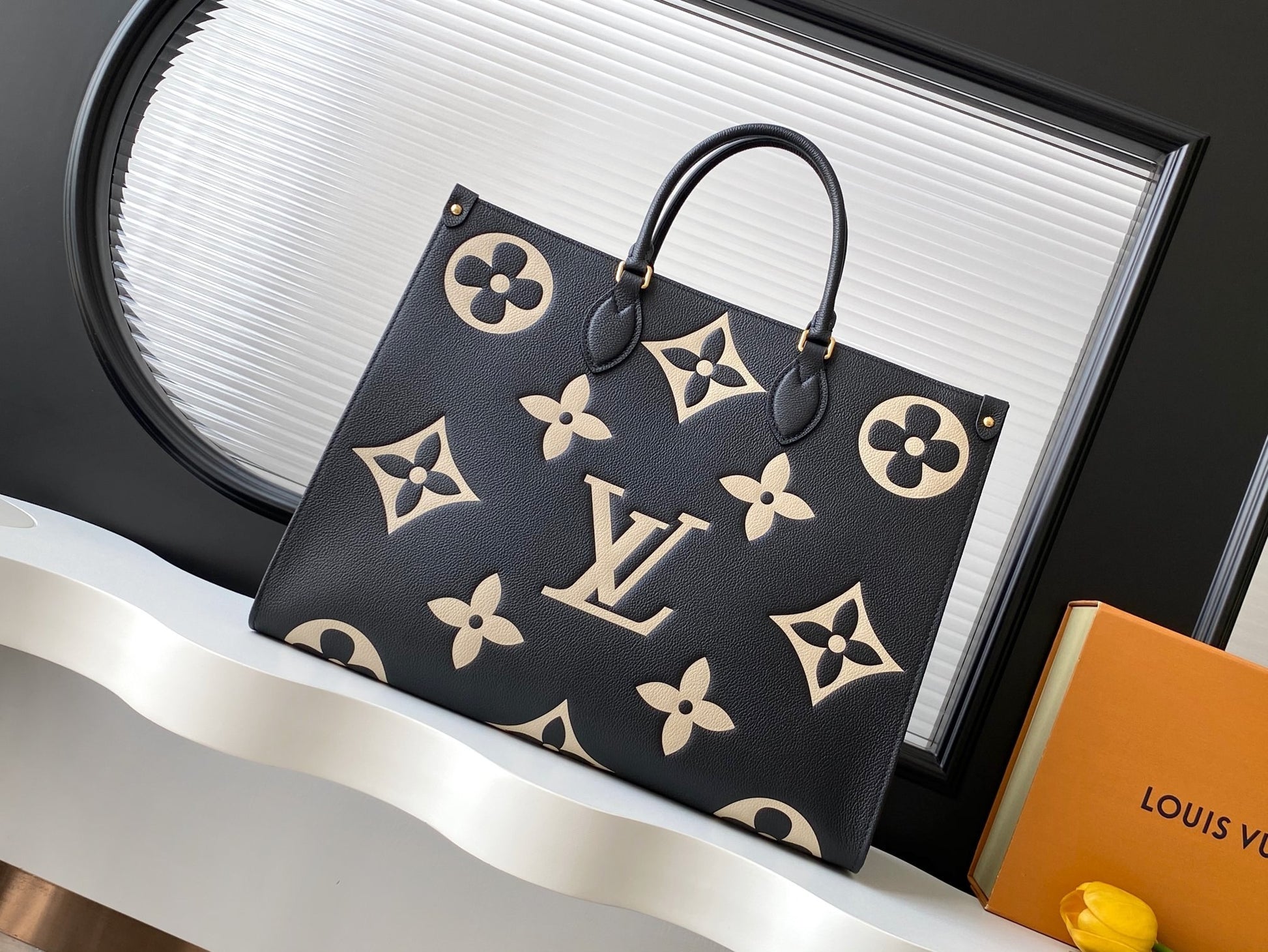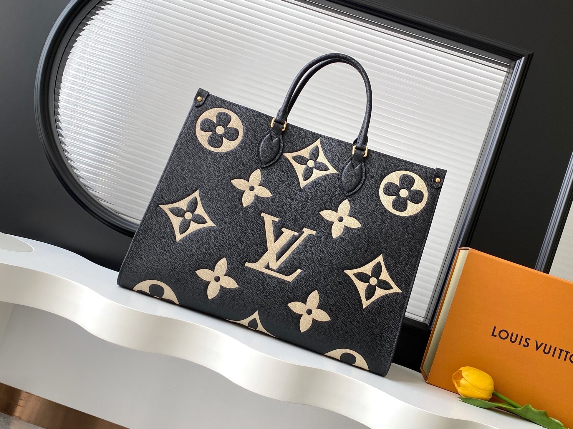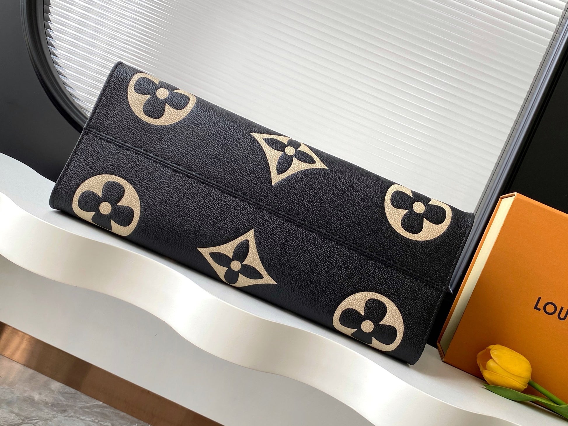 NTHEGO Large Handbag M45945 Black This OnTheGo handbag is made of Monogram Emeinte leather with embossed large Monogram flowers and L* letters. It is paired with Toron handles and a long shoulder strap, providing a variety of comfortable carrying methods for business occasions, casual shopping or travel. Size: 41x34x19cm