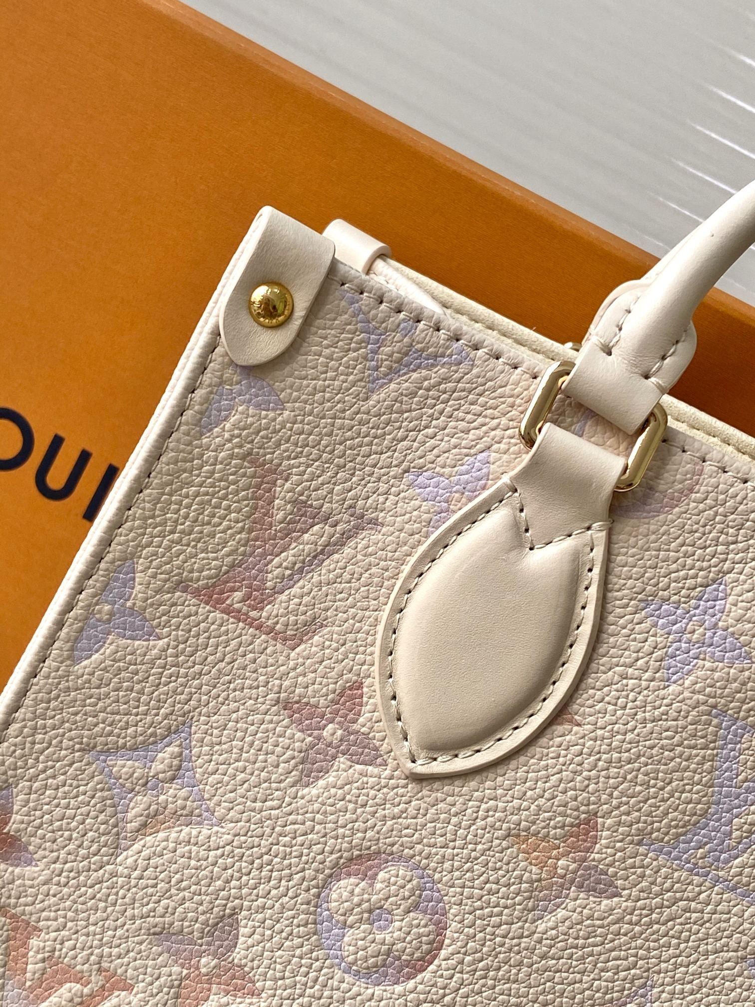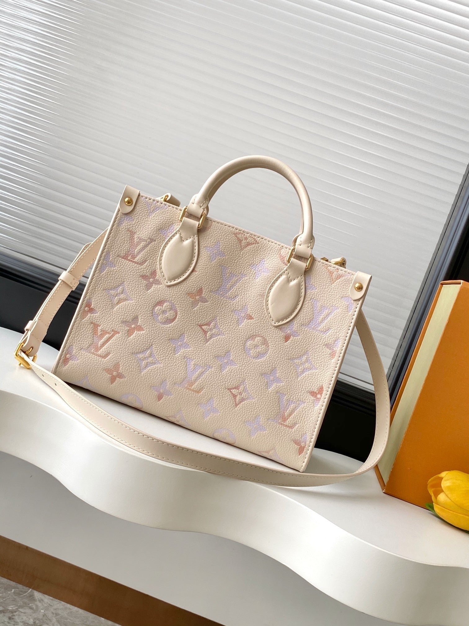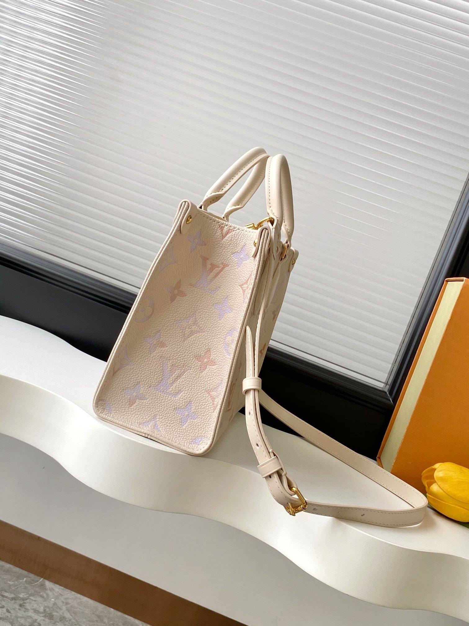 [Dynamic 163c Chip, Premium Original Enhanced Edition] Off-White Gradient Leather Square Bag. New for the season: ONTHEGO Small Handbag. This OnTheGo Small Handbag, from the Dream collection, features an elegant design that enhances any look. Monogram Emeinte leather is combined with a digital print technique to create a subtle gradient watercolor effect. Dazzling hardware and multiple pockets enrich the details, while a slender shoulder strap allows for cross-body wear. 19 x 11.5 x 25 cm.