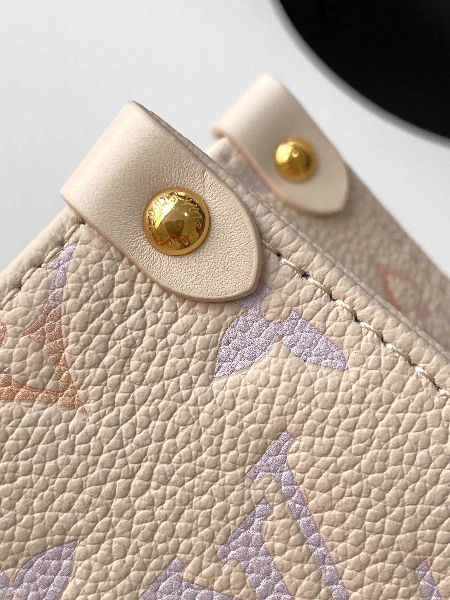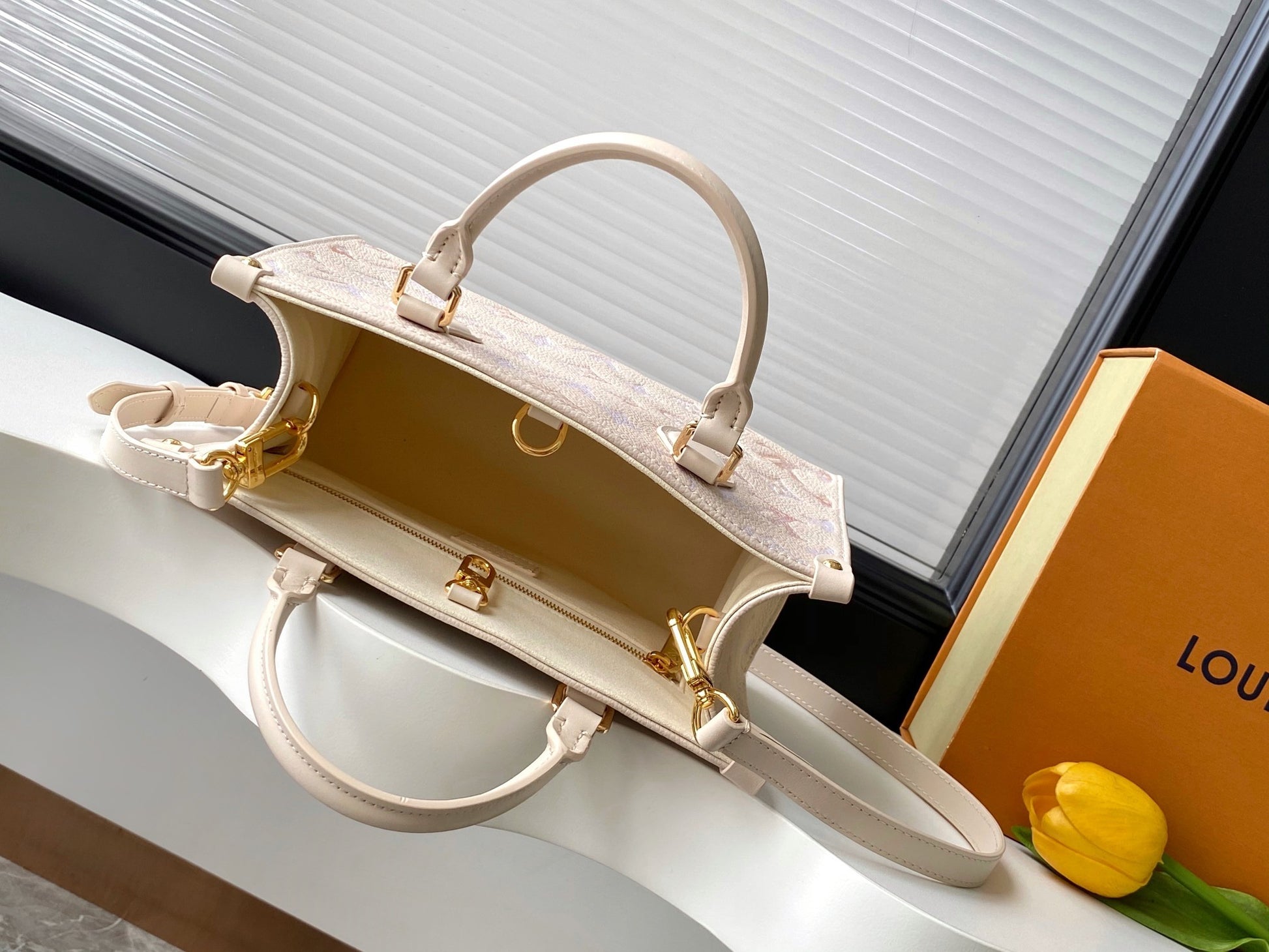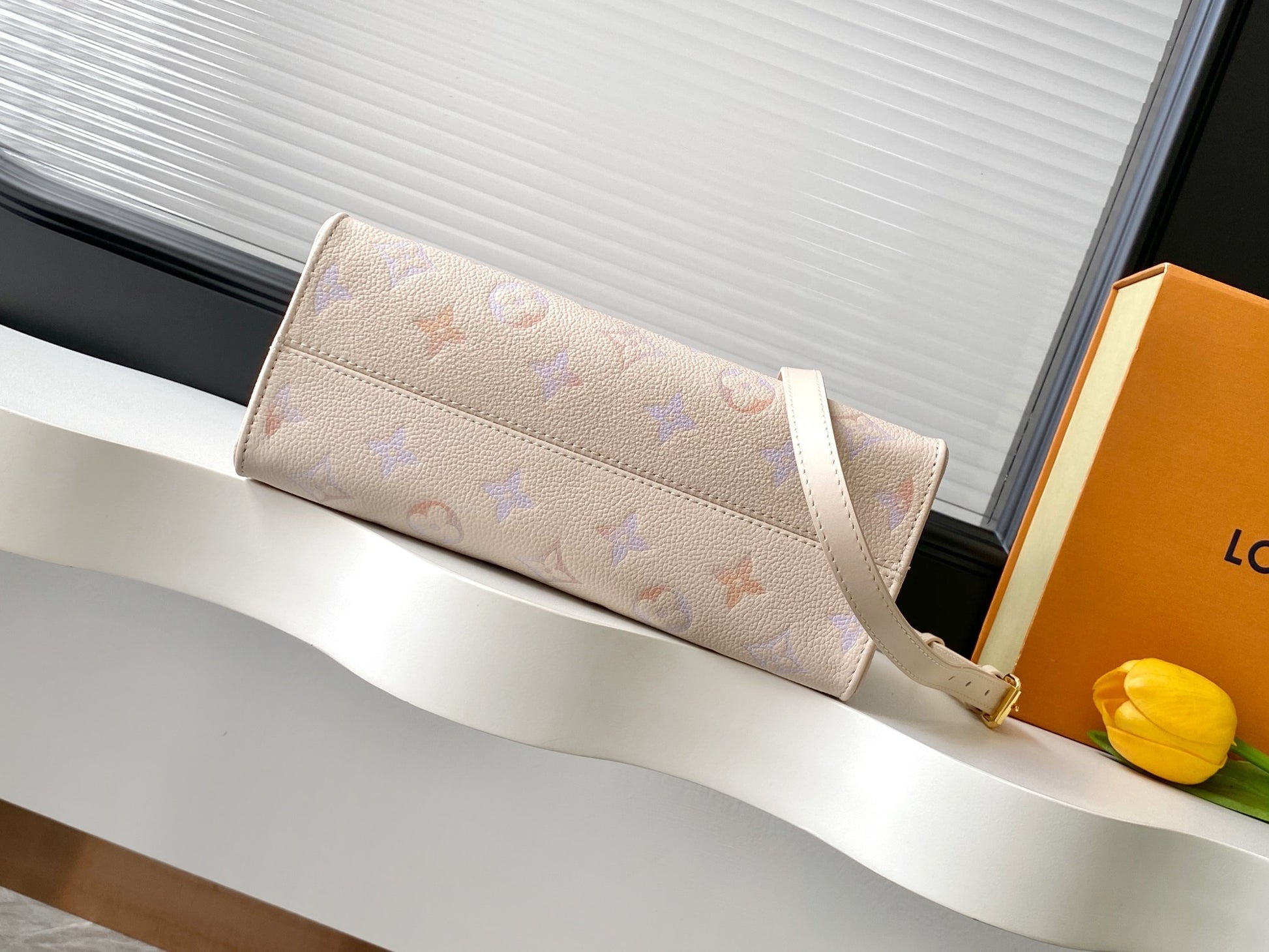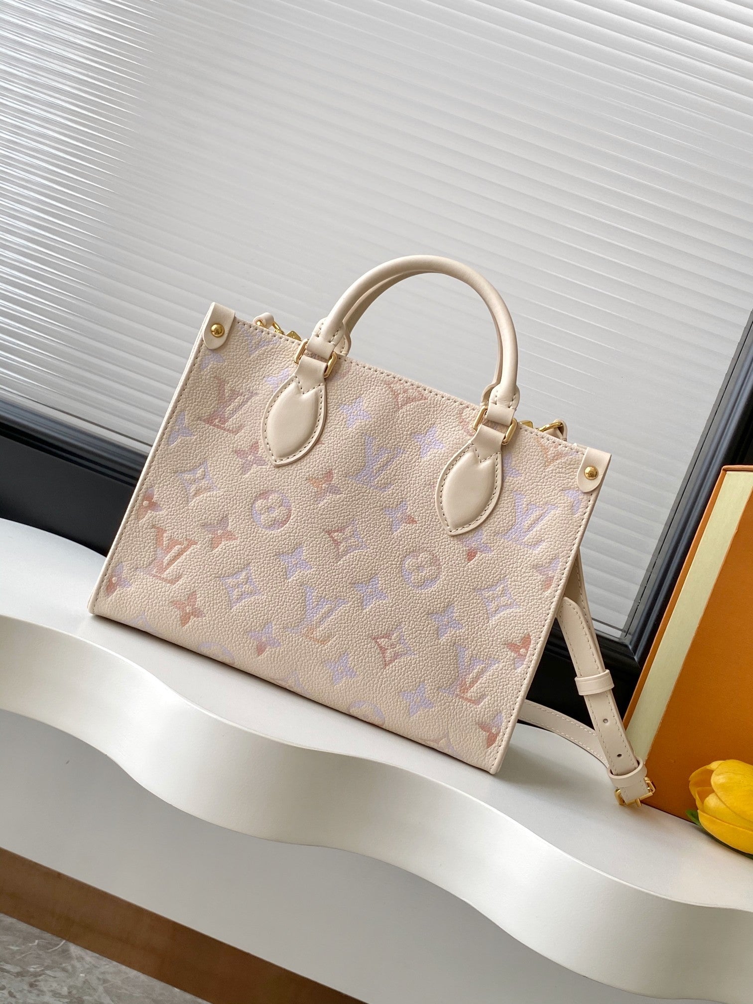 [Dynamic 163c Chip, Premium Original Enhanced Edition] Off-White Gradient Leather Square Bag. New for the season: ONTHEGO Small Handbag. This OnTheGo Small Handbag, from the Dream collection, features an elegant design that enhances any look. Monogram Emeinte leather is combined with a digital print technique to create a subtle gradient watercolor effect. Dazzling hardware and multiple pockets enrich the details, while a slender shoulder strap allows for cross-body wear. 19 x 11.5 x 25 cm.