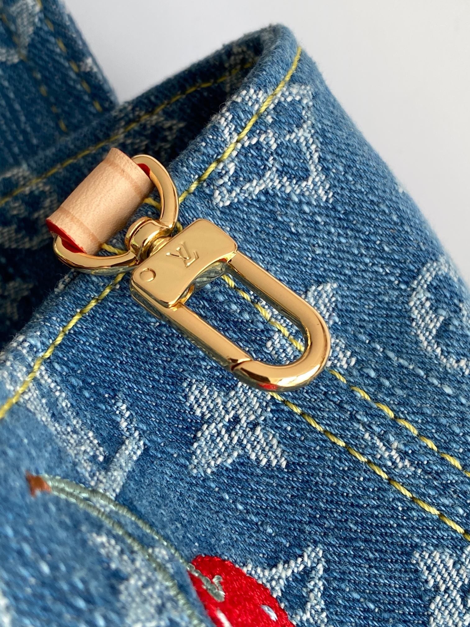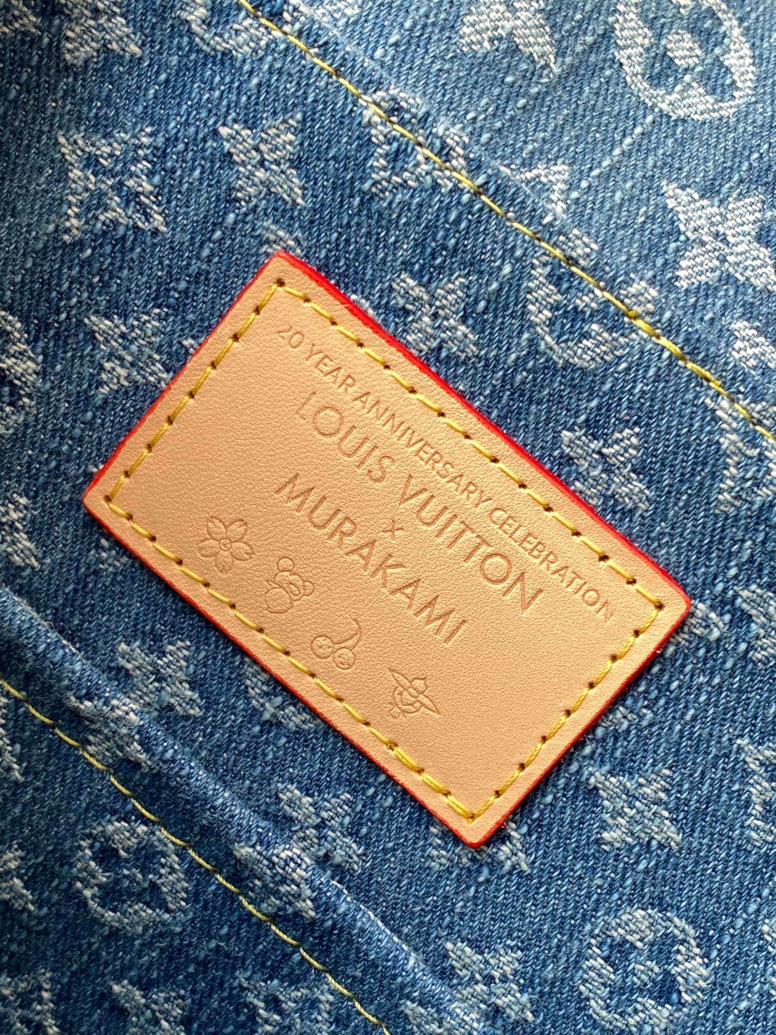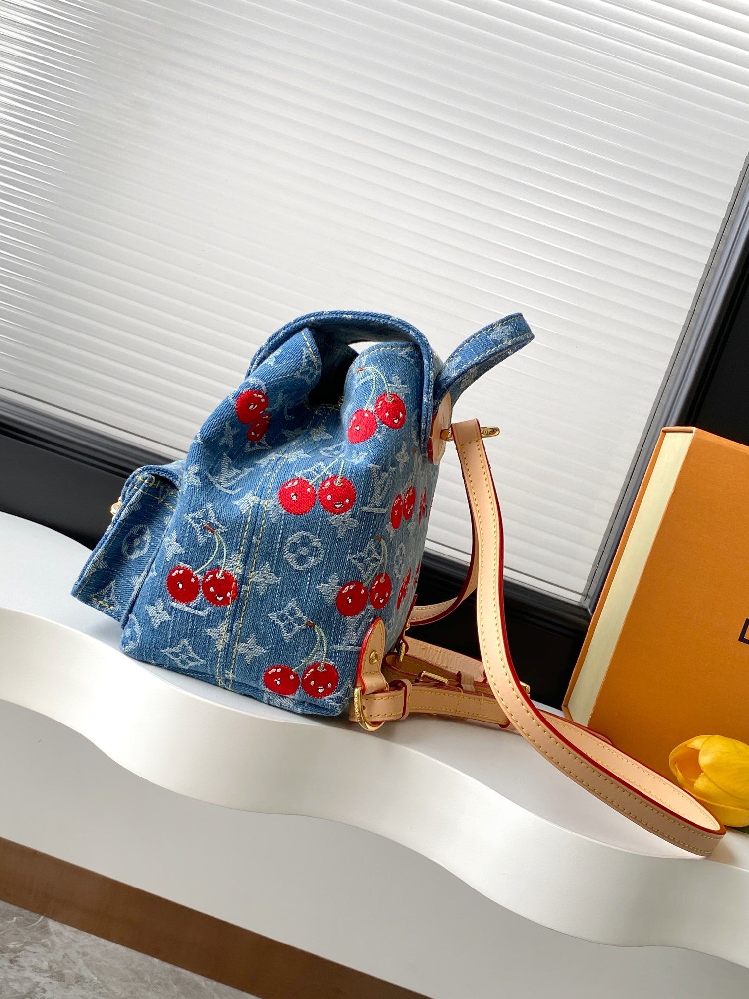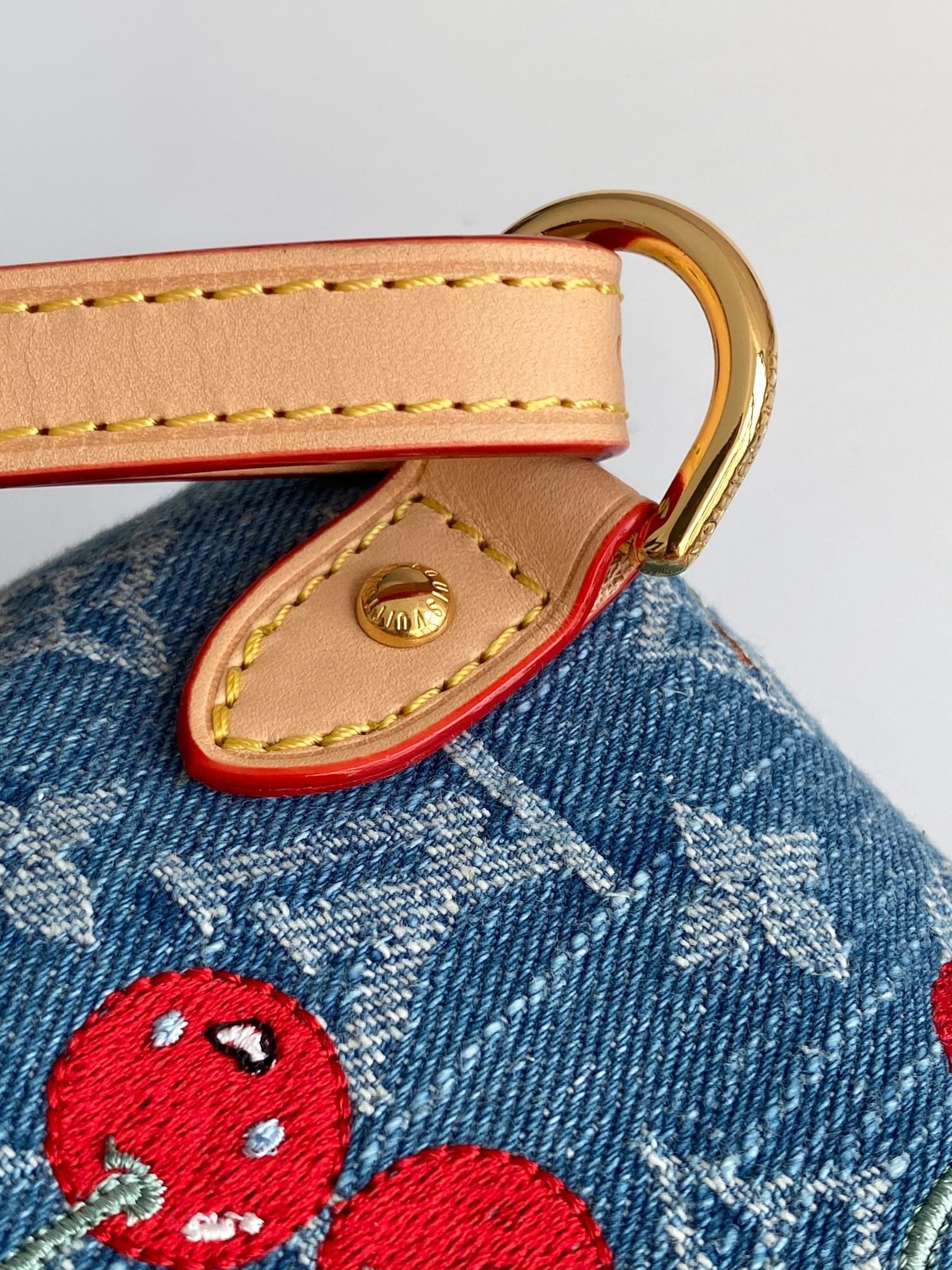 This Venice bag, from the Louis Vuitton x Takashi Murakami collection, features Monogram denim embroidered with unique cherry embroidery, capturing the vibrant colors of the Japanese artist's brushstrokes with playful brushstrokes. Fine leather outlines the slender shoulder straps, while gleaming buckles illuminate the flap and exterior pockets. 24.0 x 26.0 x 7.0 cm (L x H x W)