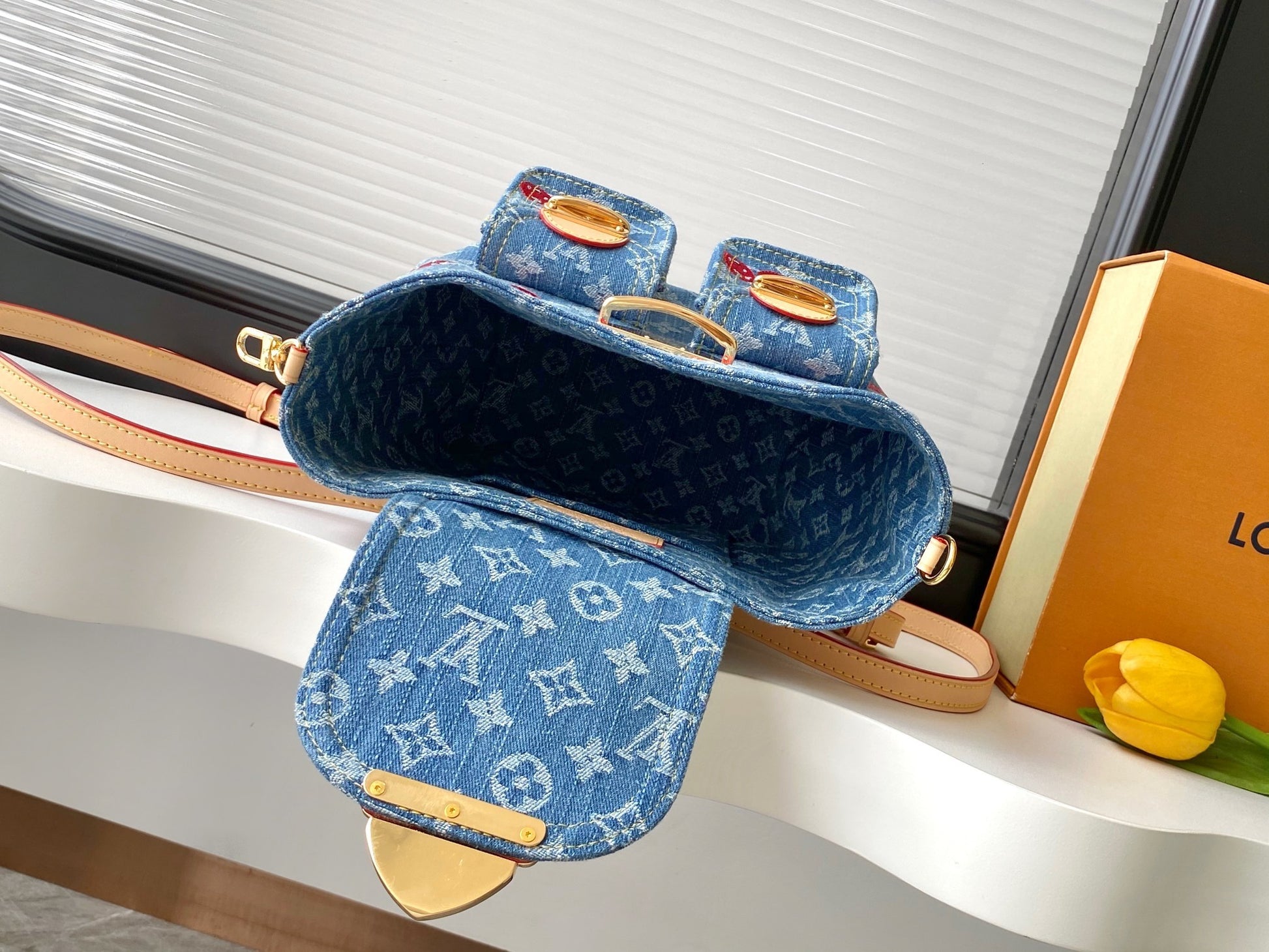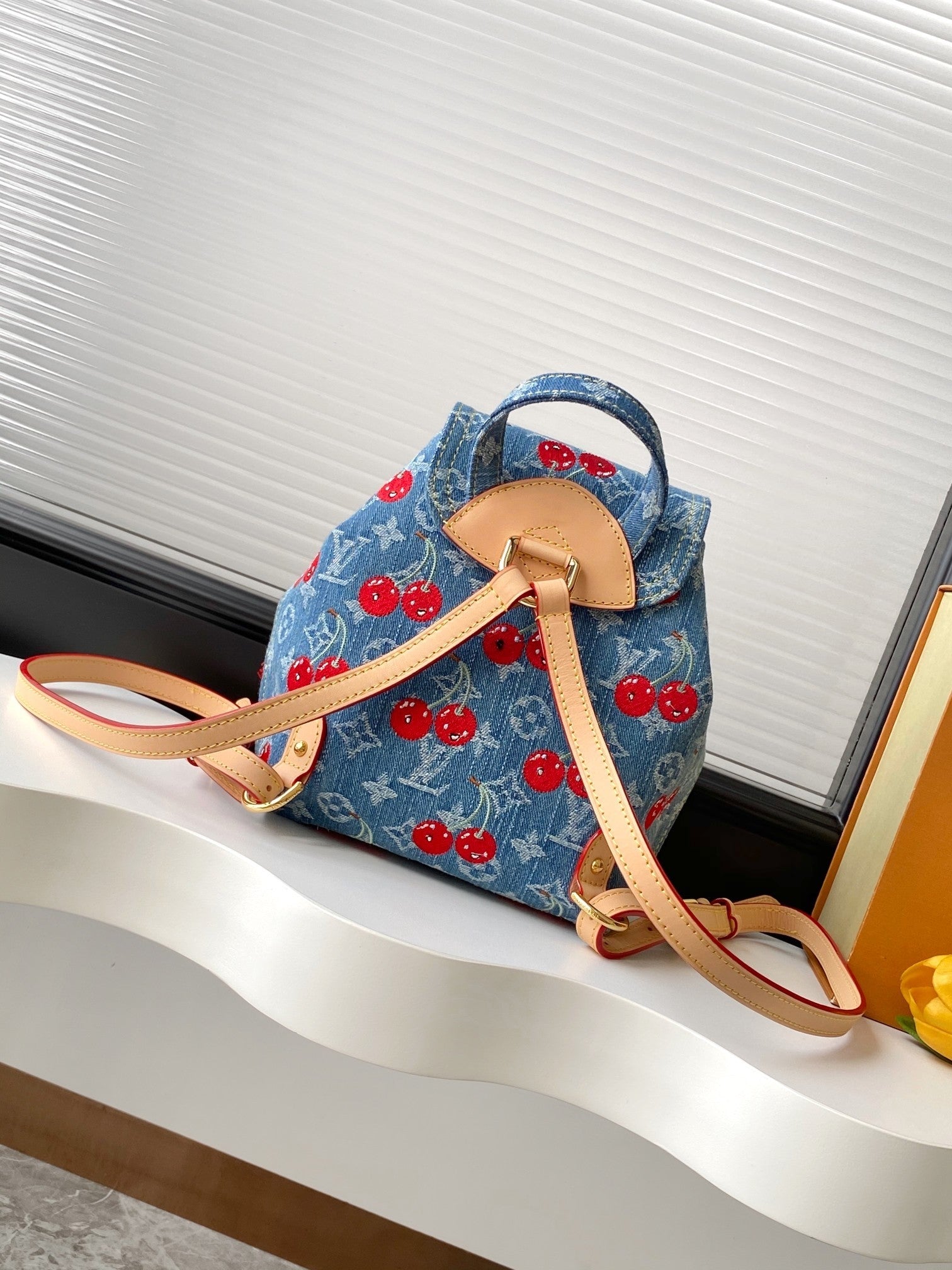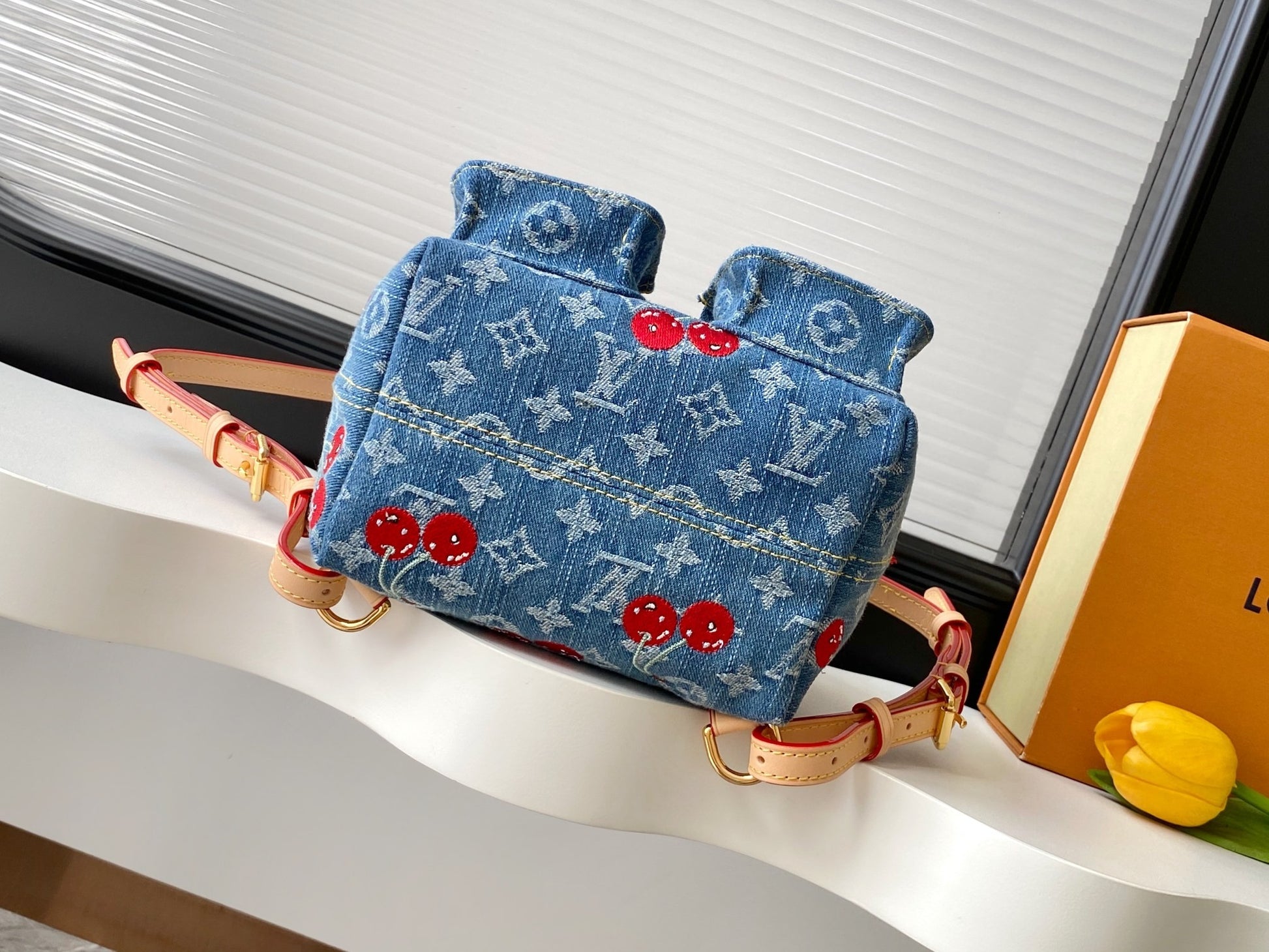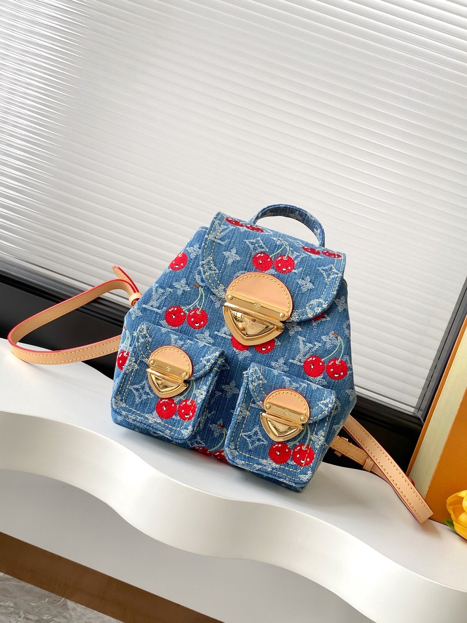 This Venice bag, from the Louis Vuitton x Takashi Murakami collection, features Monogram denim embroidered with unique cherry embroidery, capturing the vibrant colors of the Japanese artist's brushstrokes with playful brushstrokes. Fine leather outlines the slender shoulder straps, while gleaming buckles illuminate the flap and exterior pockets. 24.0 x 26.0 x 7.0 cm (L x H x W)