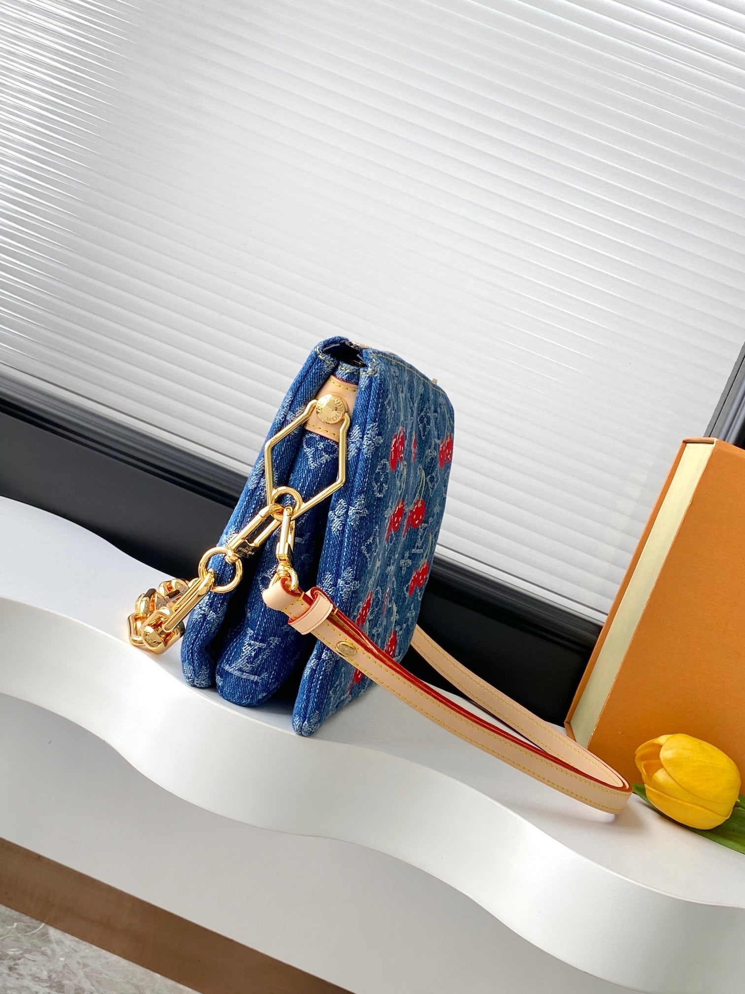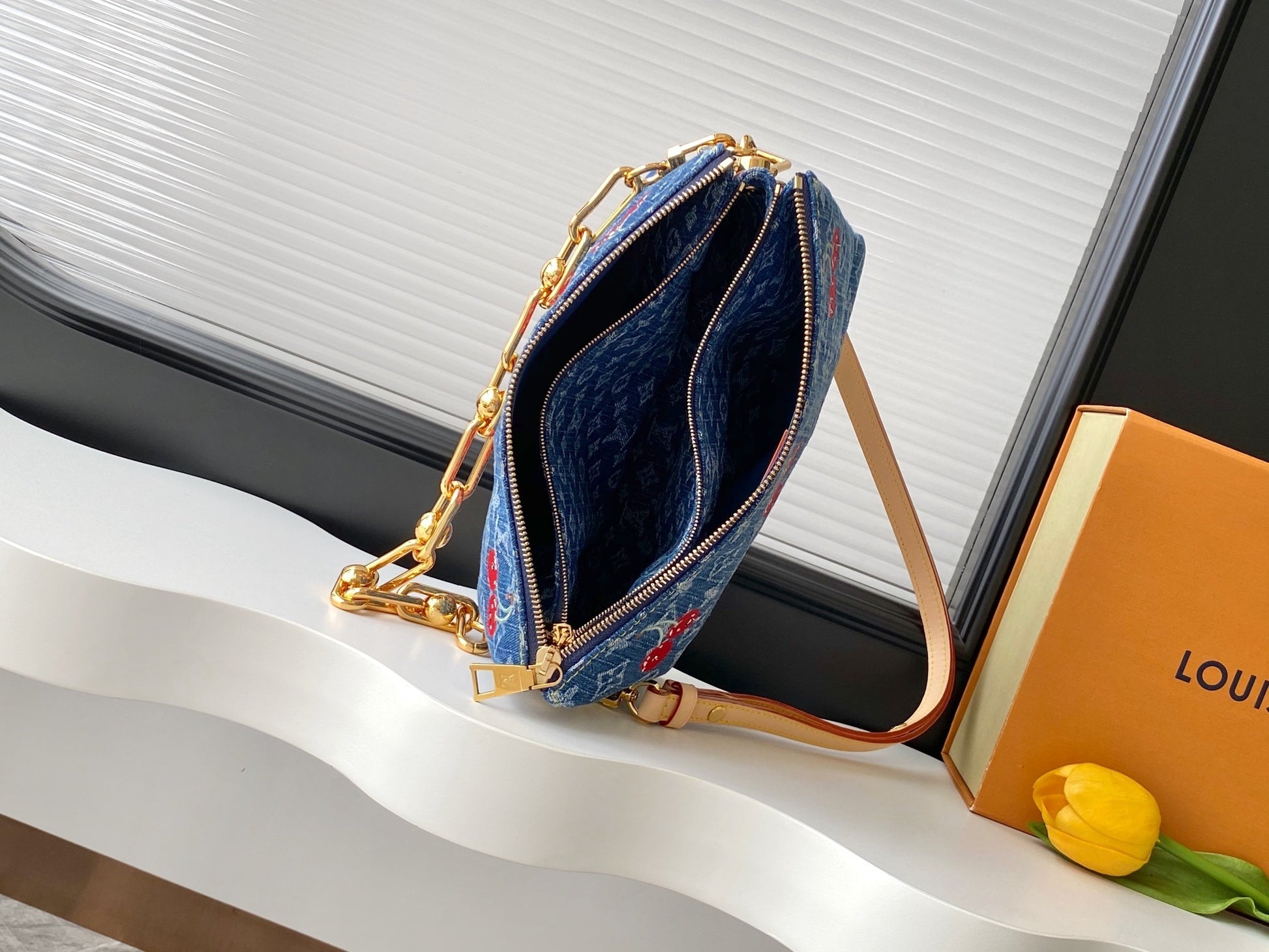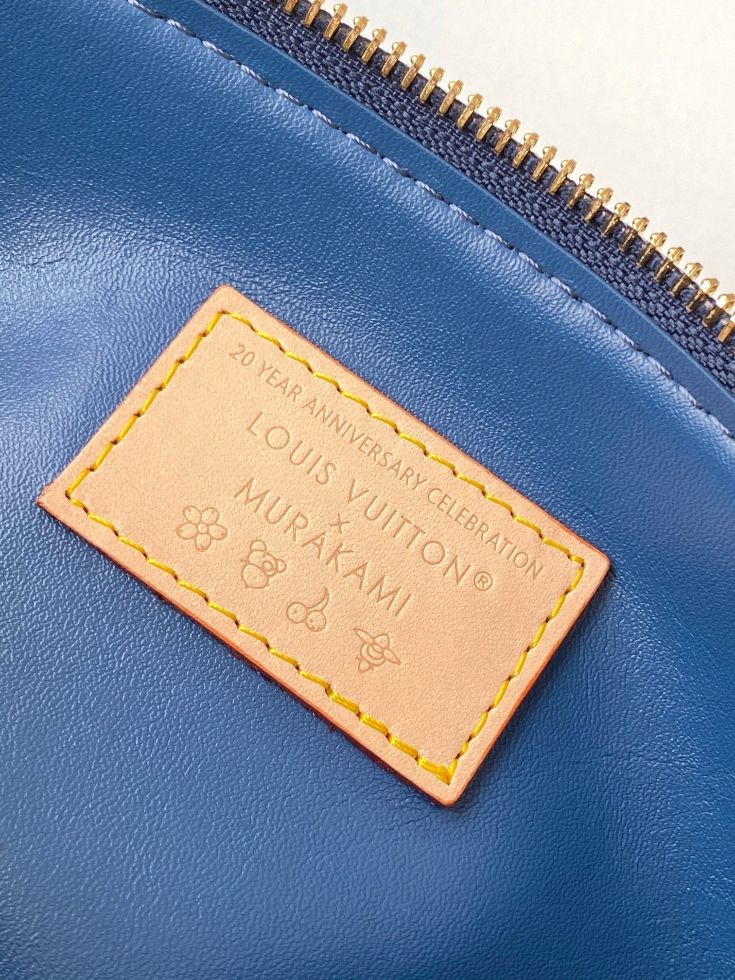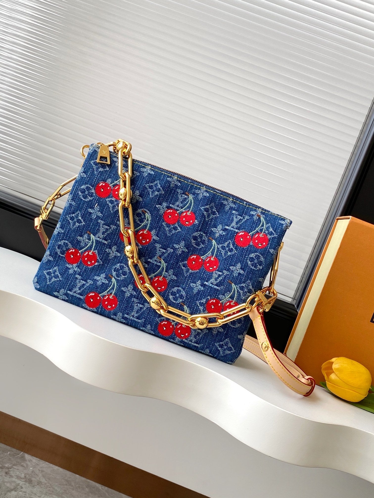 [Dynamic 163c Chip, Premium Original Enhanced Edition] This small Coussin bag from the Louis Vuitton x Takashi Murakami collection features Monogram denim embroidered with a vibrant cherry pattern, showcasing the Japanese artist's playful brushstrokes. A detachable chain and adjustable leather shoulder strap offer flexible carrying options, with ample space for your smartphone and other essentials. 26.0 x 20.0 x 12.0 cm (L x H x W)