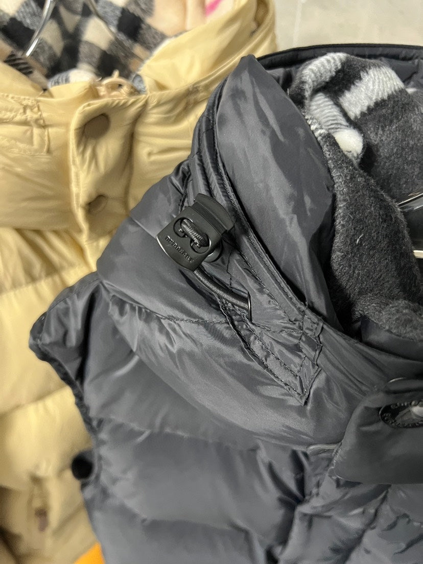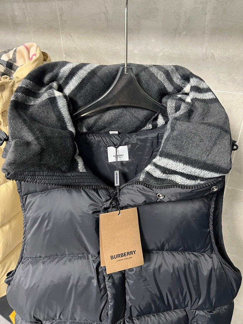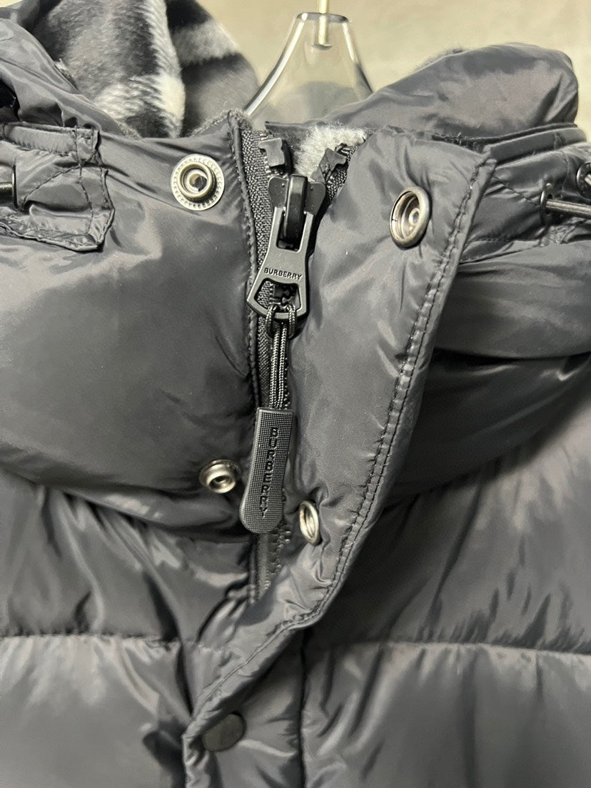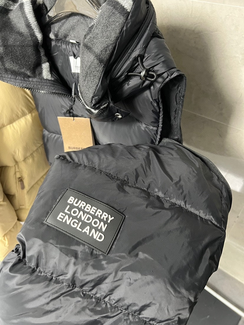 This fall/winter style, also worn by Zhou Dongyu, features a hooded down jacket with detachable sleeves. This is an exclusive custom-made jacket, developed with the utmost care and authenticity. The high collar and hood, lined with a vintage plaid, are adorned with detachable sleeves, creating a vest-like silhouette. This down jacket is incredibly comfortable, warm, and practical. Highly recommended. Features snap fastenings and a concealed two-way zipper. Drawstring hood and hem. Detachable sleeves. Burberry* 3D silicone logo plaque on the shoulder.