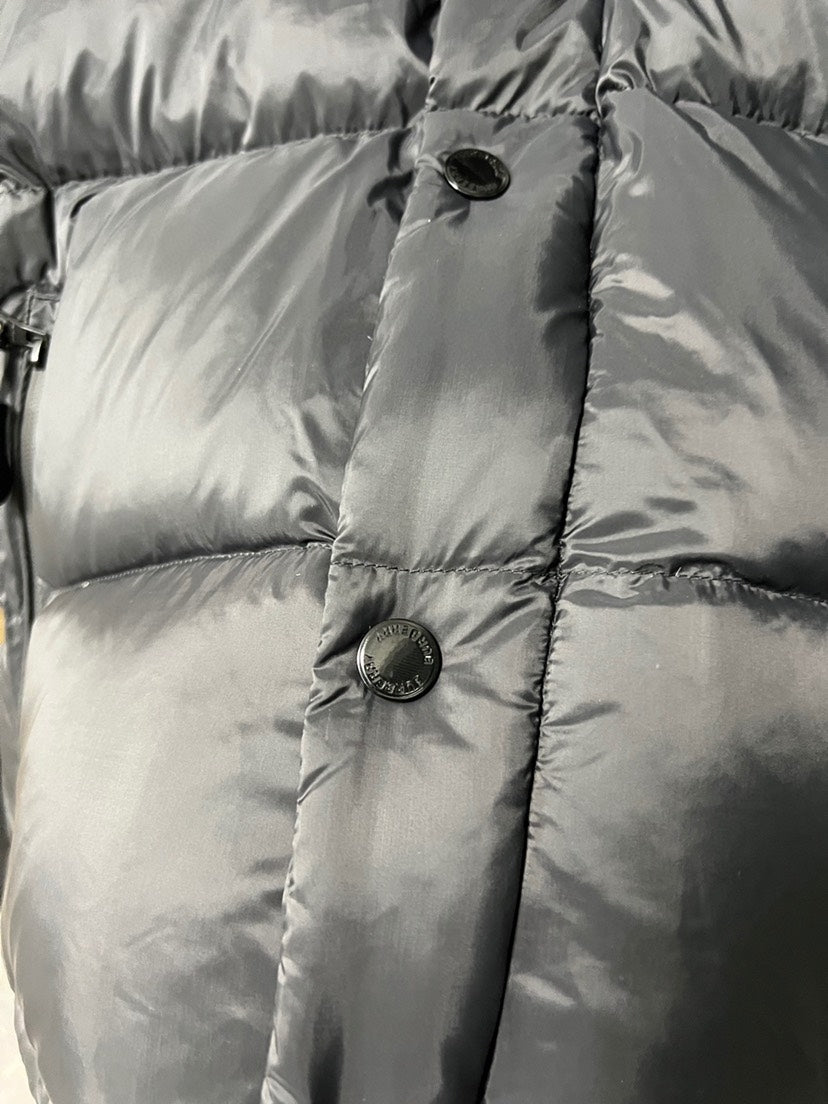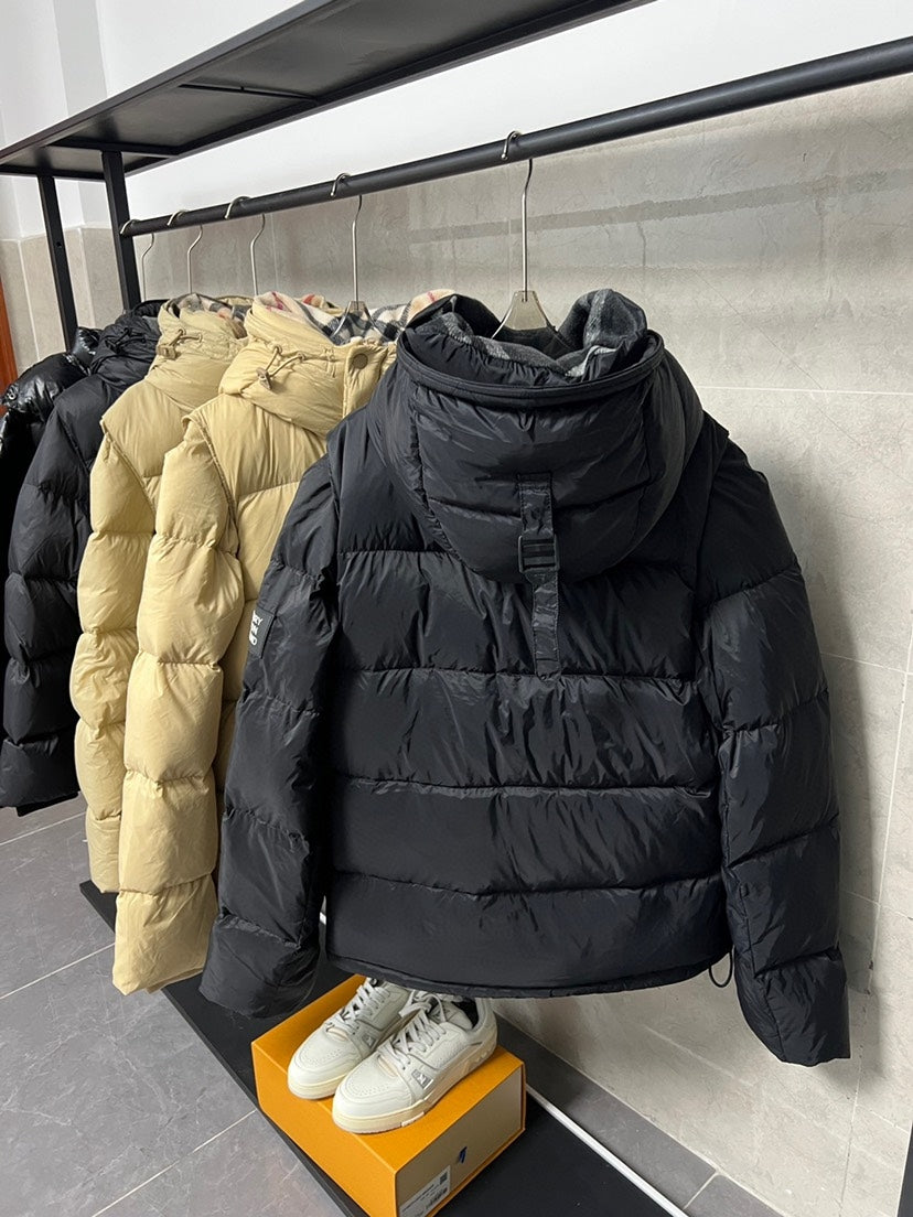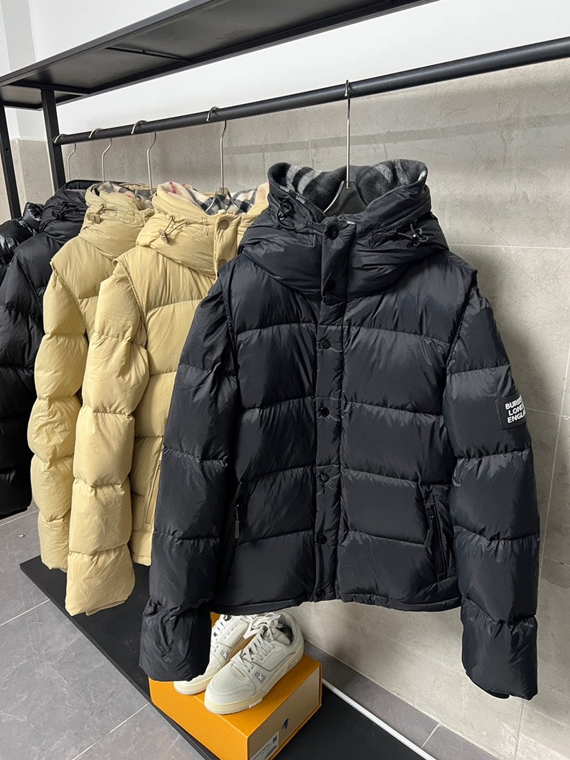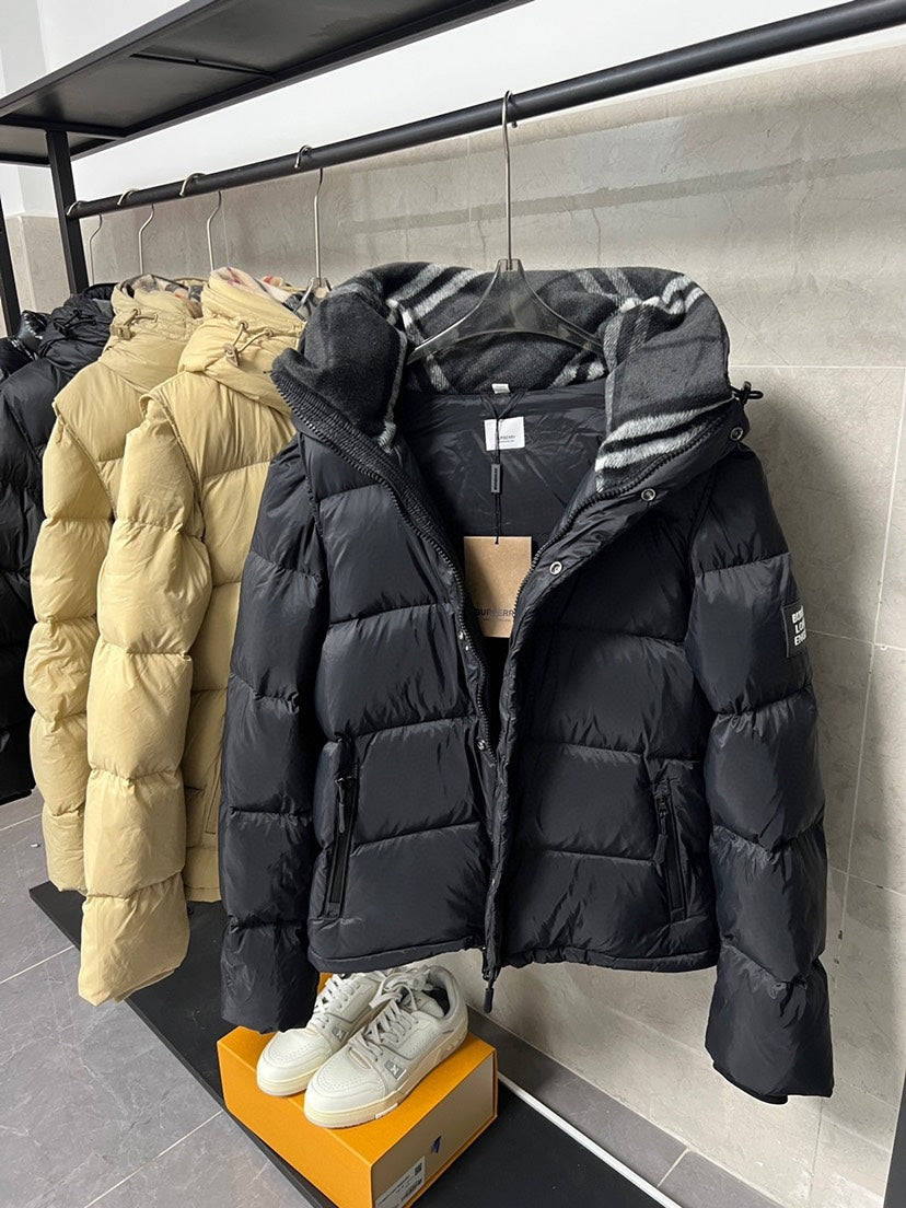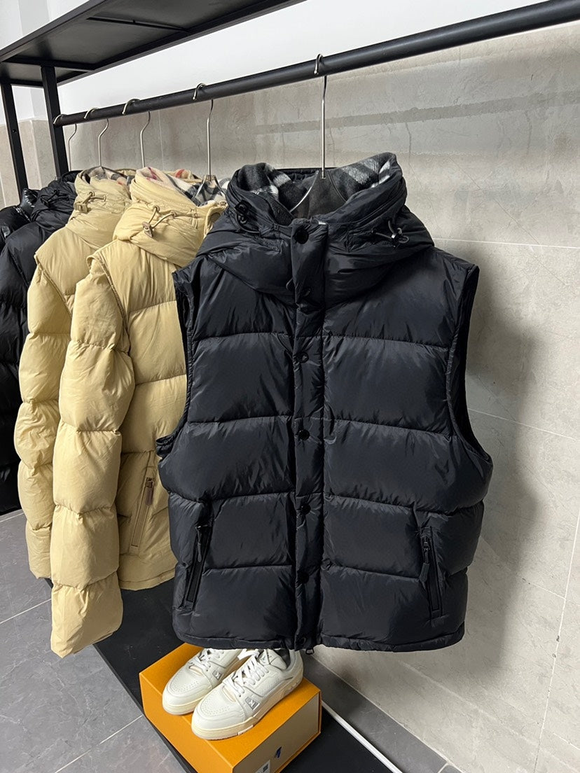 This fall/winter style, also worn by Zhou Dongyu, features a hooded down jacket with detachable sleeves. This is an exclusive custom-made jacket, developed with the utmost care and authenticity. The high collar and hood, lined with a vintage plaid, are adorned with detachable sleeves, creating a vest-like silhouette. This down jacket is incredibly comfortable, warm, and practical. Highly recommended. Features snap fastenings and a concealed two-way zipper. Drawstring hood and hem. Detachable sleeves. Burberry* 3D silicone logo plaque on the shoulder.