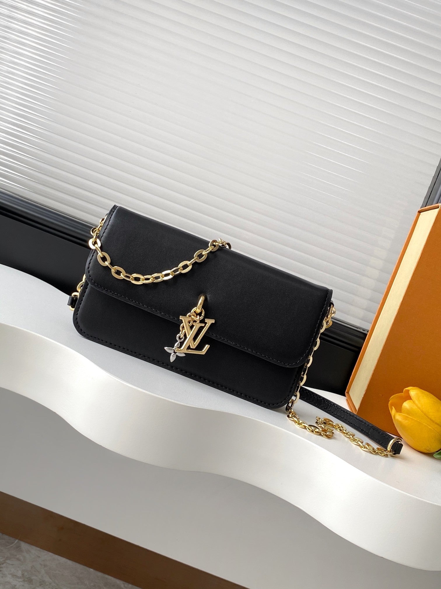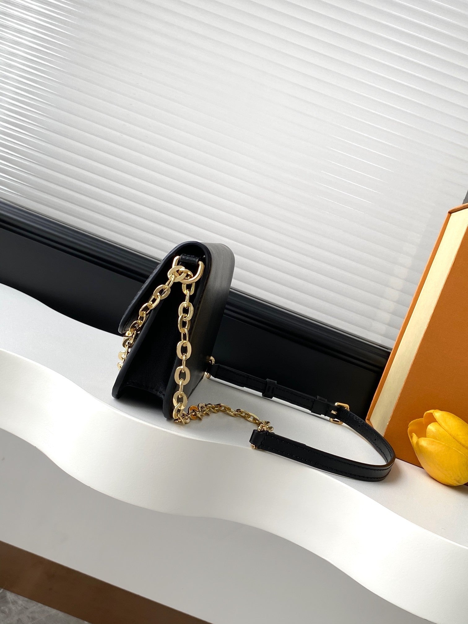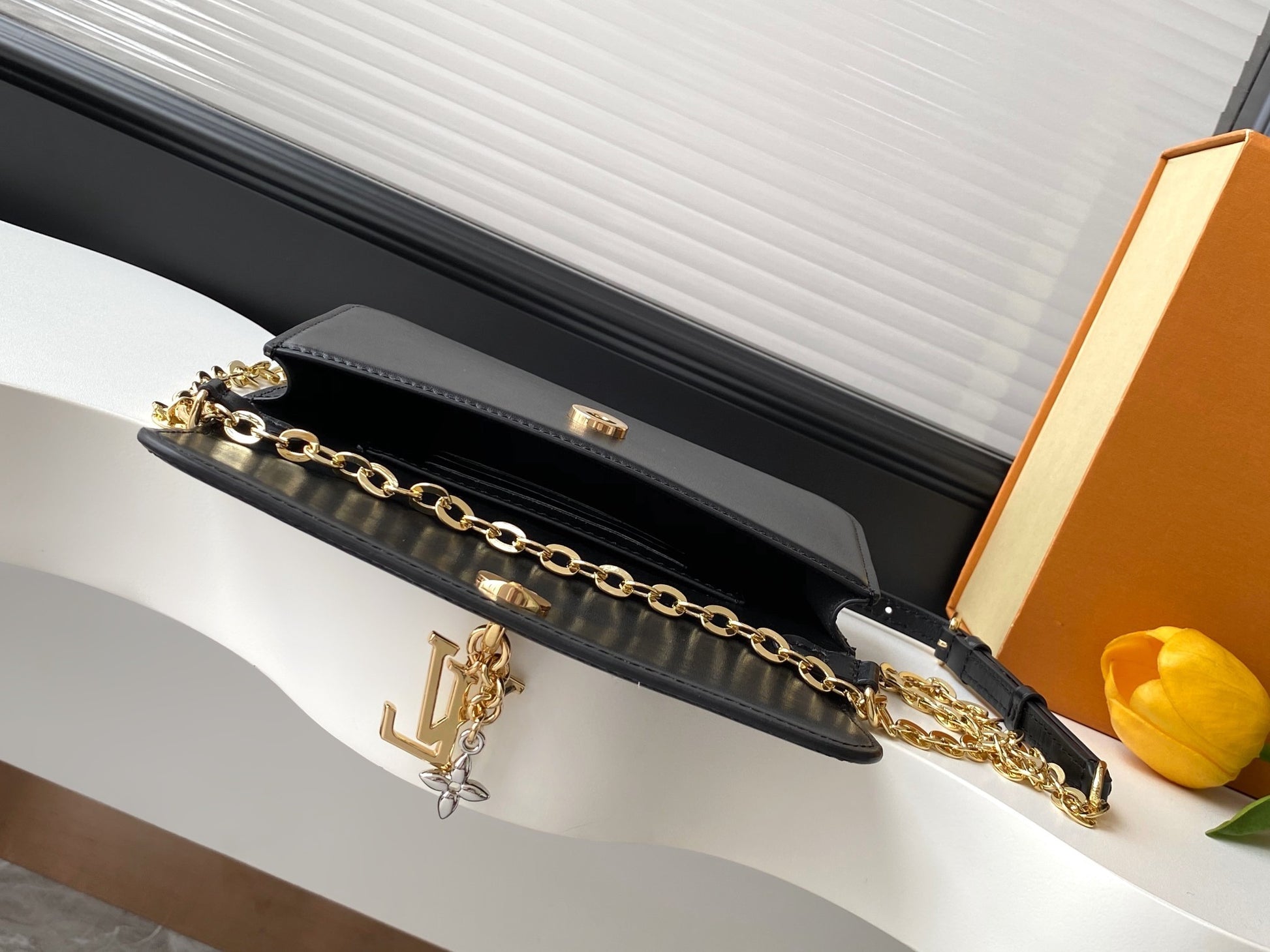 This Wallet on Chain bag, from the Louis Vuitton Bloom collection, features a stylish yet practical silhouette crafted from cowhide leather. Embellished with details inspired by the brand's iconic Monogram pattern, it offers ample space for a smartphone, while contrasting metal hardware adds an elegant touch.