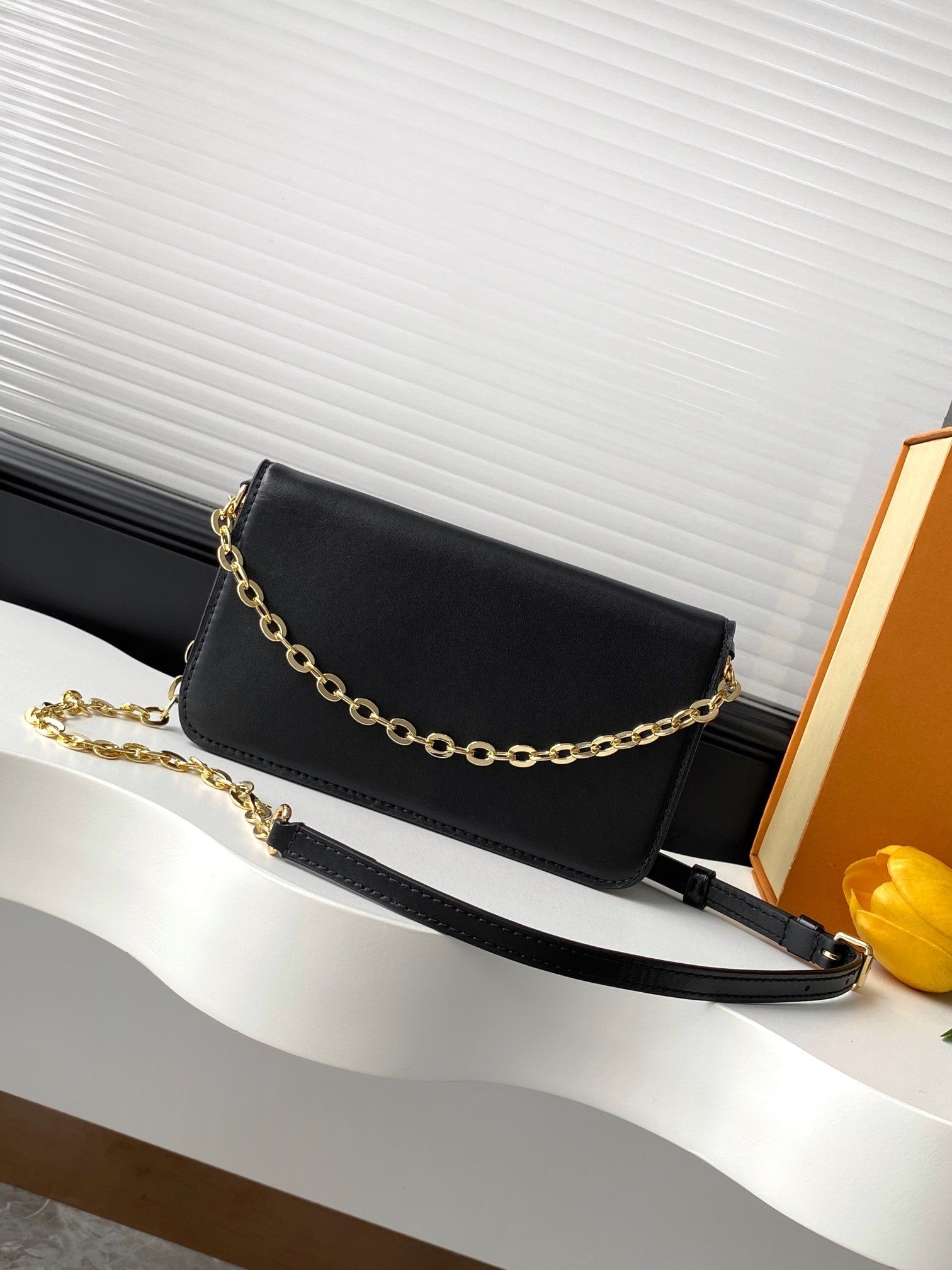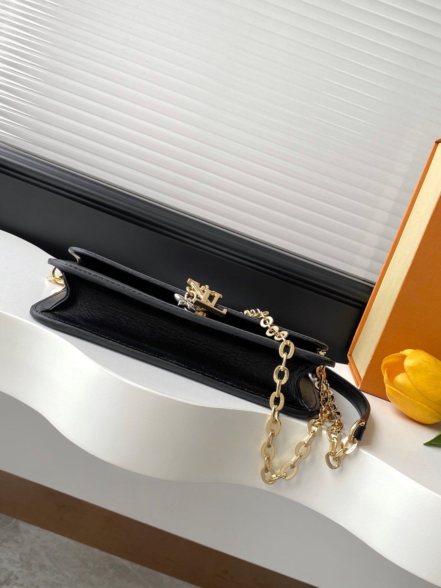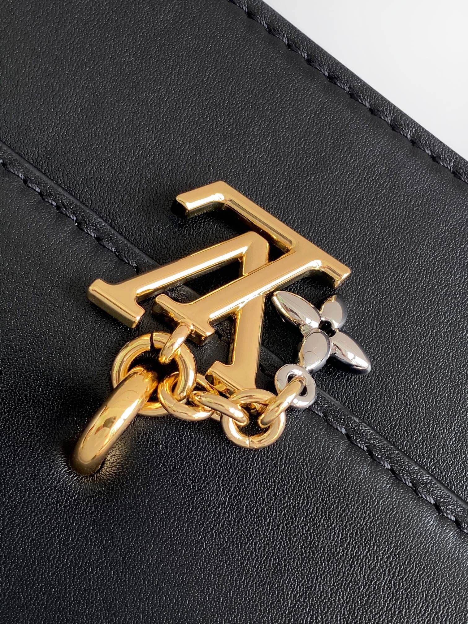 This Wallet on Chain bag, from the Louis Vuitton Bloom collection, features a stylish yet practical silhouette crafted from cowhide leather. Embellished with details inspired by the brand's iconic Monogram pattern, it offers ample space for a smartphone, while contrasting metal hardware adds an elegant touch.