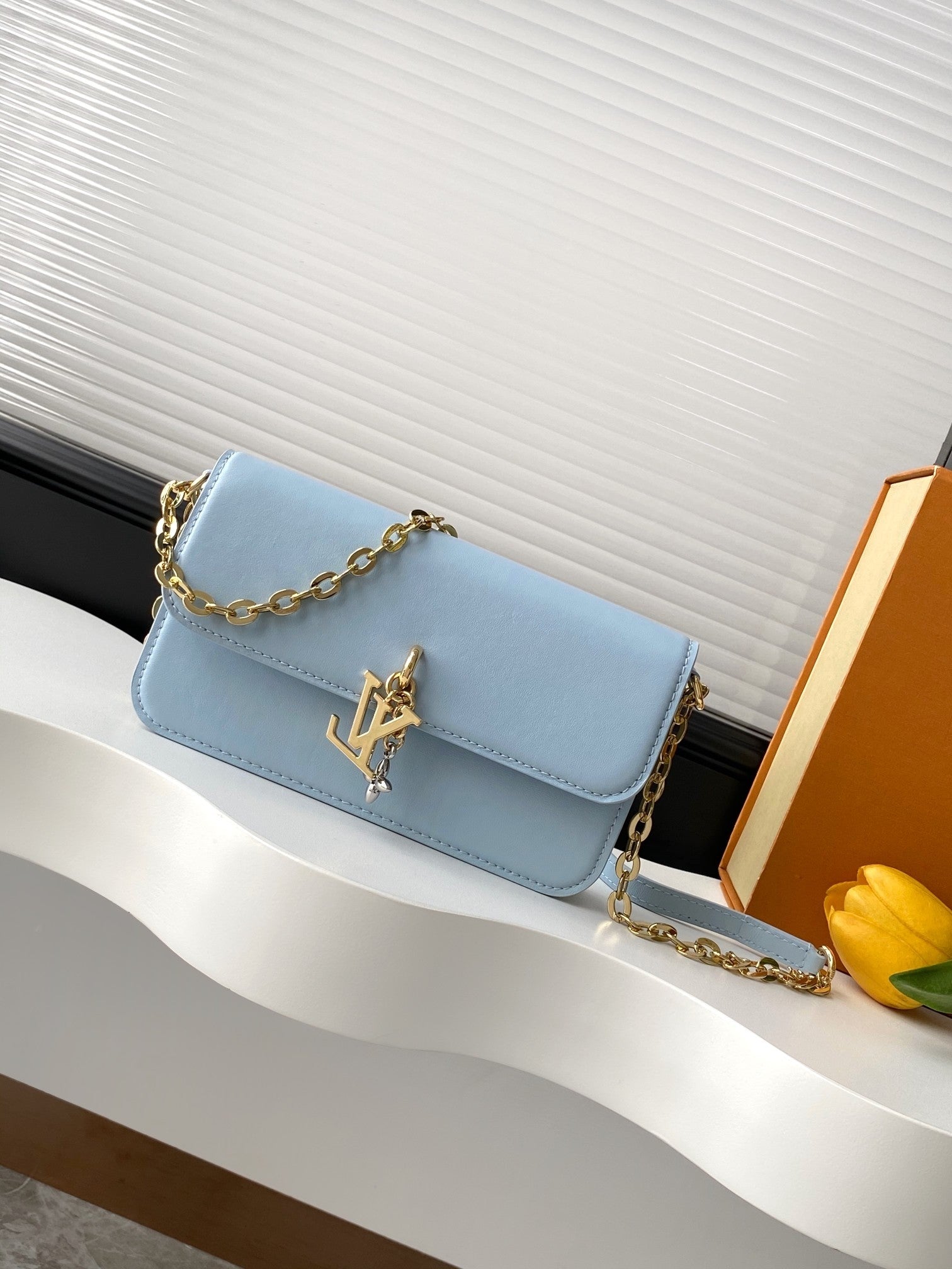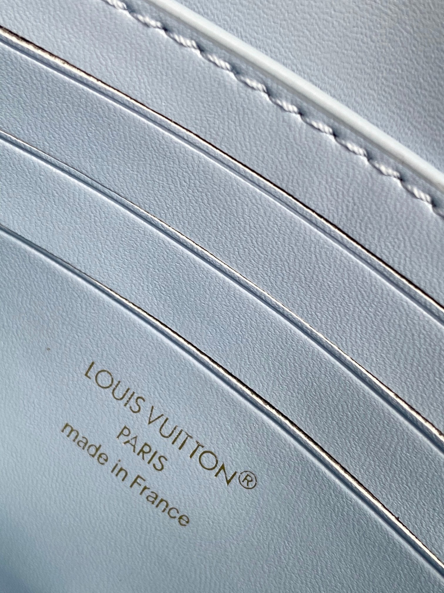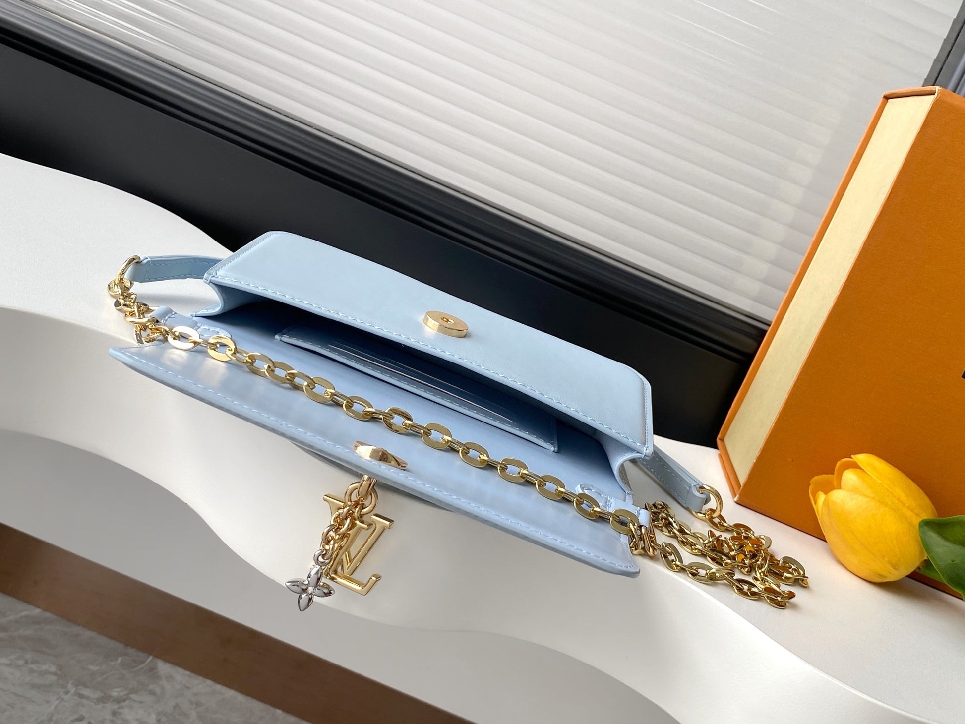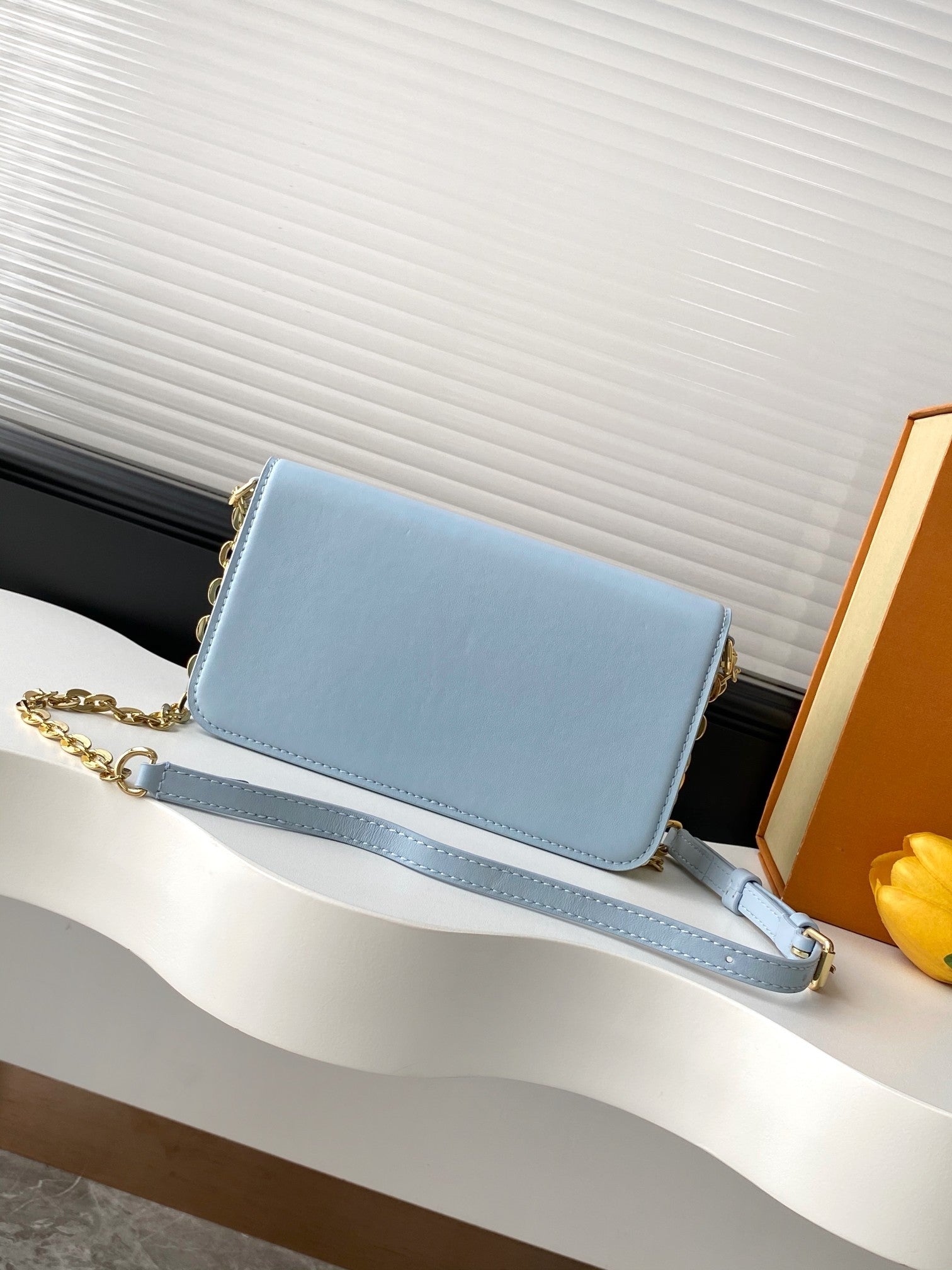 This Wallet on Chain bag, from the Louis Vuitton Bloom collection, features a stylish yet practical silhouette crafted from cowhide leather. Embellished with details inspired by the brand's iconic Monogram pattern, it offers ample space for a smartphone, while contrasting metal hardware adds an elegant touch.