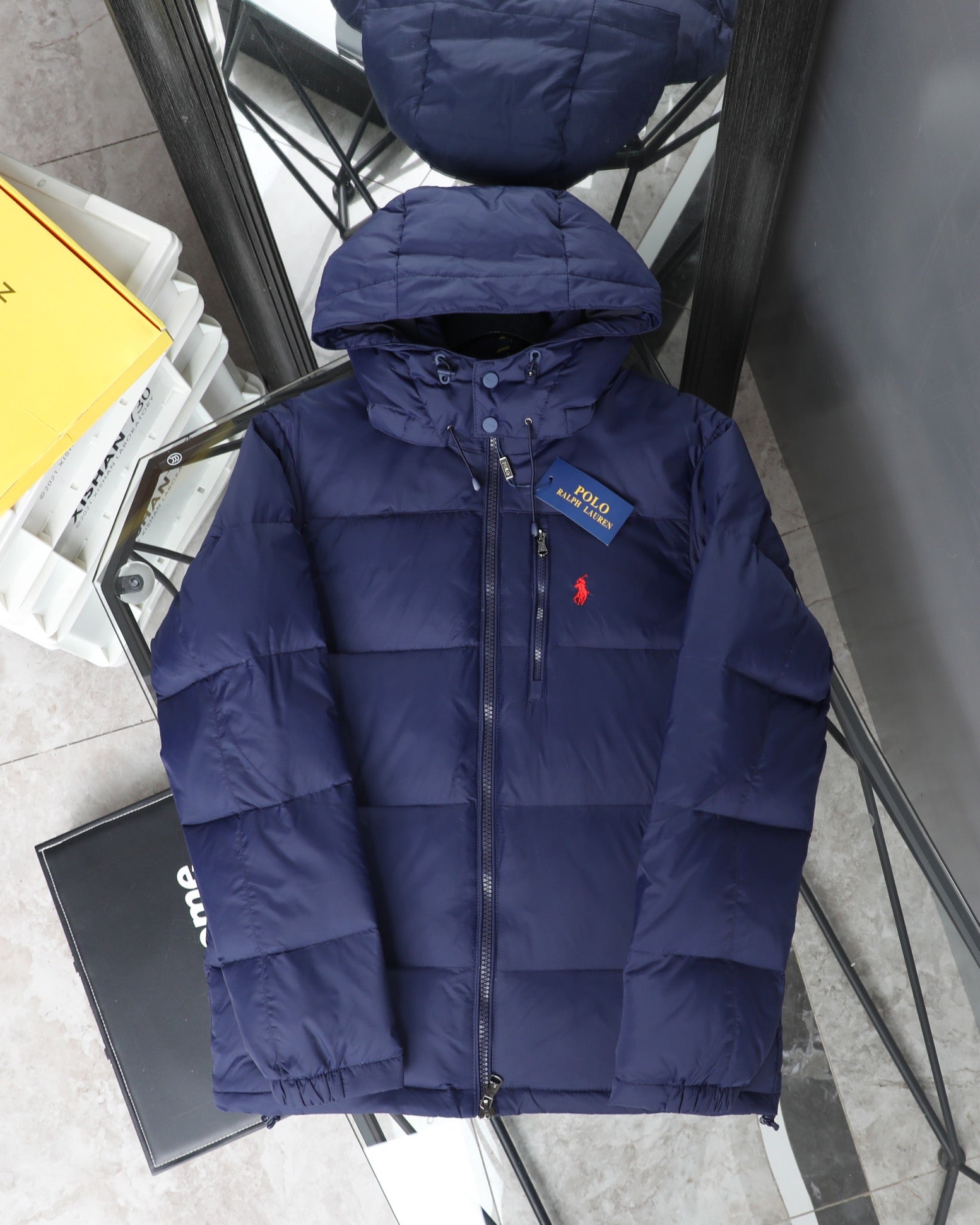 - RL Ralph Lauren's classic, best-selling hooded, small-label down jacket. A popular item in North America, often sold out year-round. Available in black and blue, this jacket is simple, versatile, and highly wearable. It features a detachable hood, Velcro cuffs, and elasticated hem for adjustable fit. 420g zoned down filling provides warmth and comfort for a cozy winter.
