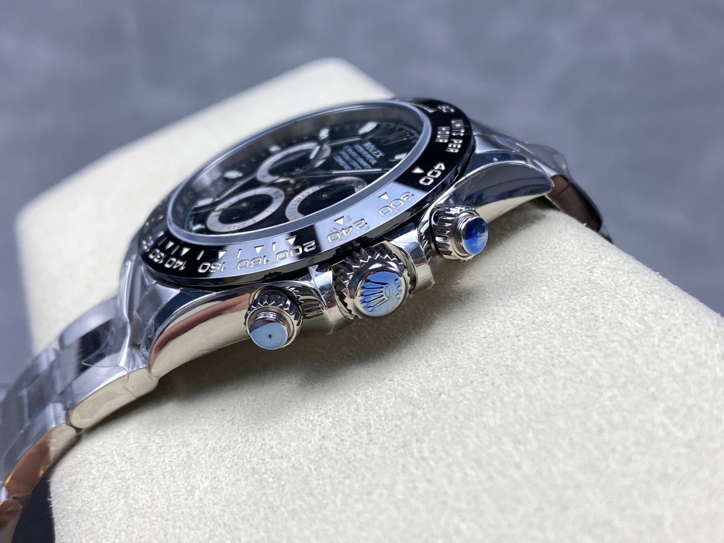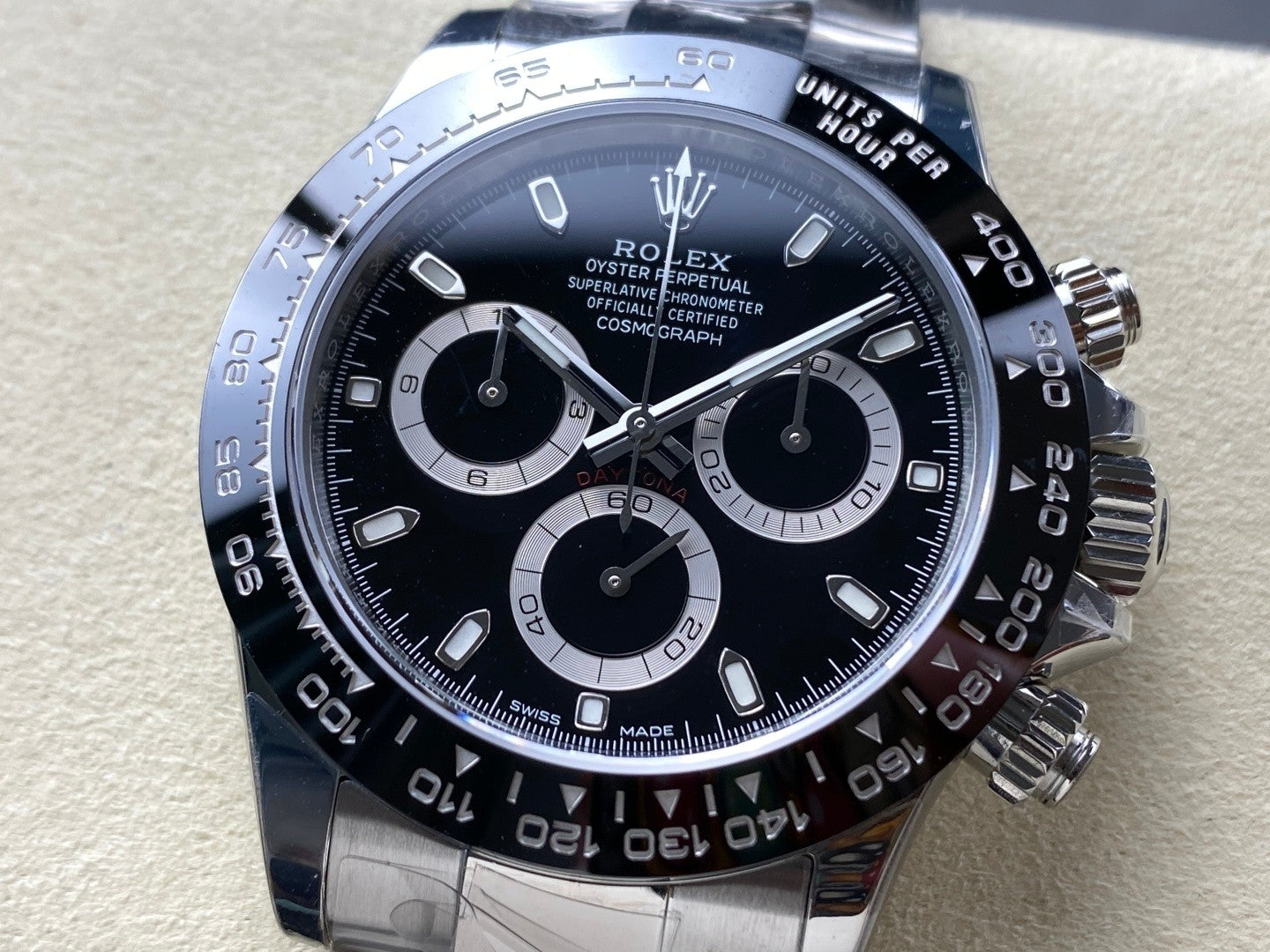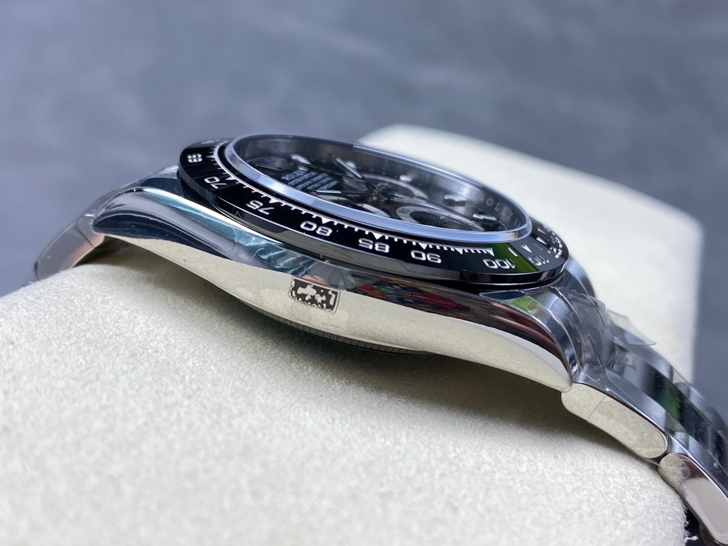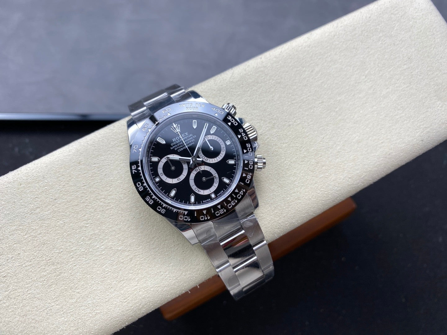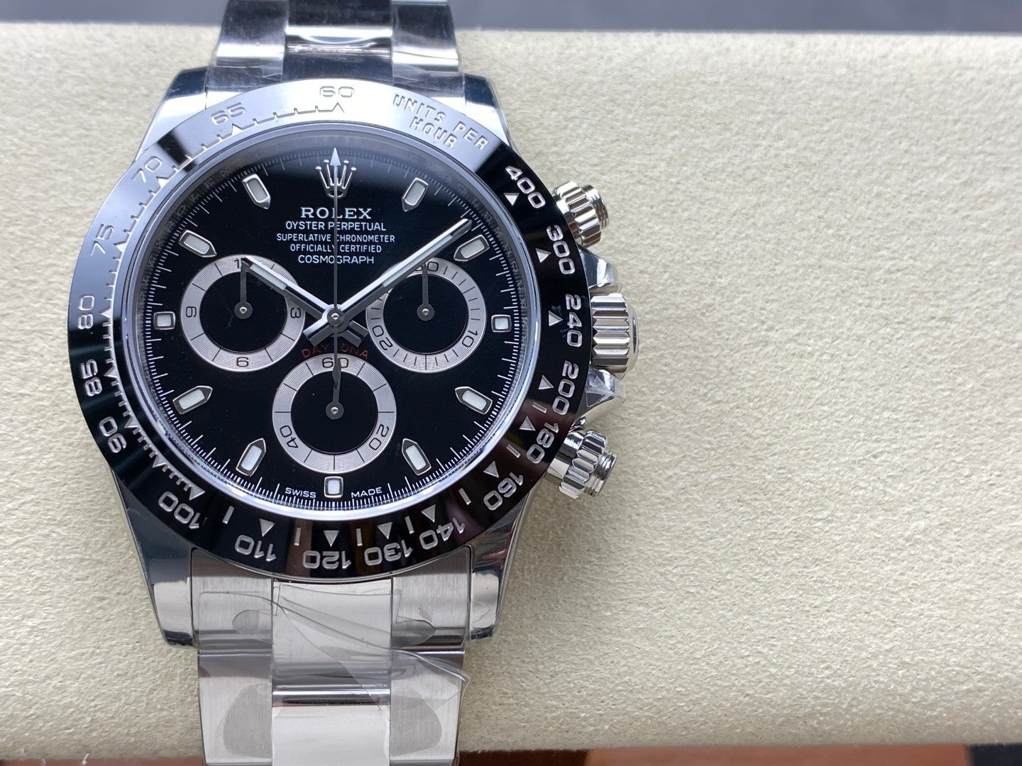 VS Rolex Cosmograph Daytona Series m116500ln-0001 Watch (Panda Daytona), 904 stainless steel case and bracelet, folding clasp; Oysterlock clasp with 5mm Easylink extension system, black Cerachrom ceramic solid bezel with tachymeter scale, white panda dial with spiral small seconds sub-dial, powered by the Dandong 4130 automatic mechanical chronograph movement, size: 40mm