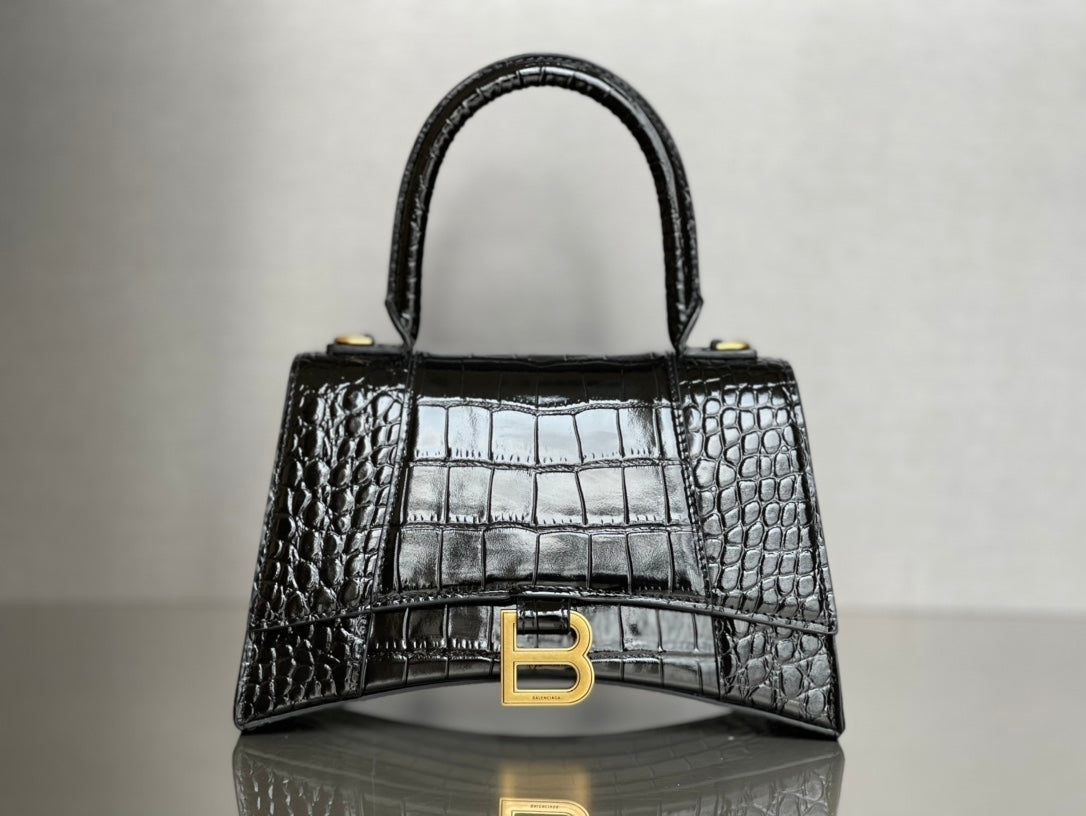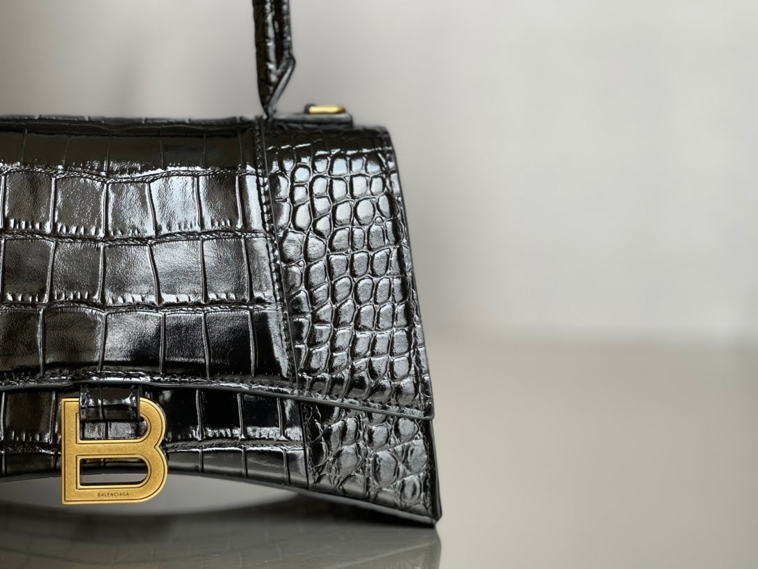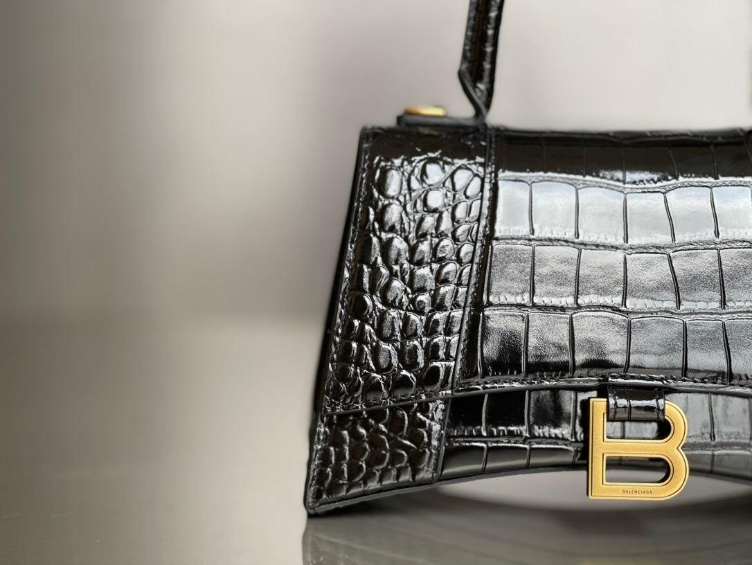 Balenciaga Bag - Top-Level Authentic Replica #𝗕𝗮𝗹𝗲𝗻𝗰𝗶𝗮𝗴𝗮# Crocodile Pattern Black with Gold Hardware【Upgraded Original Leather Version】Size S — 23cmCrocodile Pattern Original Leather Version 𝗛𝗼𝘂𝗿𝗴𝗹𝗮𝘀𝘀 Bag is brand new!🌟 Made from Italian original crocodile-pattern cowhide, the clear crocodile pattern rivals real crocodile, with excellent touch, always showing refined taste!🌟 Imported bronze hardware! Super stylish B-shaped zipper, I give this design a full score 💯, extremely fashionable and dazzling!🌟 Unique iconic curved shape is highly recognizable, instantly eye-catching and super cool! The exterior forms a half-moon shape.🌟 Inside the bag is a large open compartment with a zippered pocket, very spacious! Lined with lambskin, highly durable but costly! Made to be the best for those who truly appreciate it!Small: 19x8x21cmMedium: 23x10x24cm