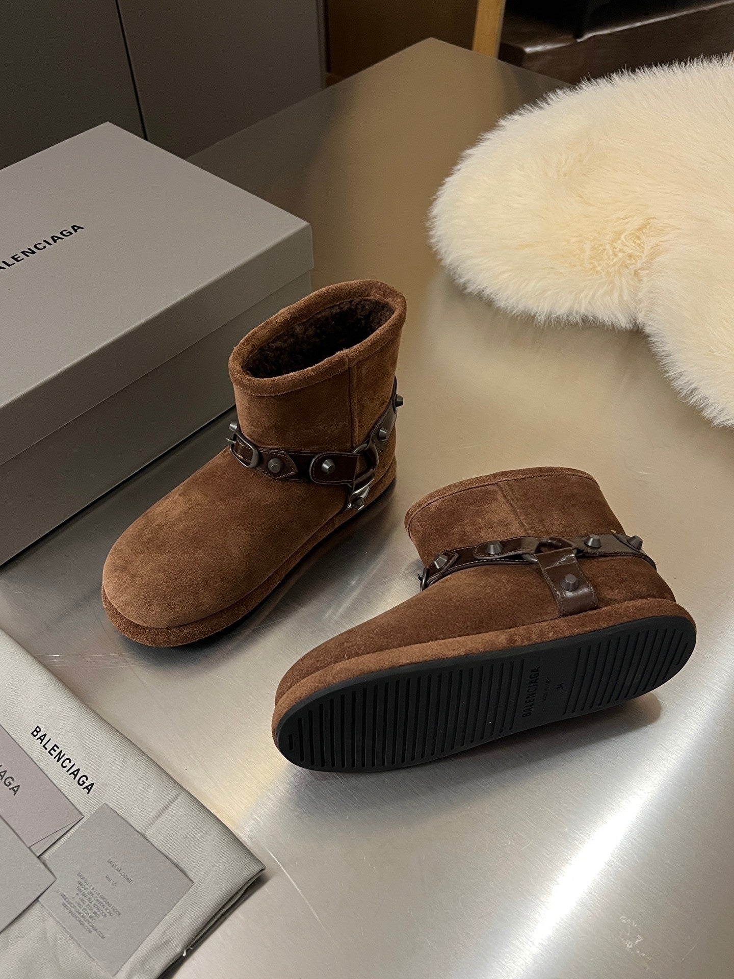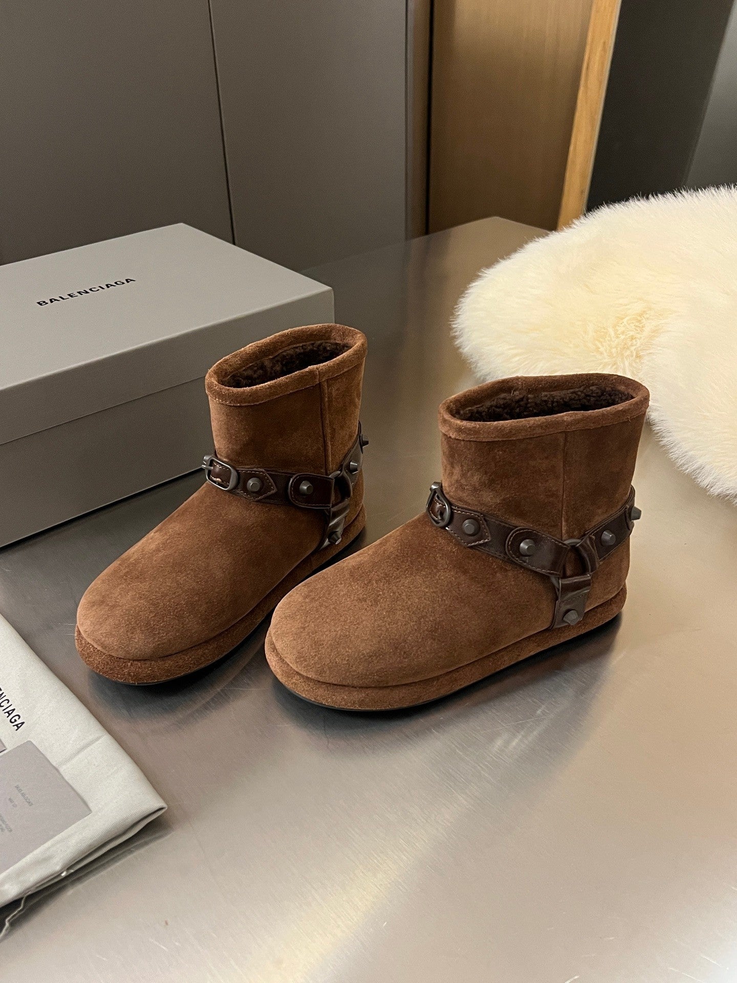 BALENCIAGA's new Autumn/Winter 2025 belt-buckled rivet snow boots are incredibly stylish. Their design breaks the traditional bulky and bulky look of snow boots with a unique twist. The upper is crafted from mercerized cow suede for a refined, luxurious feel. The entire lining is made of pure wool for warmth and comfort. The rubber outsole is non-slip and wear-resistant, adding a layer of security and safety during wet winters. Colors: Chestnut, Black, White, Mahogany. Sizes: 35-40. Available from the factory ✔️