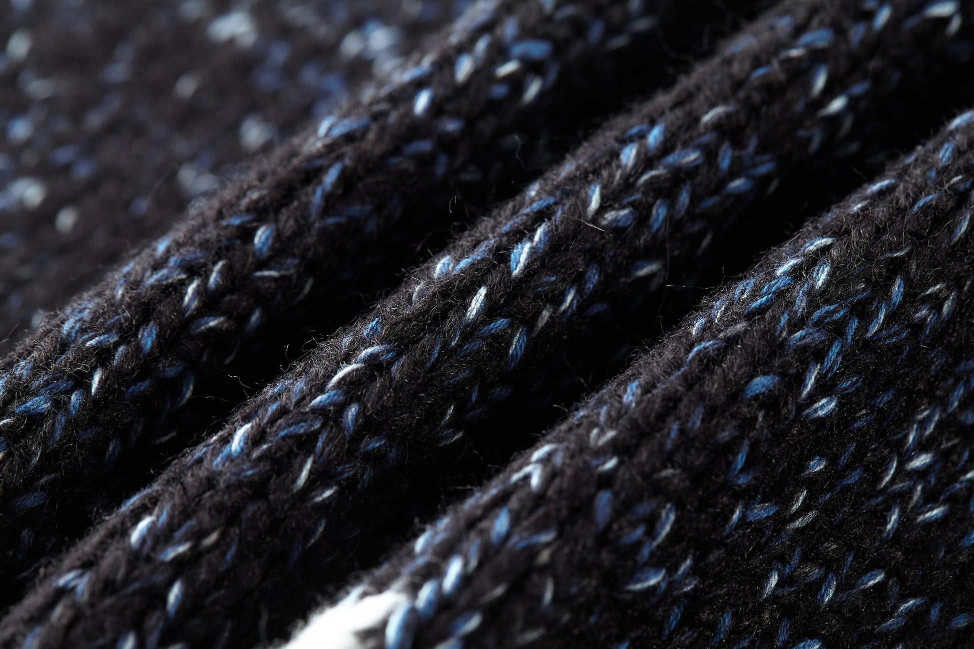 Fabric: 55% wool, 30% cashmere, and 15% cotton. This piece utilizes a viscous technique to create a multi-colored, dotted pattern. 12 yarn feeders and 6 different wools are used.