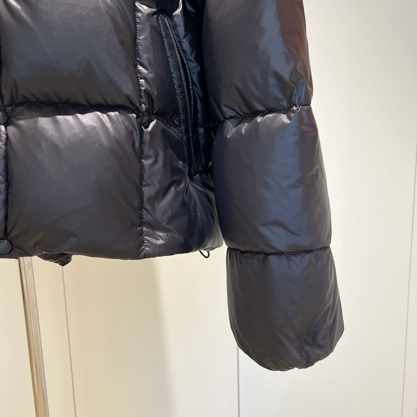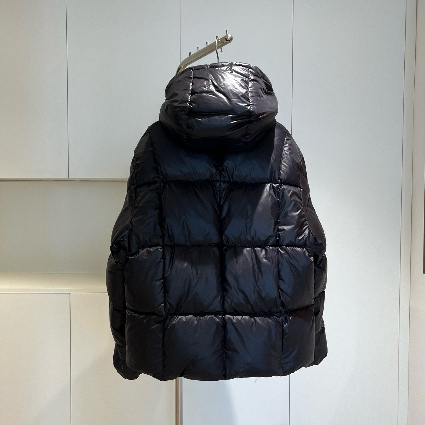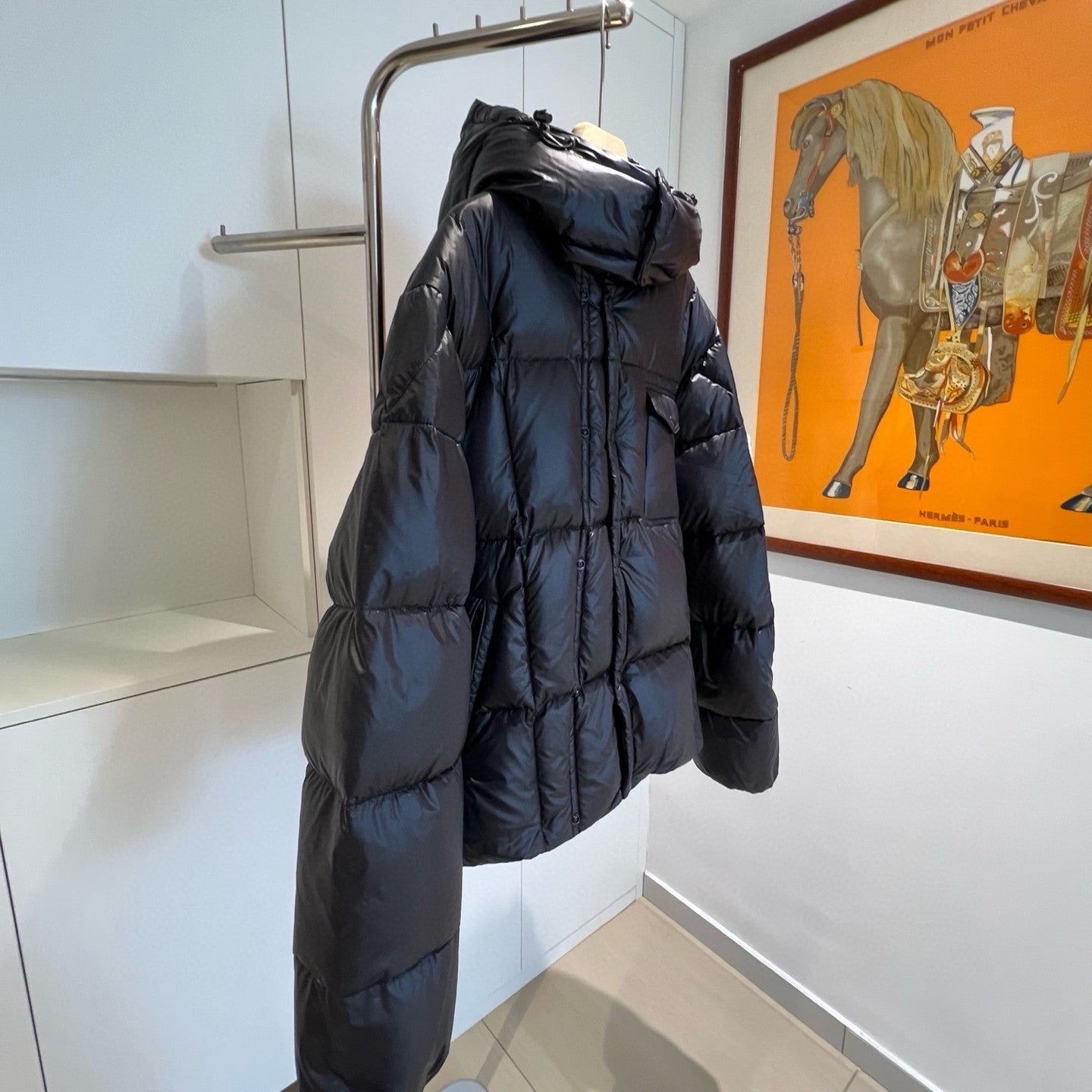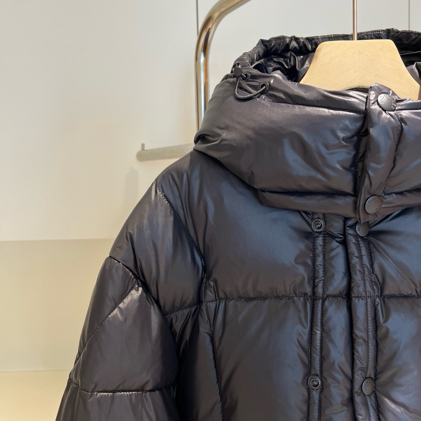 Made of Super Laqué fabric, polyester lining and down filling. Zippered and snap-fastened hood. Zippered pockets.