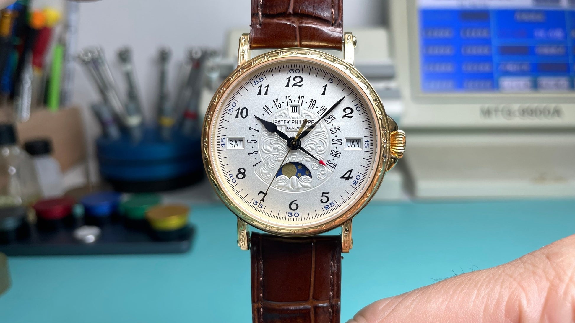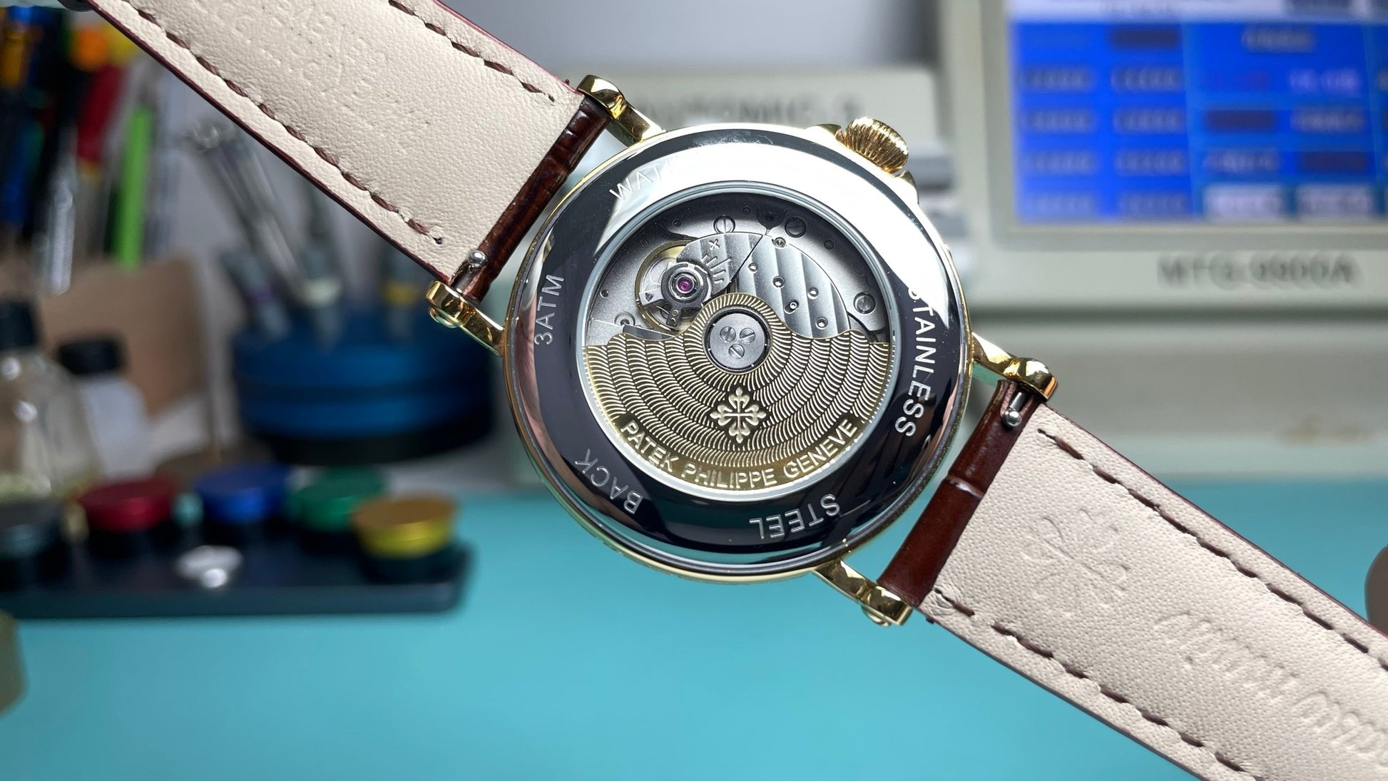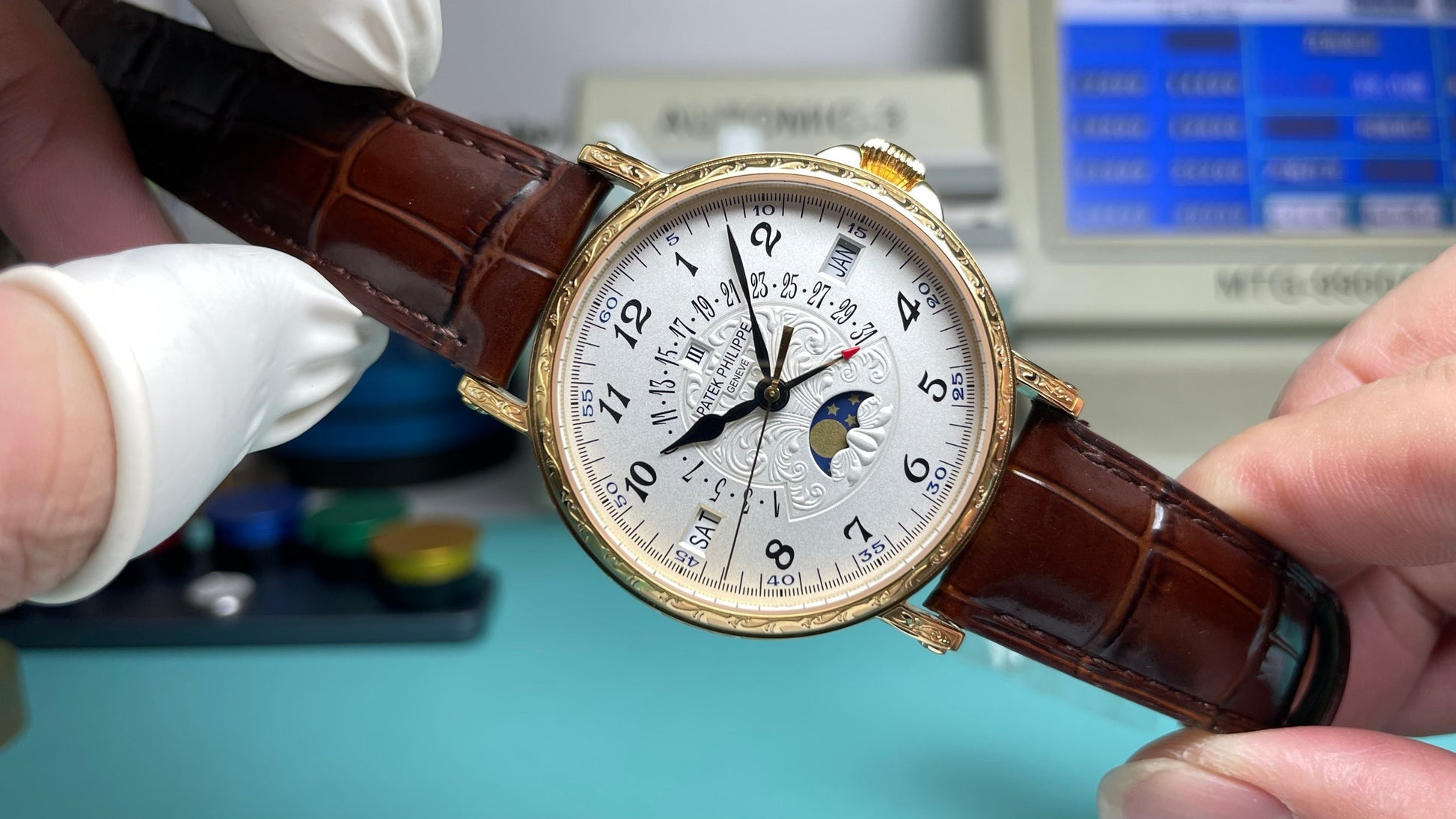 Patek Philippe Classical Grand Complications 5159 Perpetual Calendar Series Watch, with an original-style folding case back! Elegant to the extreme! Classical Series 1️⃣【Outstanding Details and Advantages】This watch has a reasonable size of 38mm and a lug design that makes it suitable for the general public. Whether you have large or small wrists, it wears comfortably without pressure. When you move your hands, half of the watch peeks out from your cuff, giving you the aura of a successful professional and complementing business attire. This watch definitely provides you with presence and confidence. Wearing it gives a comfortable feel and the weight of a small gold watch, letting you truly feel like a life winner.1. Case Polishing: Crafted to achieve a smooth, jade-like finish, meticulously polished with patience.2. Pressed Case Back and Case Connection Mechanism: Offers a crisp tactile feel similar to a latch, while the pressed back enhances water resistance.3. Markers and Hands: Treated with the latest precious metal electroplating technology for an elevated finish.4. 'Domed Cap'-type Sapphire Crystal: Matches the original shape, with a clear and transparent view, easy to read time.5. 3D Normative Precious Metal Engravings: Clear and vivid!2️⃣【Leading the Integrated Movement Era】Equipped with a customized integrated movement—thinner, more stable, and more accurate. Most importantly, it greatly improves the authenticity.3️⃣【Strap】Classic Italian calf leather strap with clear texture and excellent quality. Paired with the market's top-tier Patek Philippe ladder buckle, fully compatible with the original. This enhances its formal Patek Philippe design, graceful and enduring, timeless classic, understated perfection, truly a gentleman’s watch.