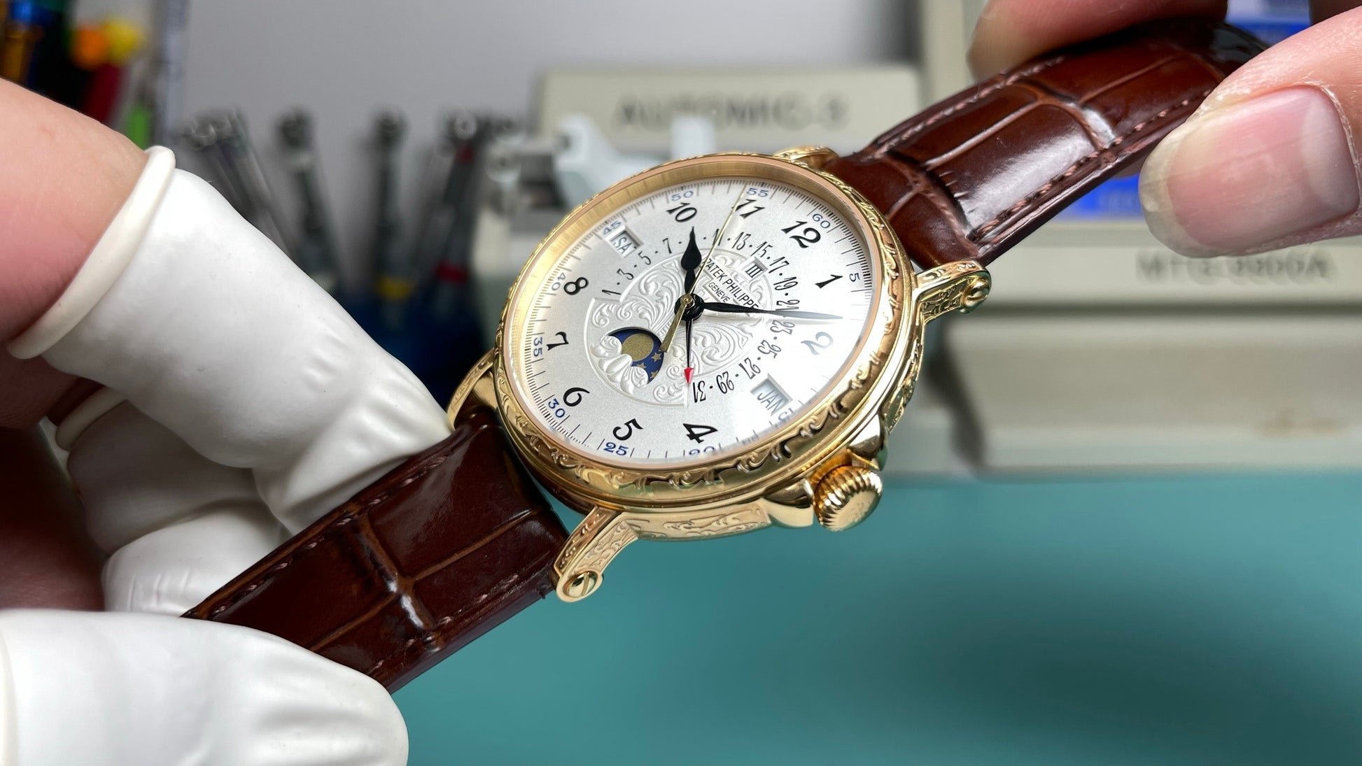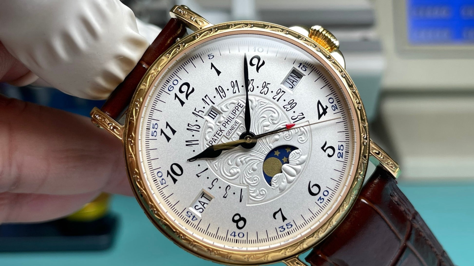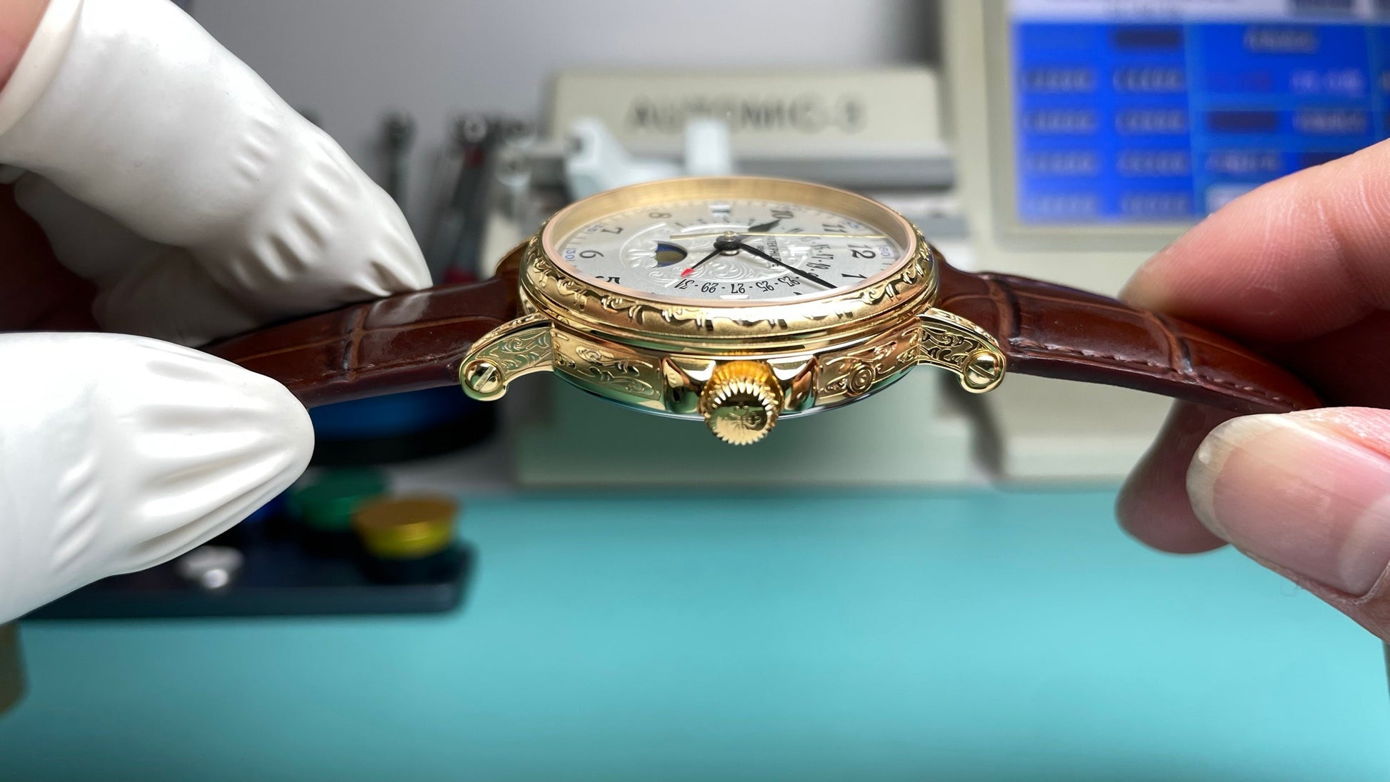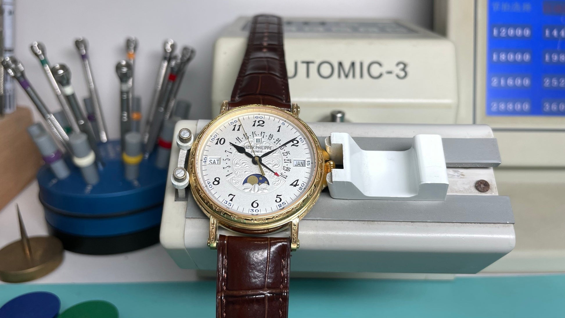 Patek Philippe Classical Grand Complications 5159 Perpetual Calendar Series Watch, with an original-style folding case back! Elegant to the extreme! Classical Series 1️⃣【Outstanding Details and Advantages】This watch has a reasonable size of 38mm and a lug design that makes it suitable for the general public. Whether you have large or small wrists, it wears comfortably without pressure. When you move your hands, half of the watch peeks out from your cuff, giving you the aura of a successful professional and complementing business attire. This watch definitely provides you with presence and confidence. Wearing it gives a comfortable feel and the weight of a small gold watch, letting you truly feel like a life winner.1. Case Polishing: Crafted to achieve a smooth, jade-like finish, meticulously polished with patience.2. Pressed Case Back and Case Connection Mechanism: Offers a crisp tactile feel similar to a latch, while the pressed back enhances water resistance.3. Markers and Hands: Treated with the latest precious metal electroplating technology for an elevated finish.4. 'Domed Cap'-type Sapphire Crystal: Matches the original shape, with a clear and transparent view, easy to read time.5. 3D Normative Precious Metal Engravings: Clear and vivid!2️⃣【Leading the Integrated Movement Era】Equipped with a customized integrated movement—thinner, more stable, and more accurate. Most importantly, it greatly improves the authenticity.3️⃣【Strap】Classic Italian calf leather strap with clear texture and excellent quality. Paired with the market's top-tier Patek Philippe ladder buckle, fully compatible with the original. This enhances its formal Patek Philippe design, graceful and enduring, timeless classic, understated perfection, truly a gentleman’s watch.