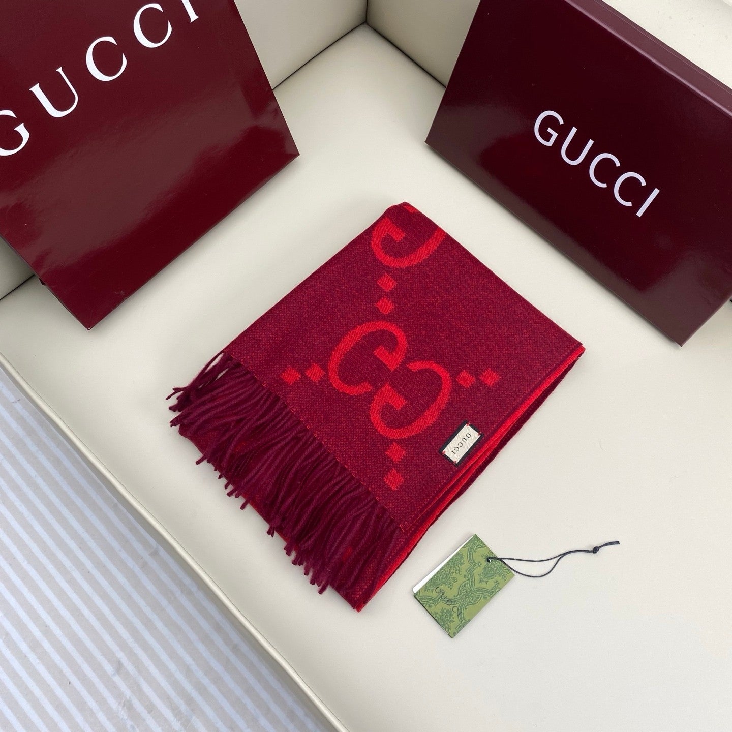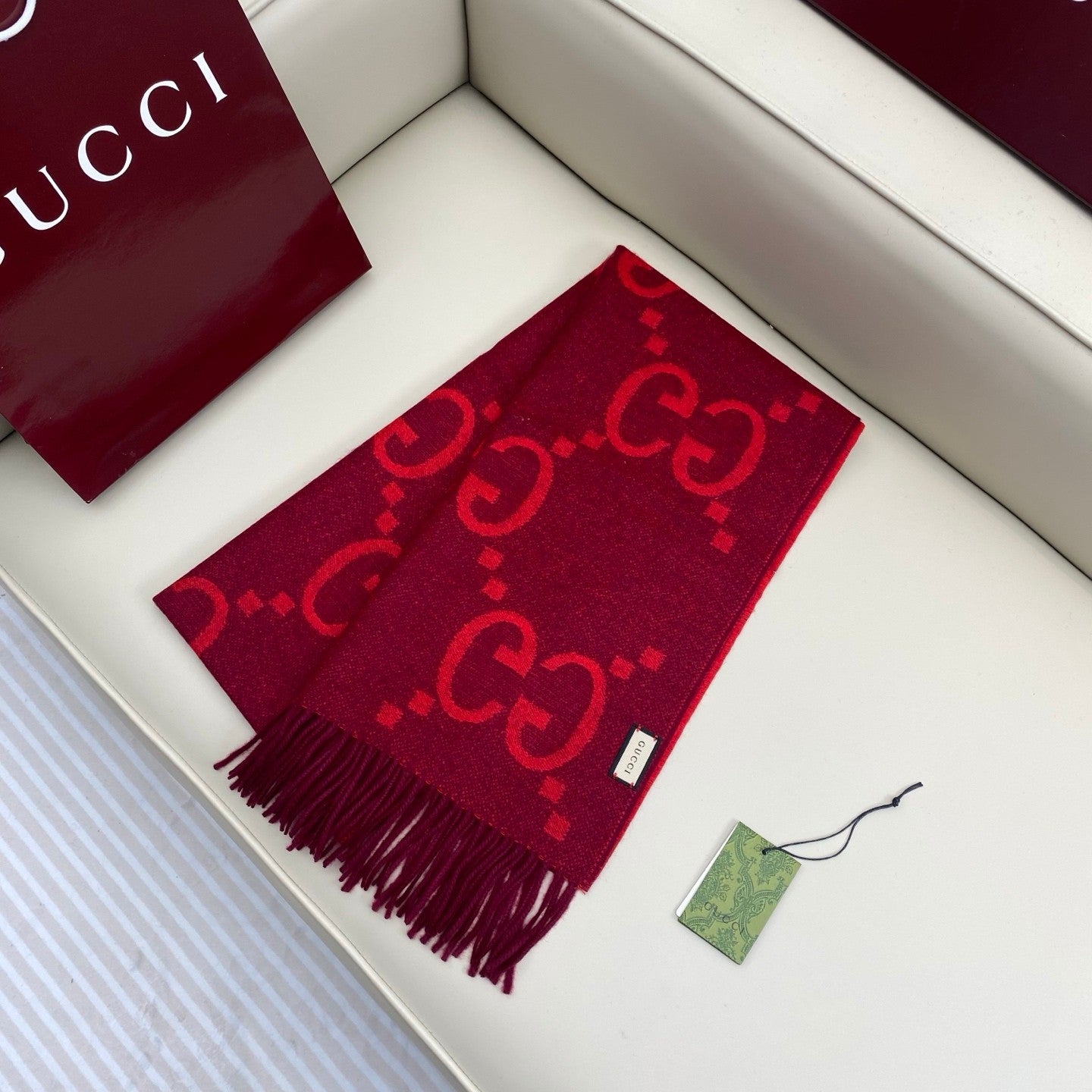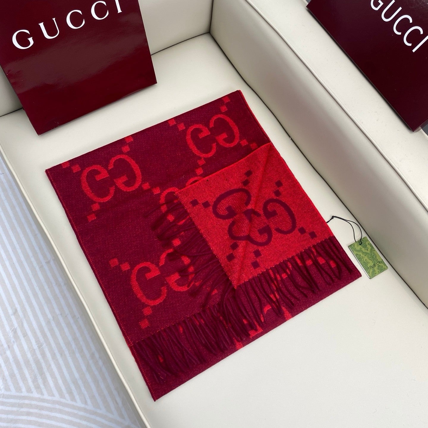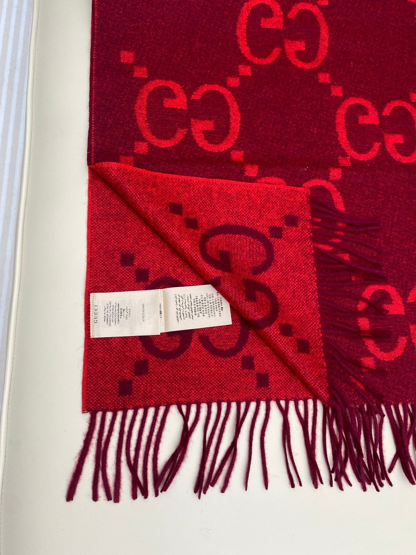 A rare pure cashmere product from G! Extra-heavy weight, top-quality cashmere, stylish Big G jacquard pattern, original product, absolutely premium! Two-sided color matching: One scarf can be worn in two ways โ the same style for both men and women. The large shawl is practical and perfect for business trips or travel!