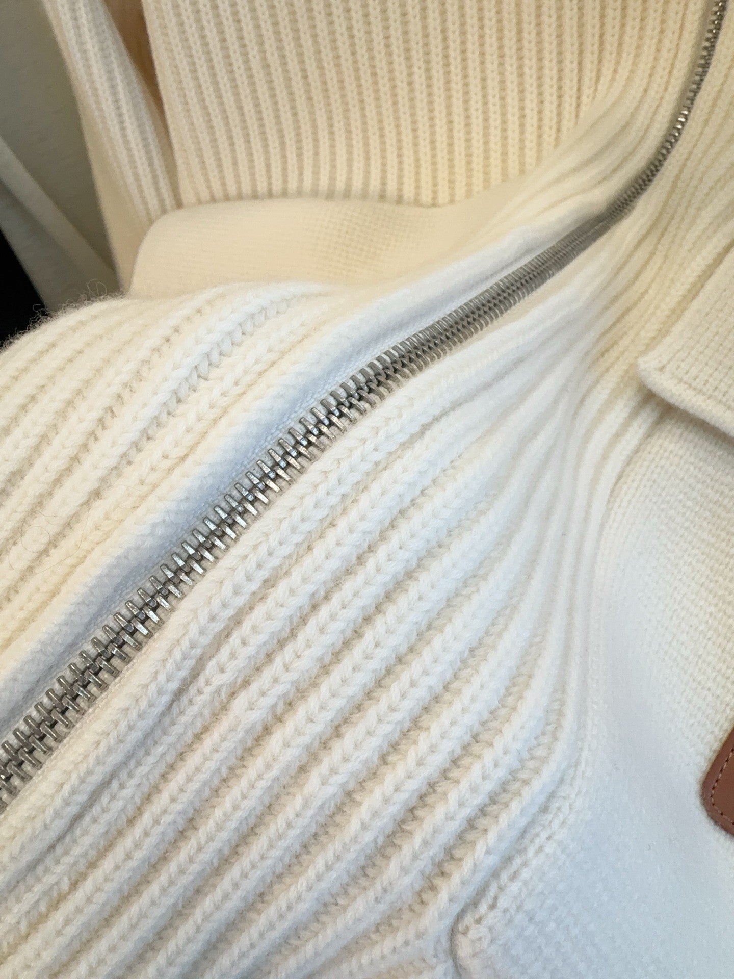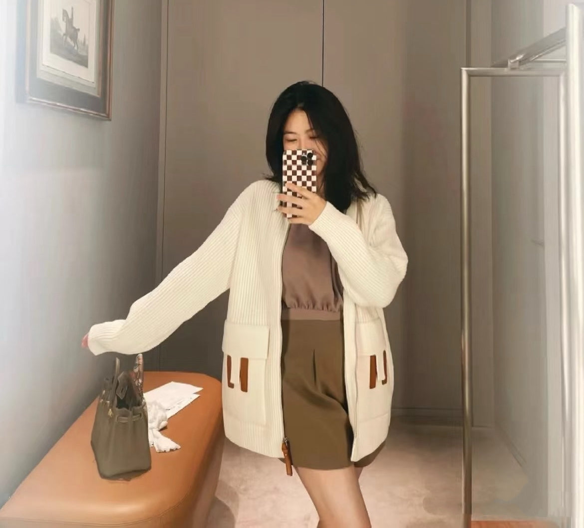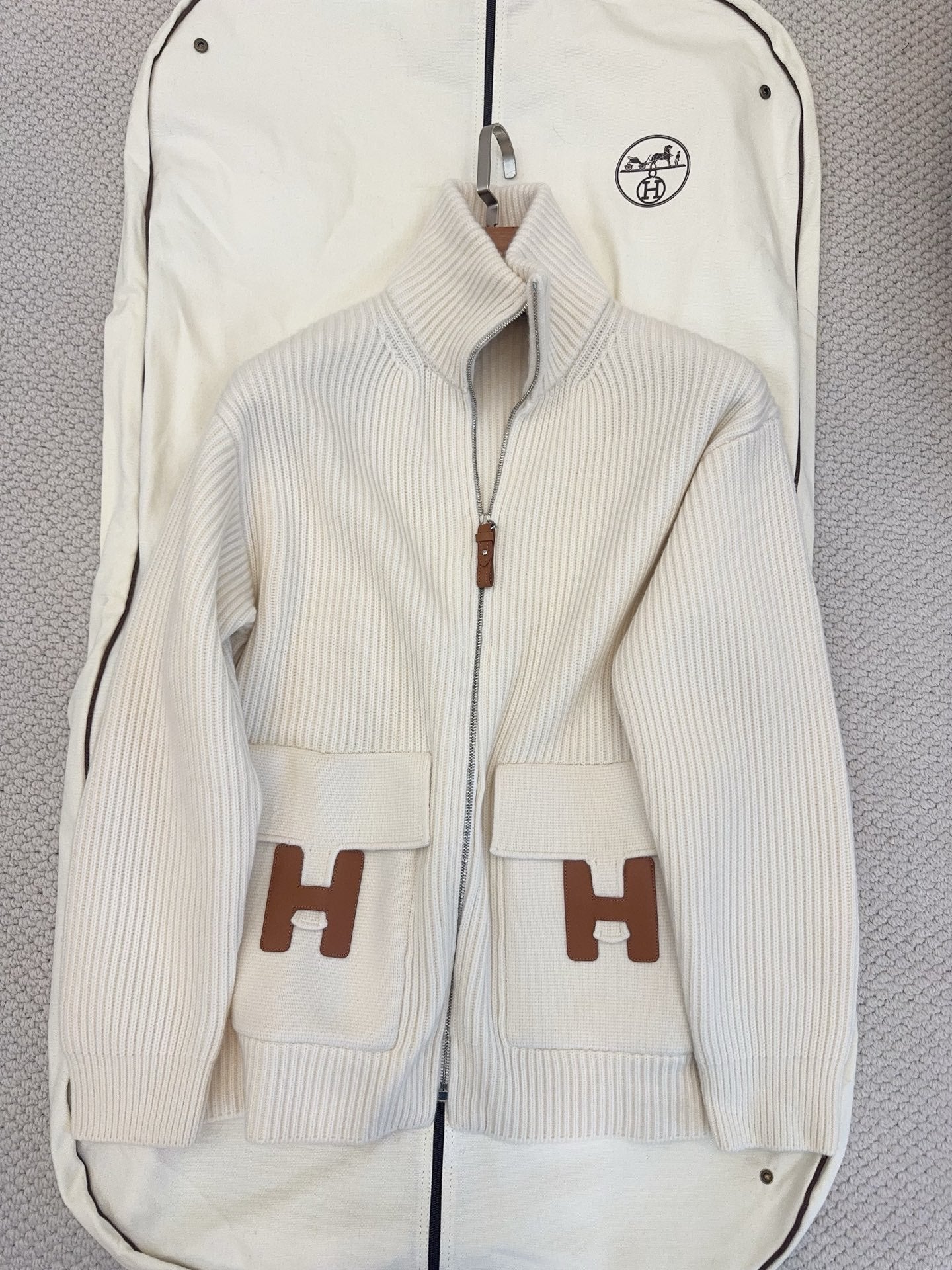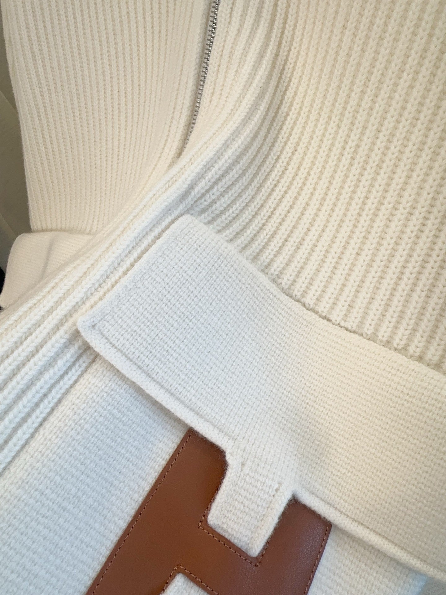 🍀🍃, 🆕Hermes H pocket sweater jacket, 100% wool material, soft and thick, perfect for autumn and winter, cream white + brown leather "H" pockets, low-key and recognizable, zipper closure + stand-up collar design, practical and fashionable, can be worn for commuting and leisure!