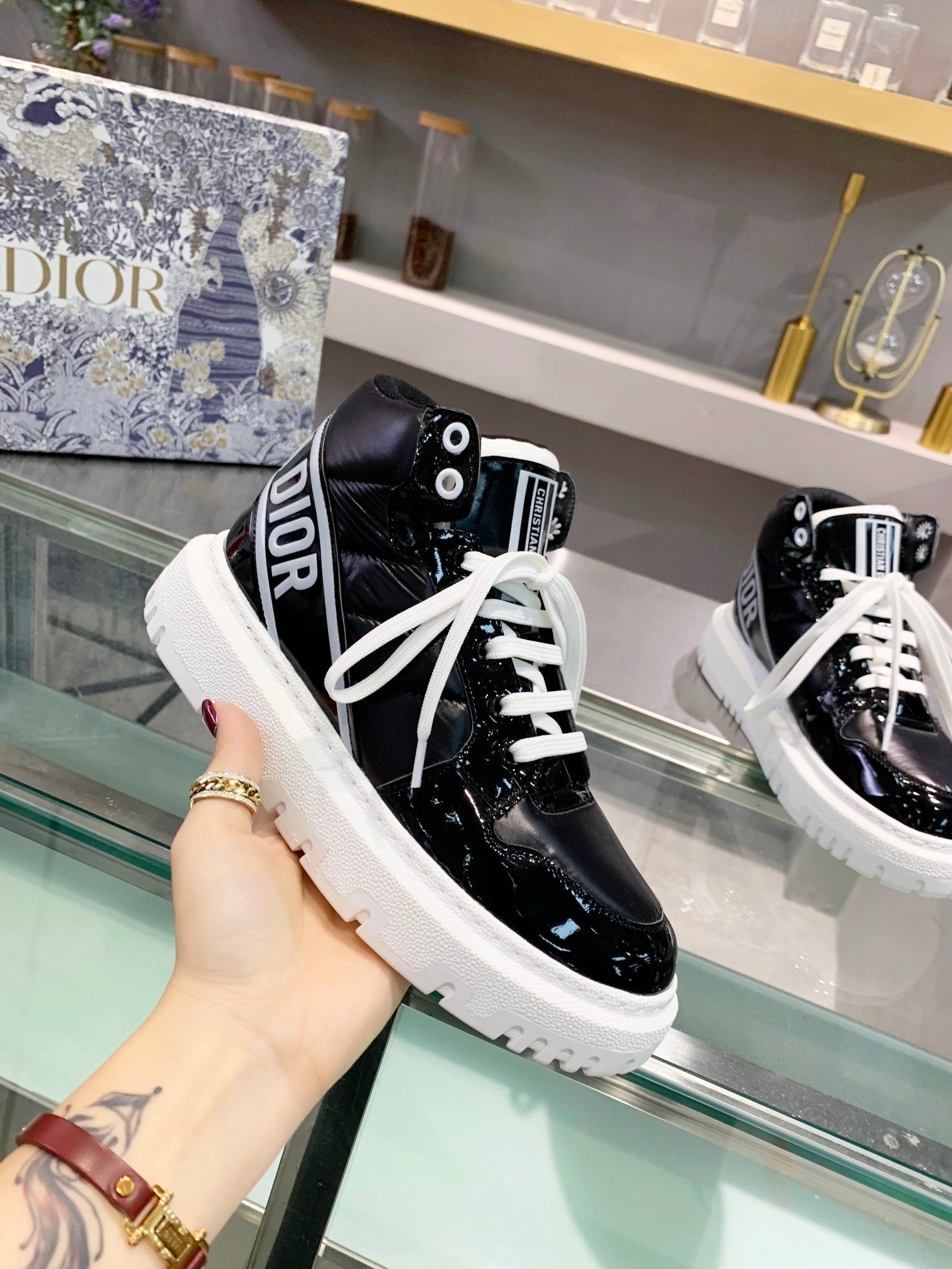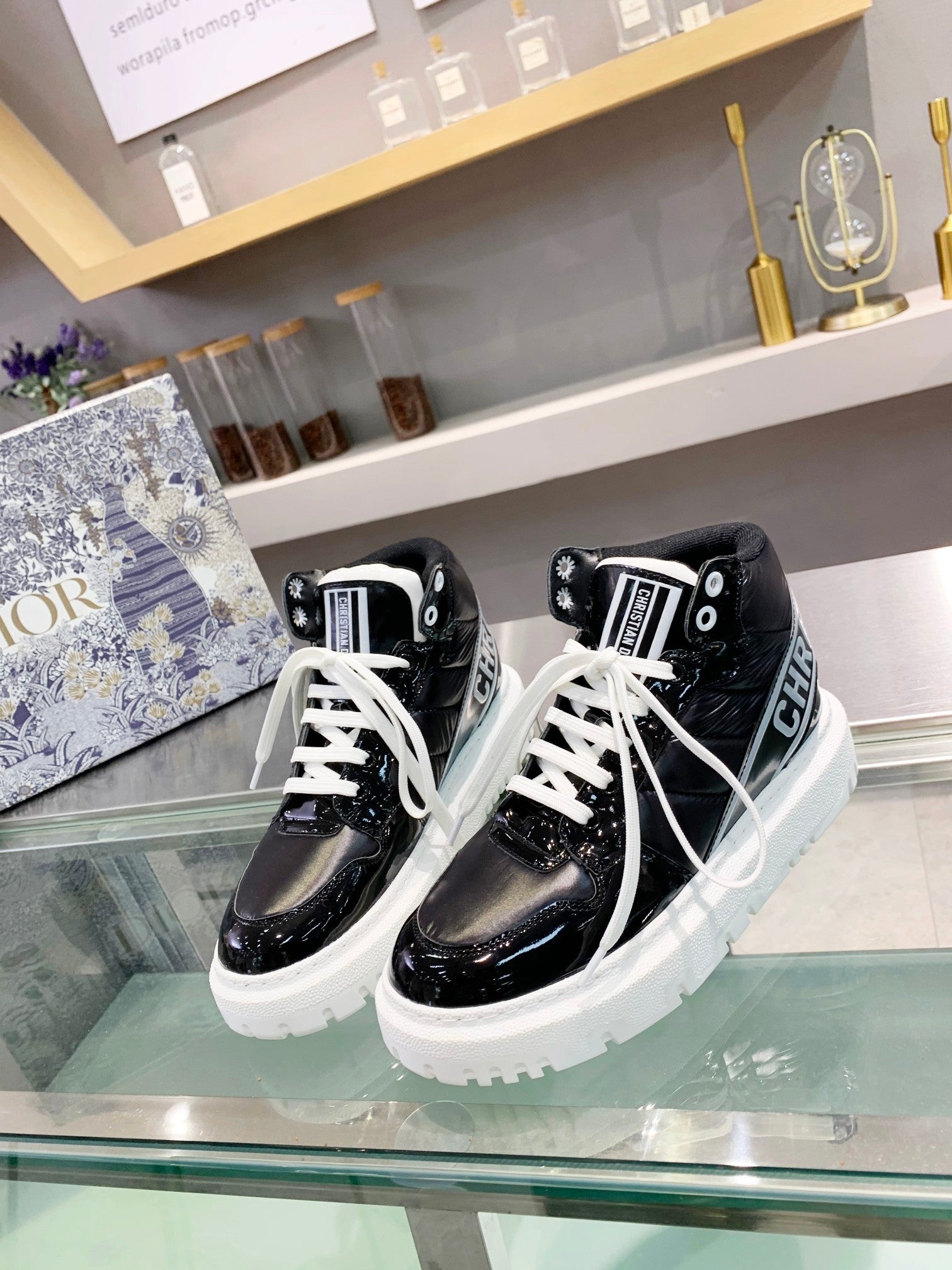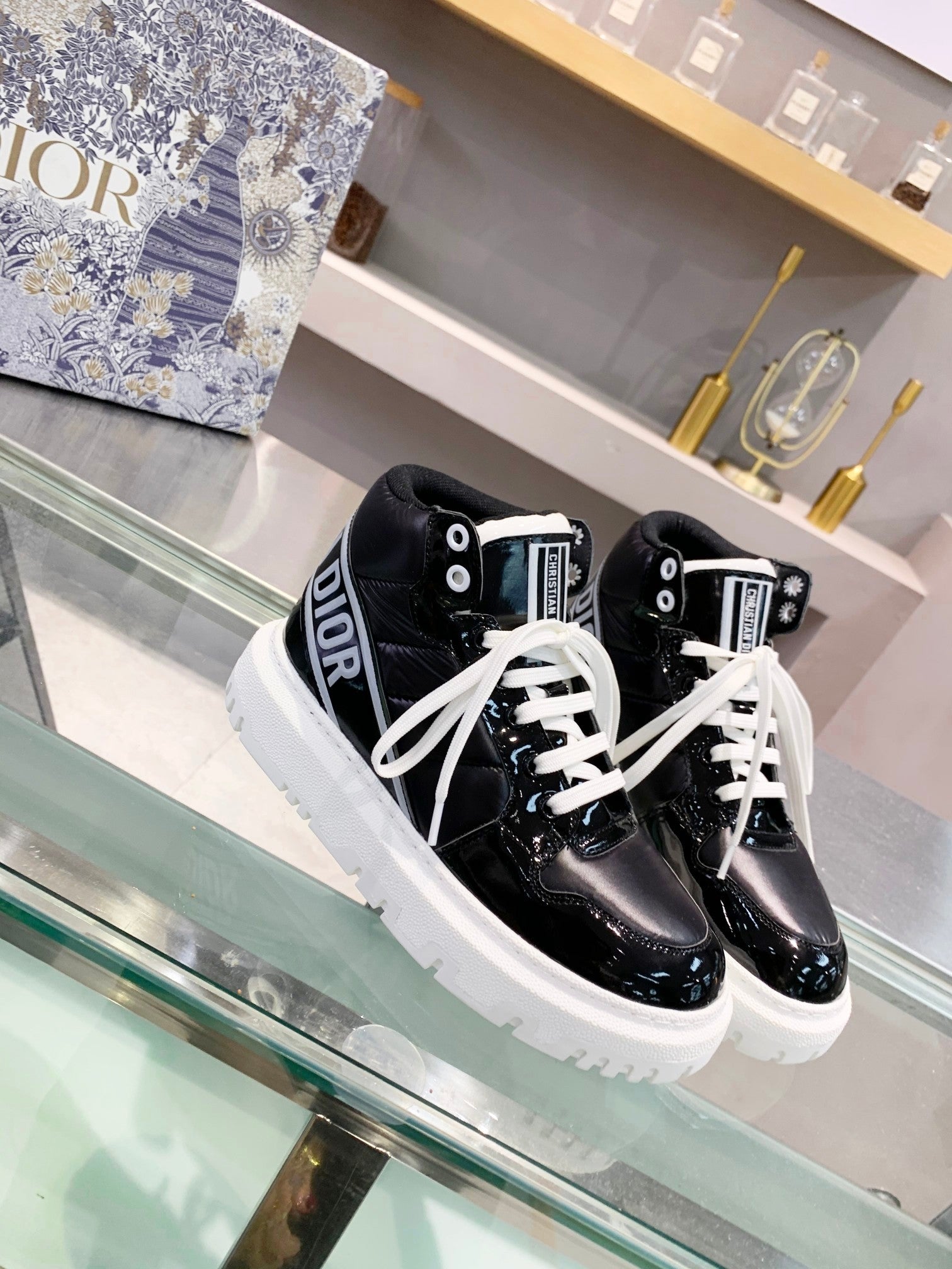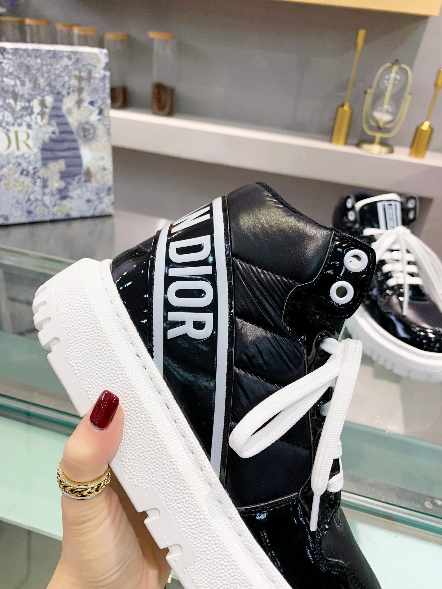 [Dior] New Dior high-top sneakers. ๐บ Made of windproof and waterproof down, this is a super warm winter item! The sole is Dior's classic sneaker sole and is super comfortable. [Fireworks][Fireworks] It has a nice thickness for height without being bulky; it's just the right balance. ๐