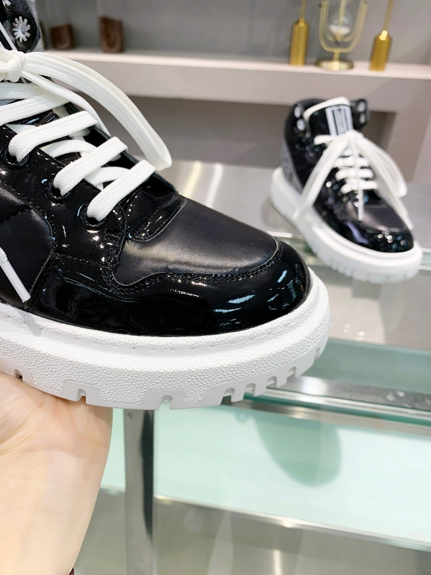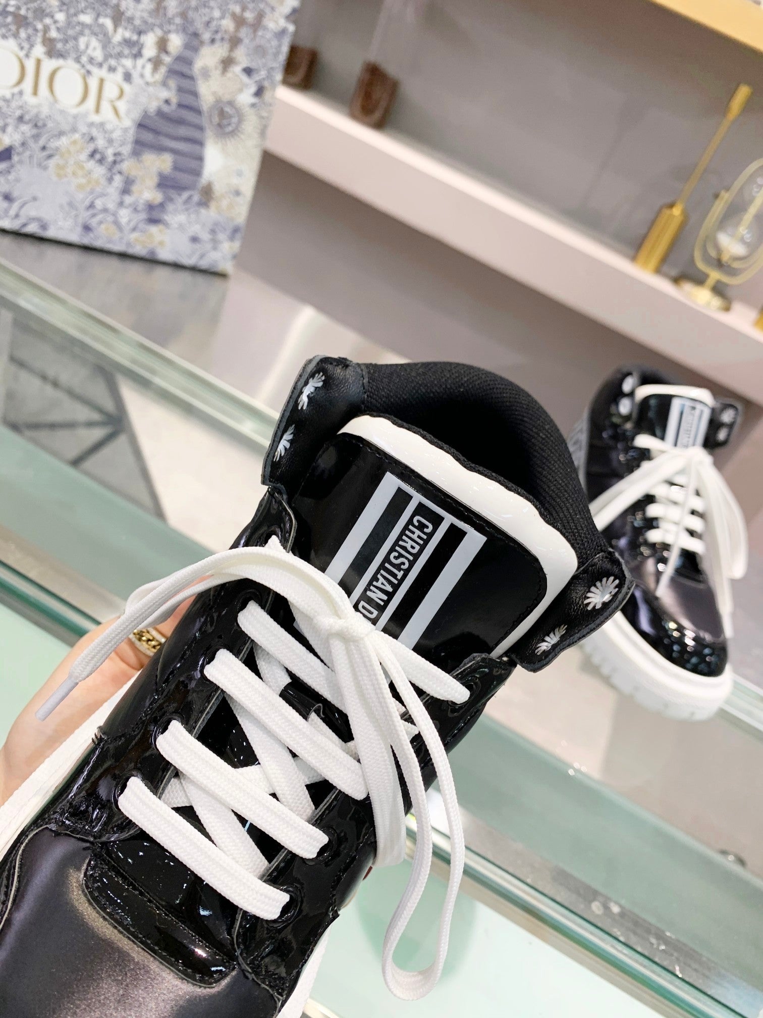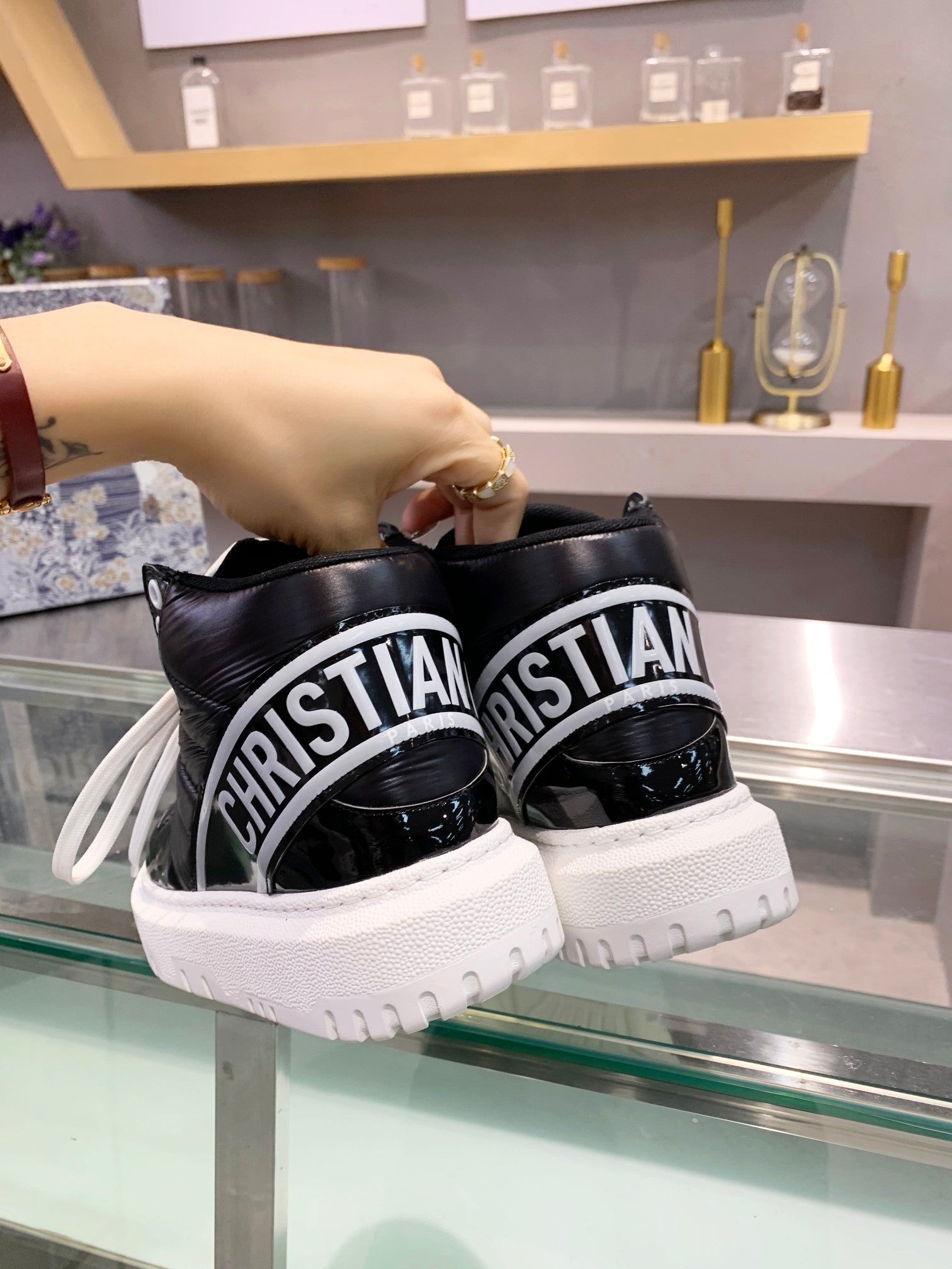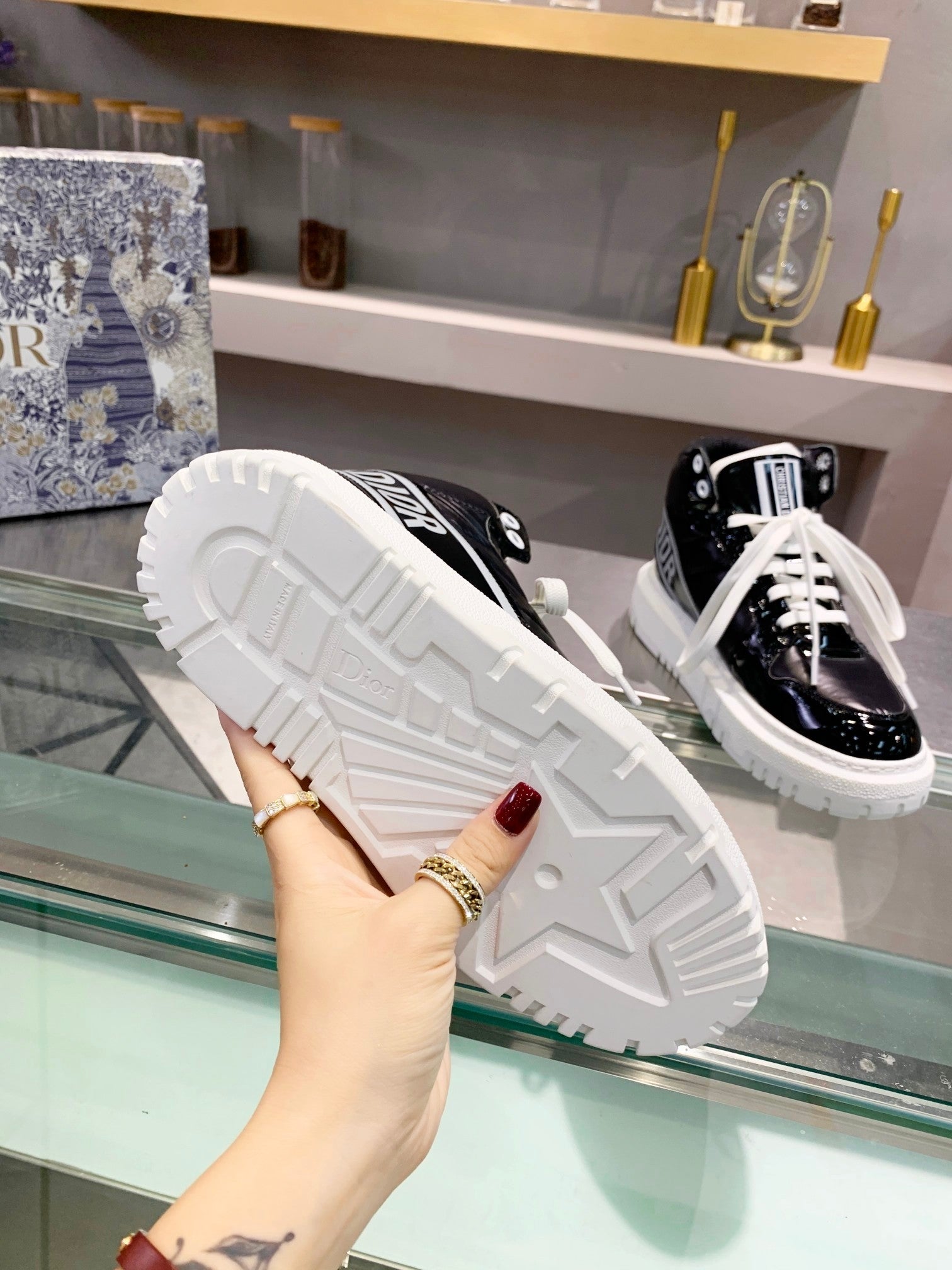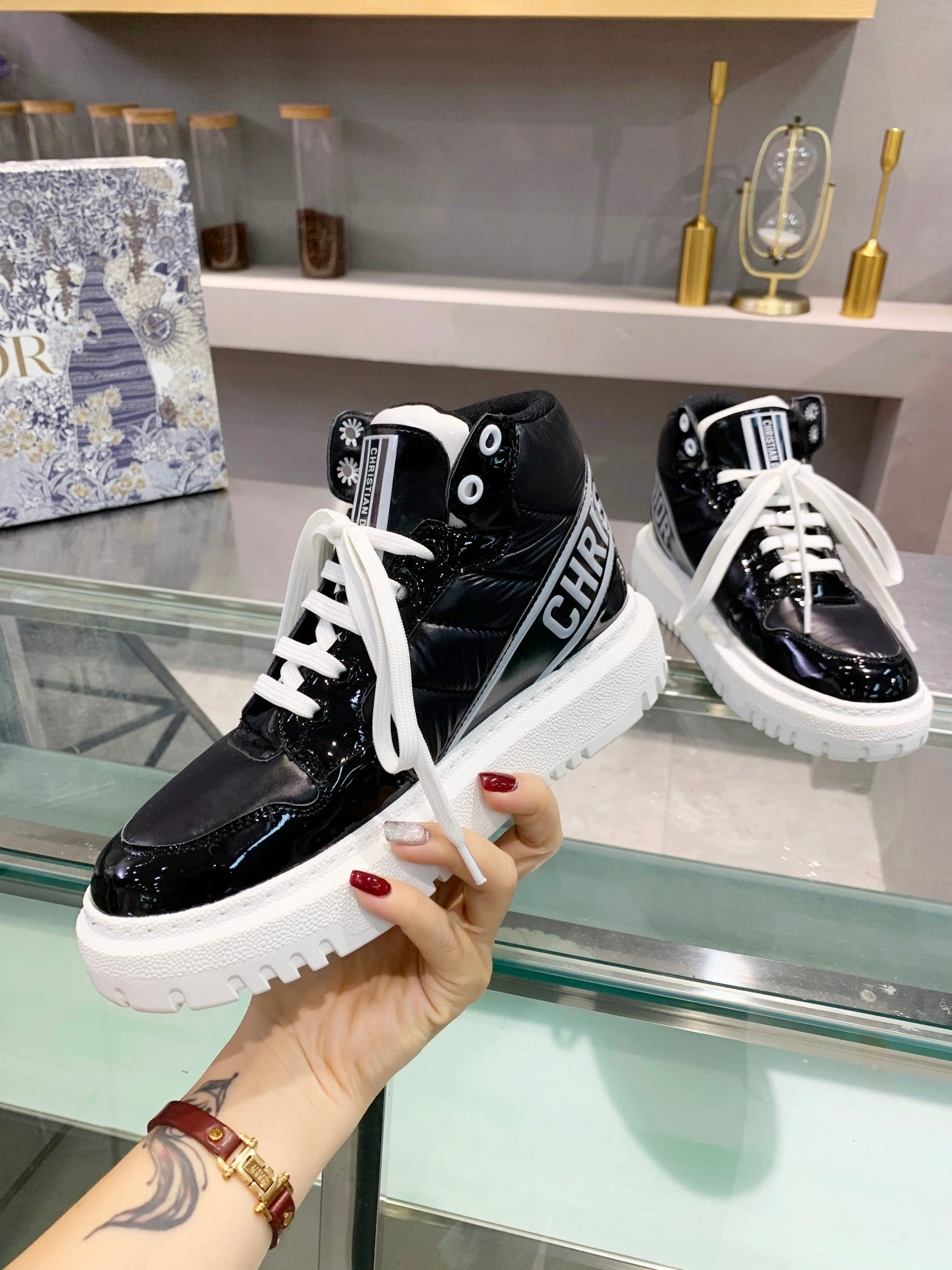 [Dior] New Dior high-top sneakers. ๐บ Made of windproof and waterproof down, this is a super warm winter item! The sole is Dior's classic sneaker sole and is super comfortable. [Fireworks][Fireworks] It has a nice thickness for height without being bulky; it's just the right balance. ๐