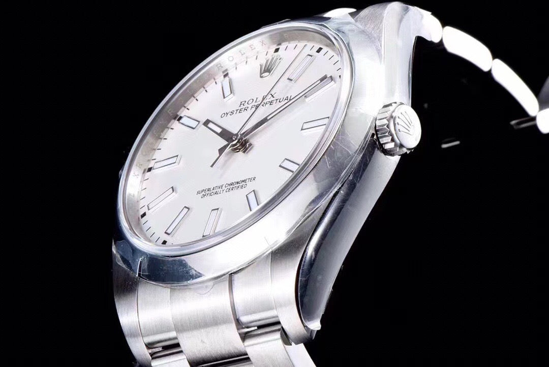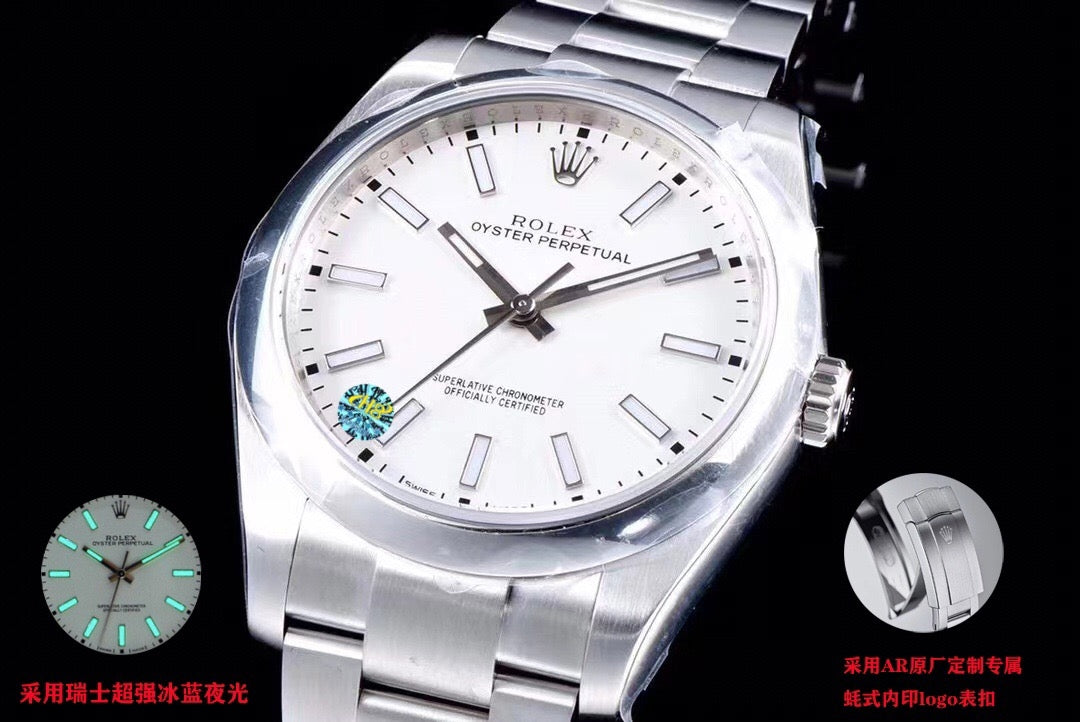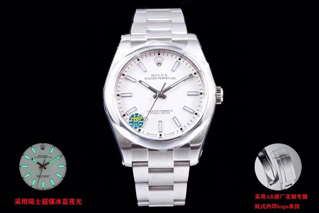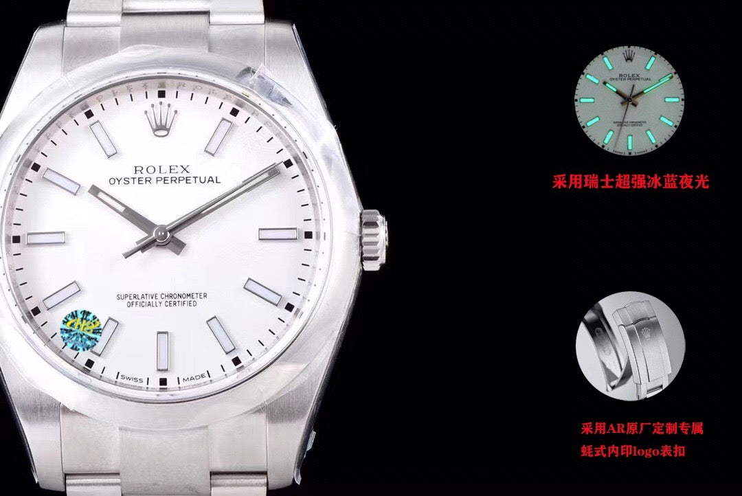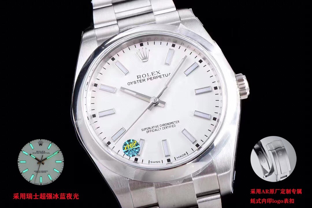 Rolex Oyster Perpetual 39 Series① Equipped with an integrated Asian movement, 28,800 vibrations per hour, 100% stable performance, accurately restoring the central time position, stable and reliable quality;② Case: Thickness almost identical to the original, only 11.3mm;③ Dial: Polished hour markers, top-grade Swiss ice blue luminescence, delicate background texture, color matching the original;④ Glass: Highly transparent sapphire crystal; logo on the correct layer of the anti-counterfeit mark!⑤ Strap: Restored and interchangeable; AR same-quality 904L strap;N+AR is definitely a premium product, every exquisite detail is a sincere effort developed by the factory craftsmen.