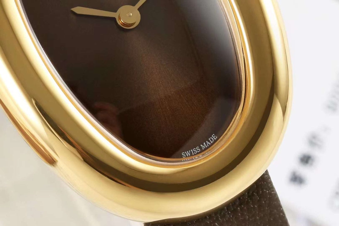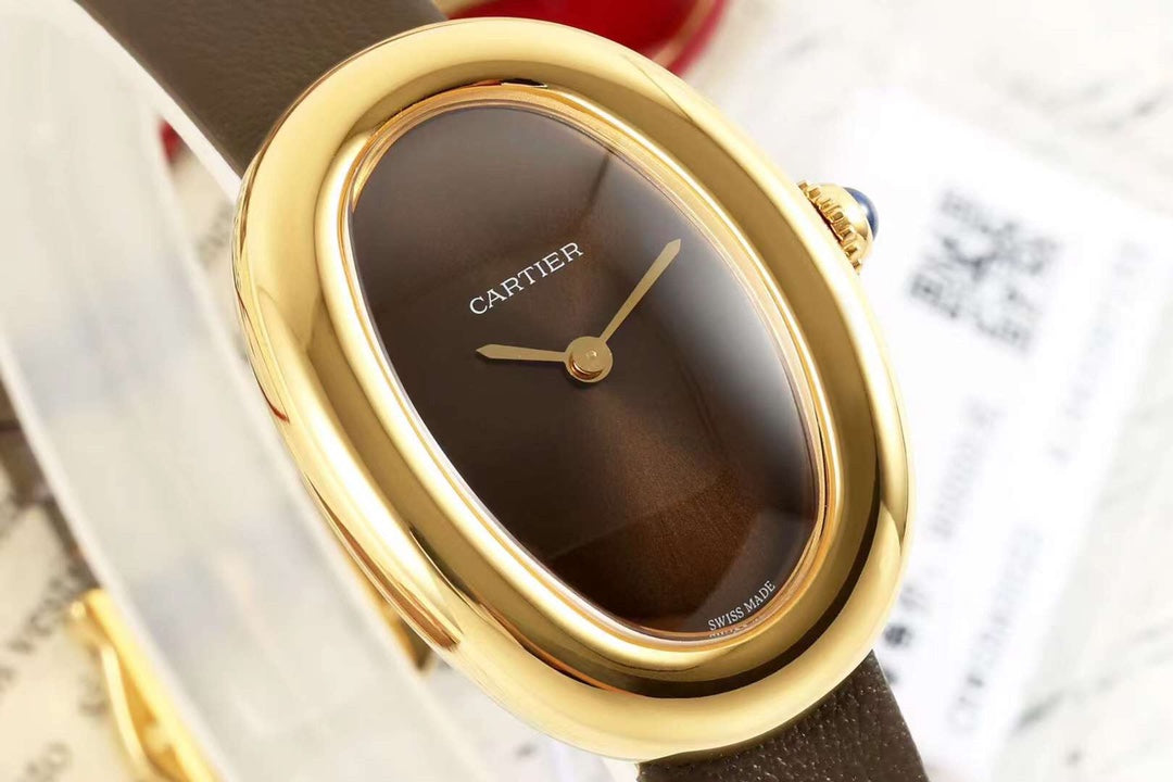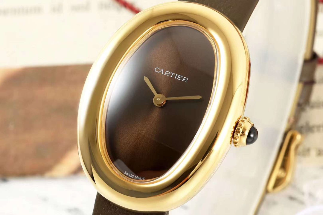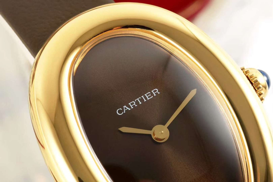 The Baignoire de Cartier watch, available in diamond-set and aperture versions, features an oval case set with 42 brilliant-cut diamonds and a beaded crown set with a cabochon diamond. It features a Swiss quartz movement, a silver-plated dial with Roman numerals, sword-shaped blued steel hands, and a curved sapphire crystal. The details are exquisite!